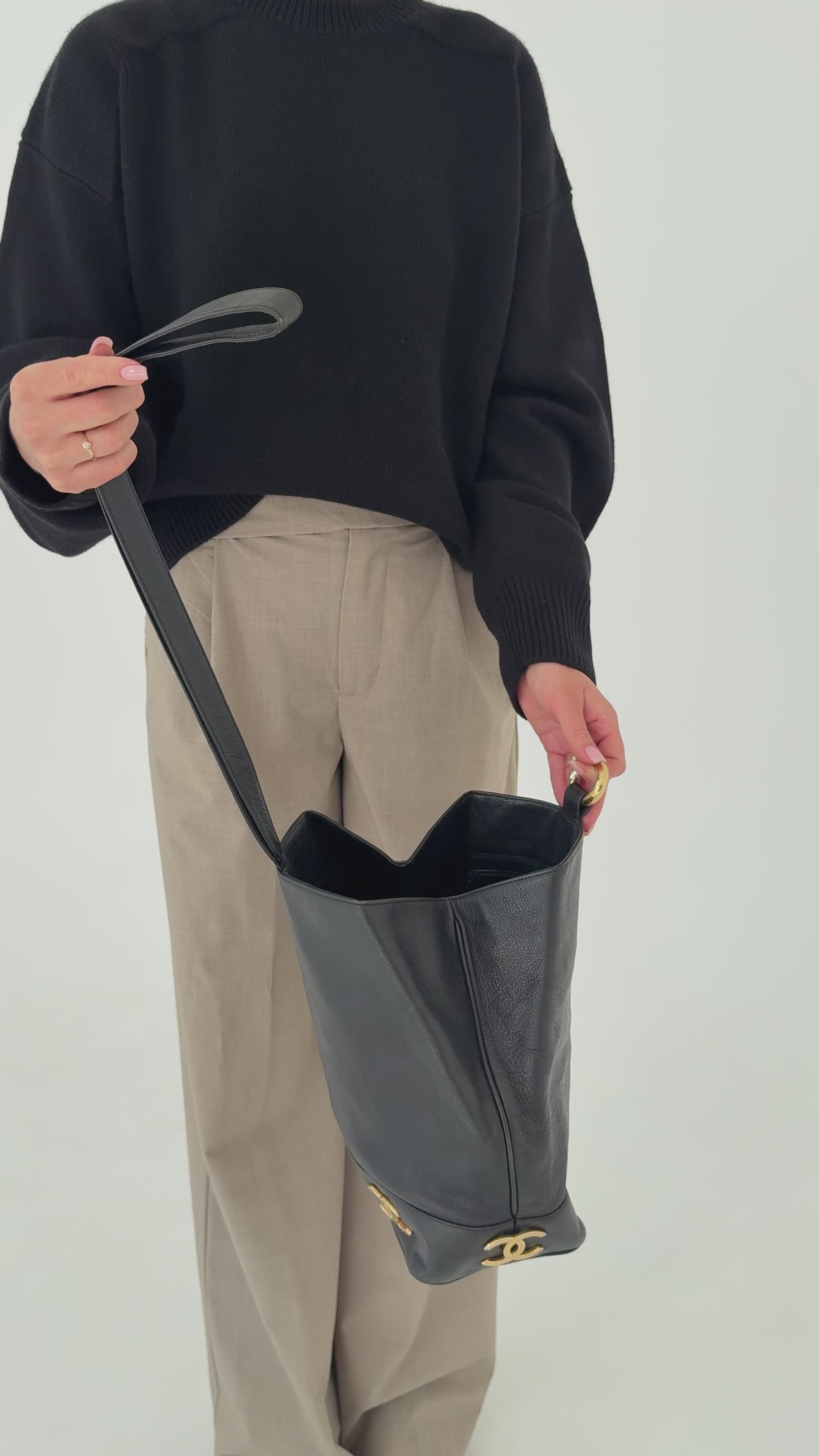 Elegancka torebka bucket z kultowej kolekcji Chanel, wykonana ze skóry caviar z charakterystycznym ziarnistym wykończeniem i złotymi zdobieniami CC na jej podstawie.