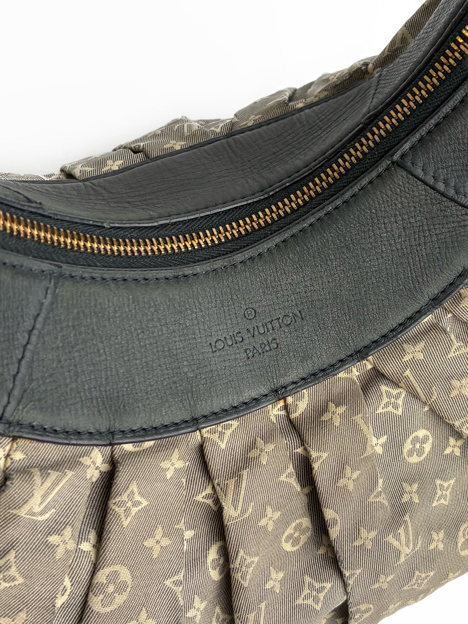 Elegancka torebka typu hobo w delikatnym kolorze khaki z charakterystycznym miniaturowym wzorem Monogram Idylle, wykonana z połączenia płótna i naturalnej skóry.