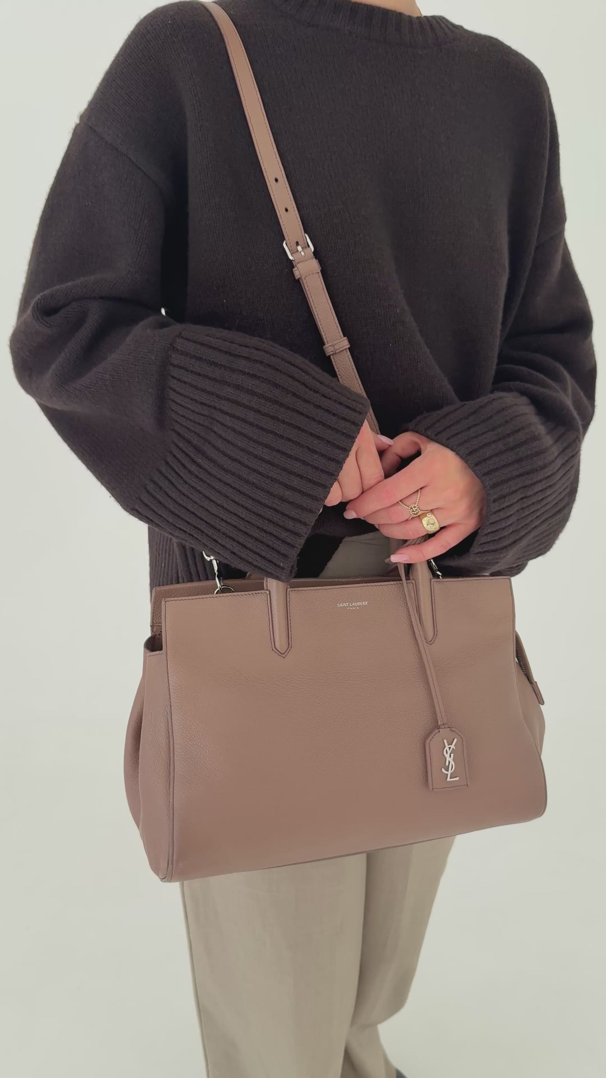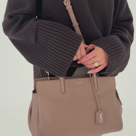Elegancka torebka Saint Laurent w ciepłym odcieniu taupe, wykonana z miękkiej ziarnistej skóry naturalnej.