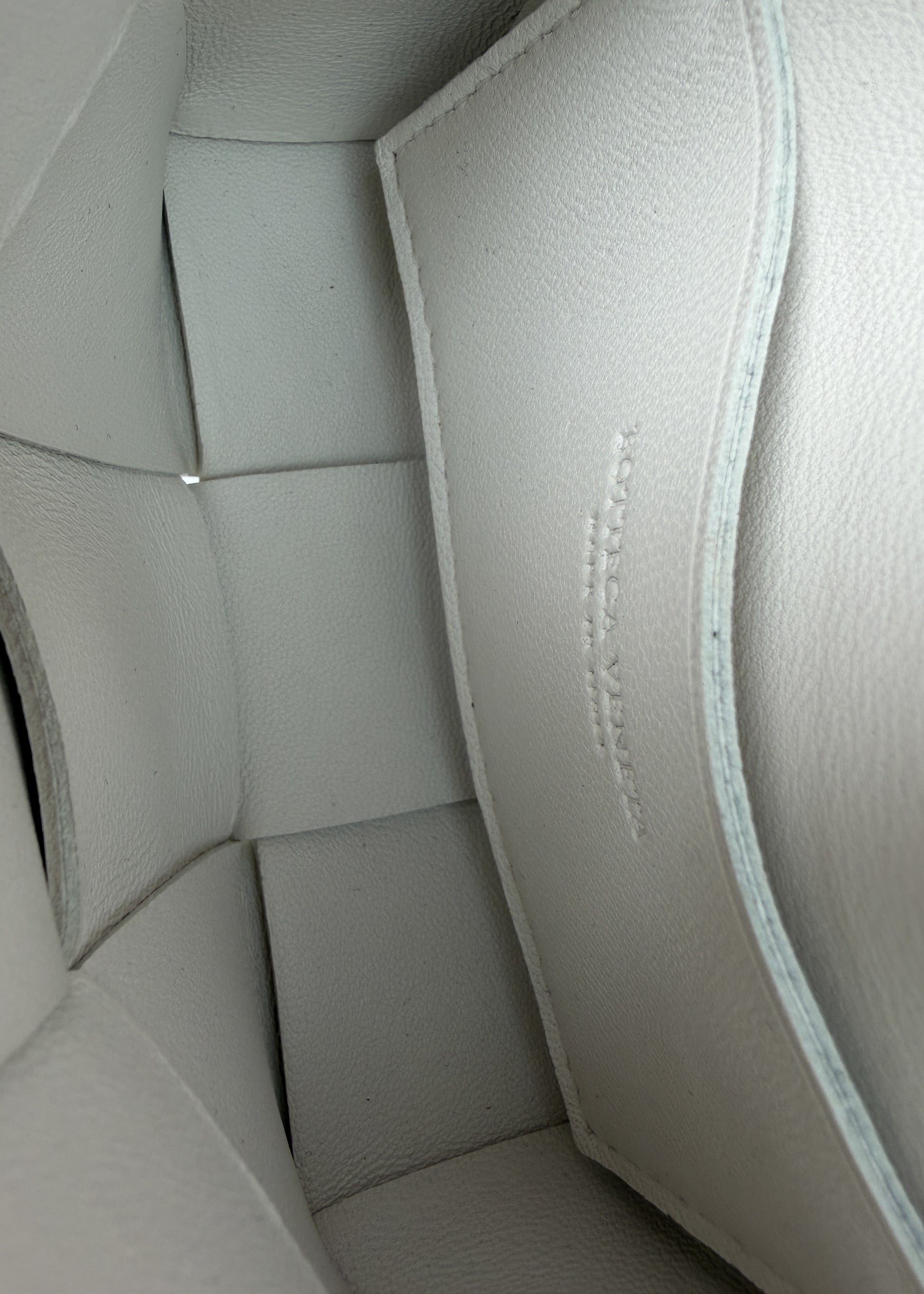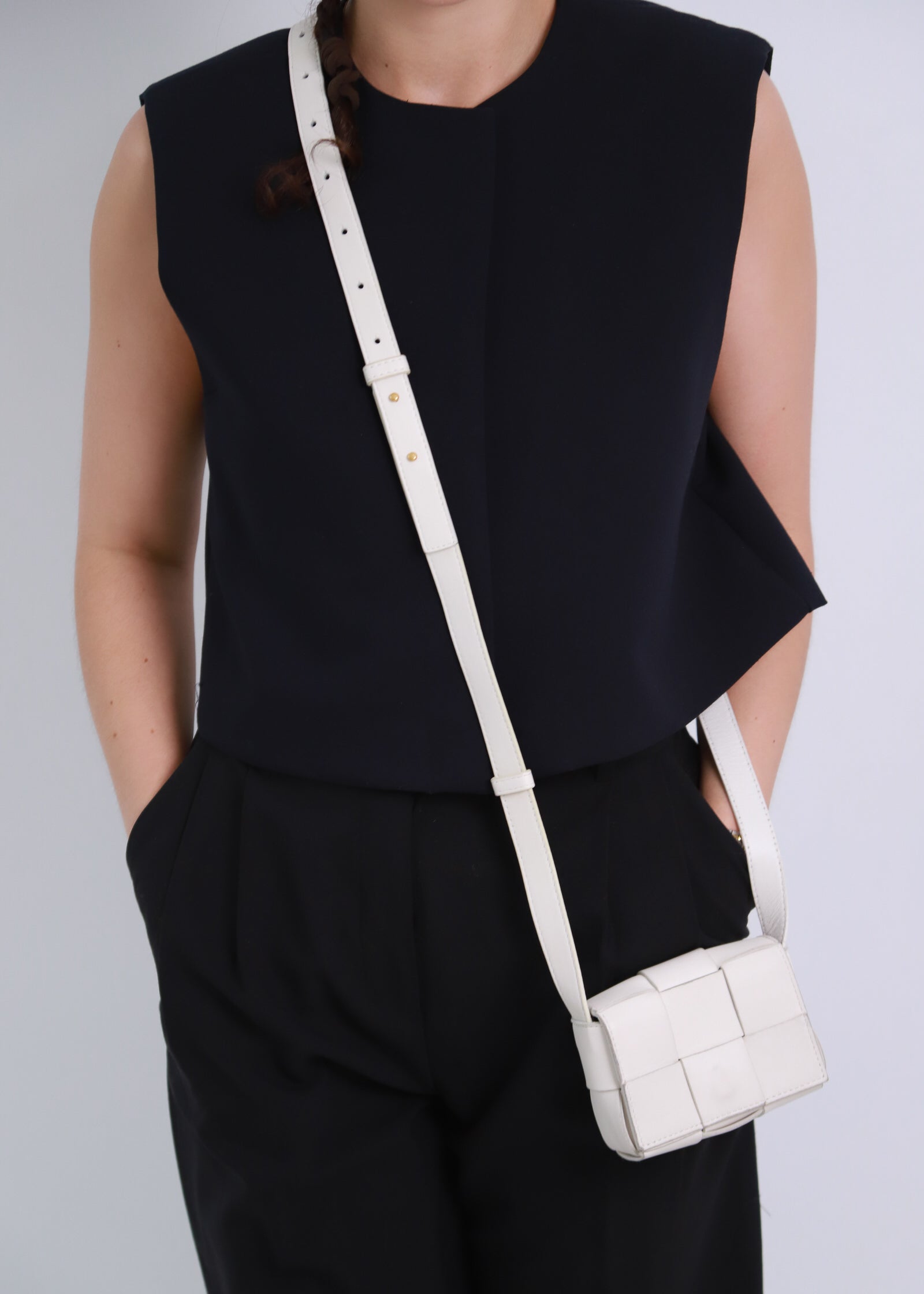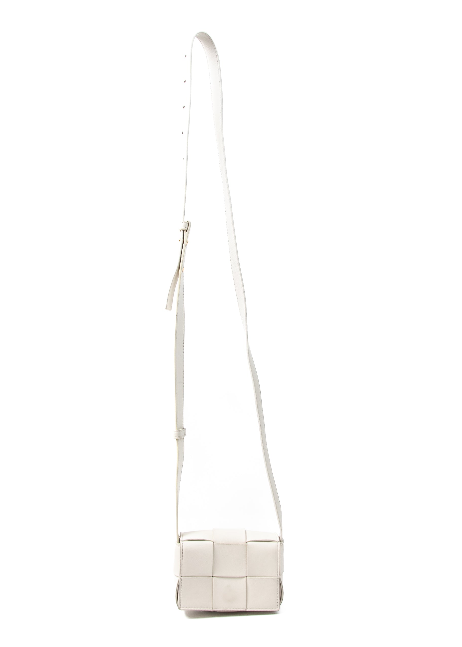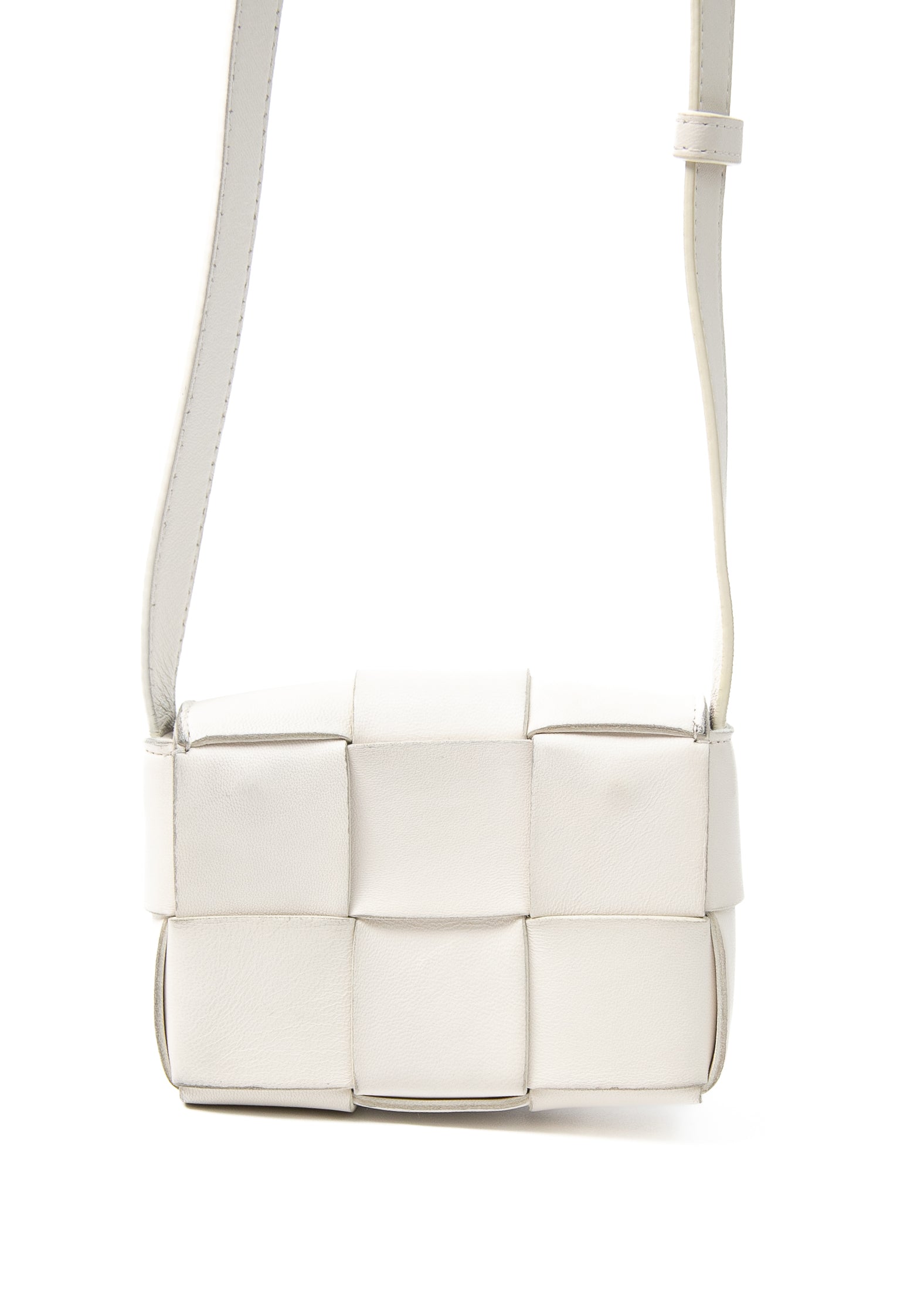 Ten model to Mini Cassette – wersja na długim, regulowanym pasku, w całości zbudowana z szerokich, ręcznie przeplatanych pasów skóry. Klasyczna Bottega: forma, faktura i czystość projektu.