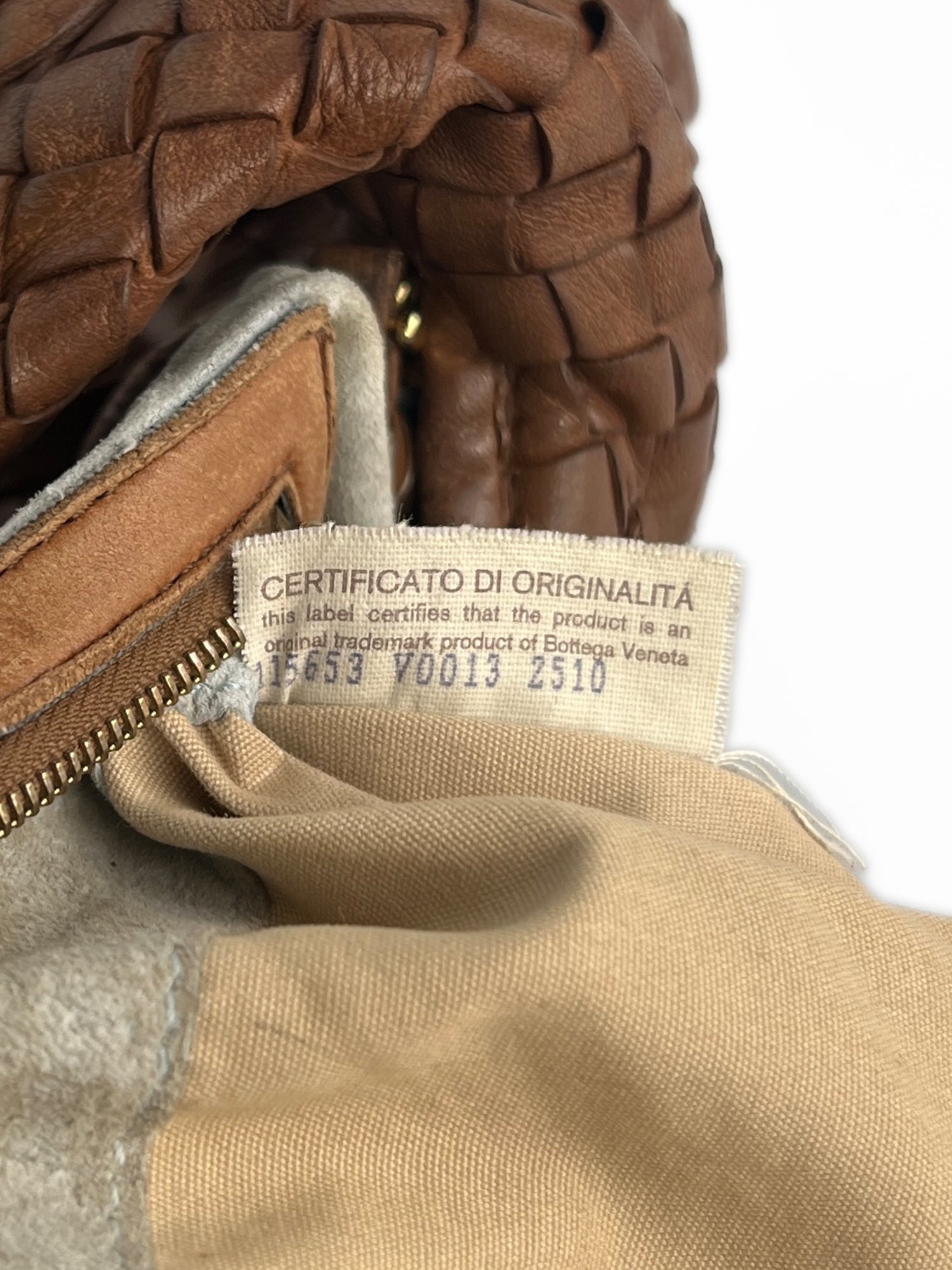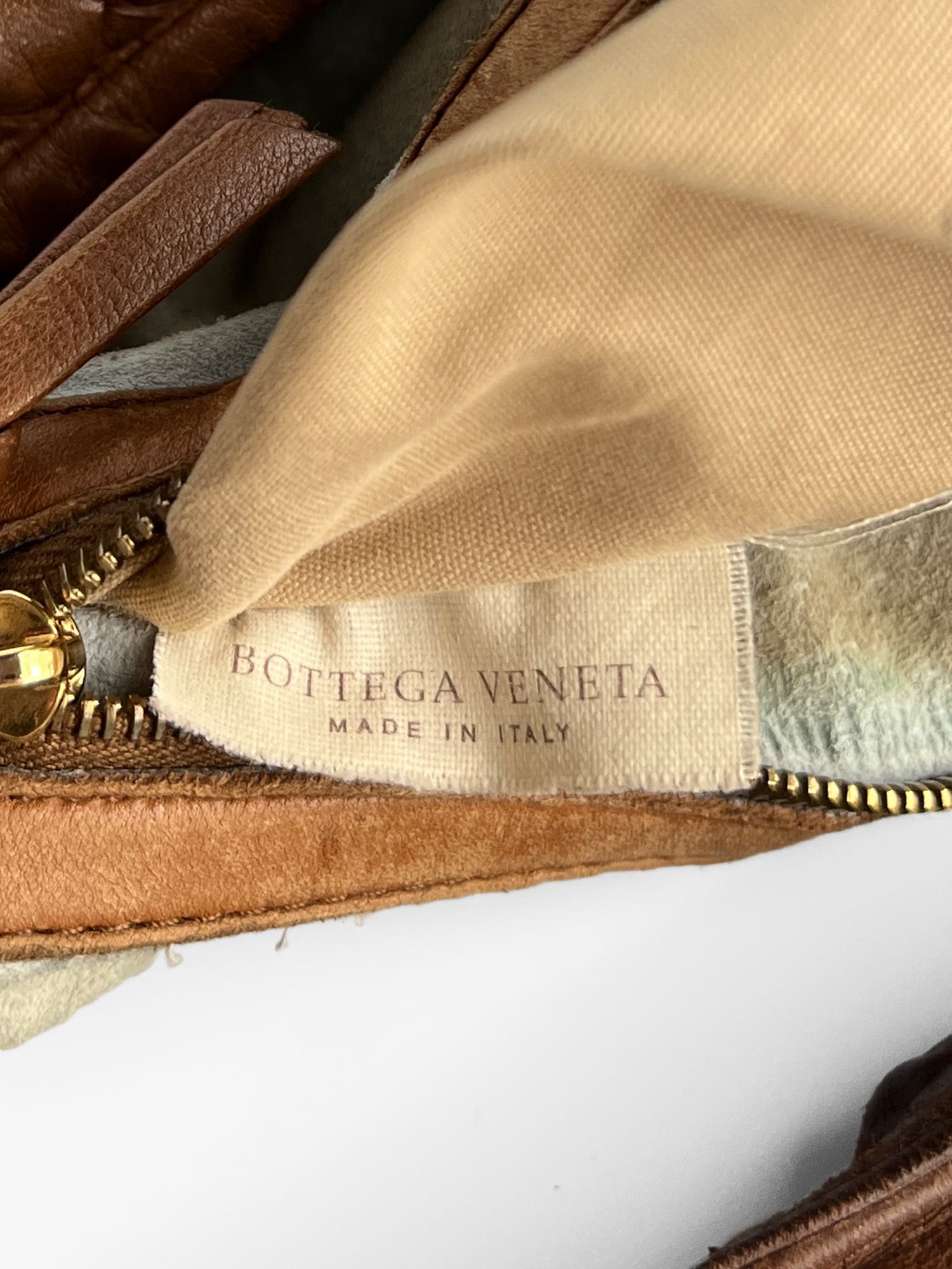 Klasyczna torebka w kolorze brązowym, wykonana w charakterystycznej, ikonicznej technice Intrecciato z miękkiej skóry jagnięcej.