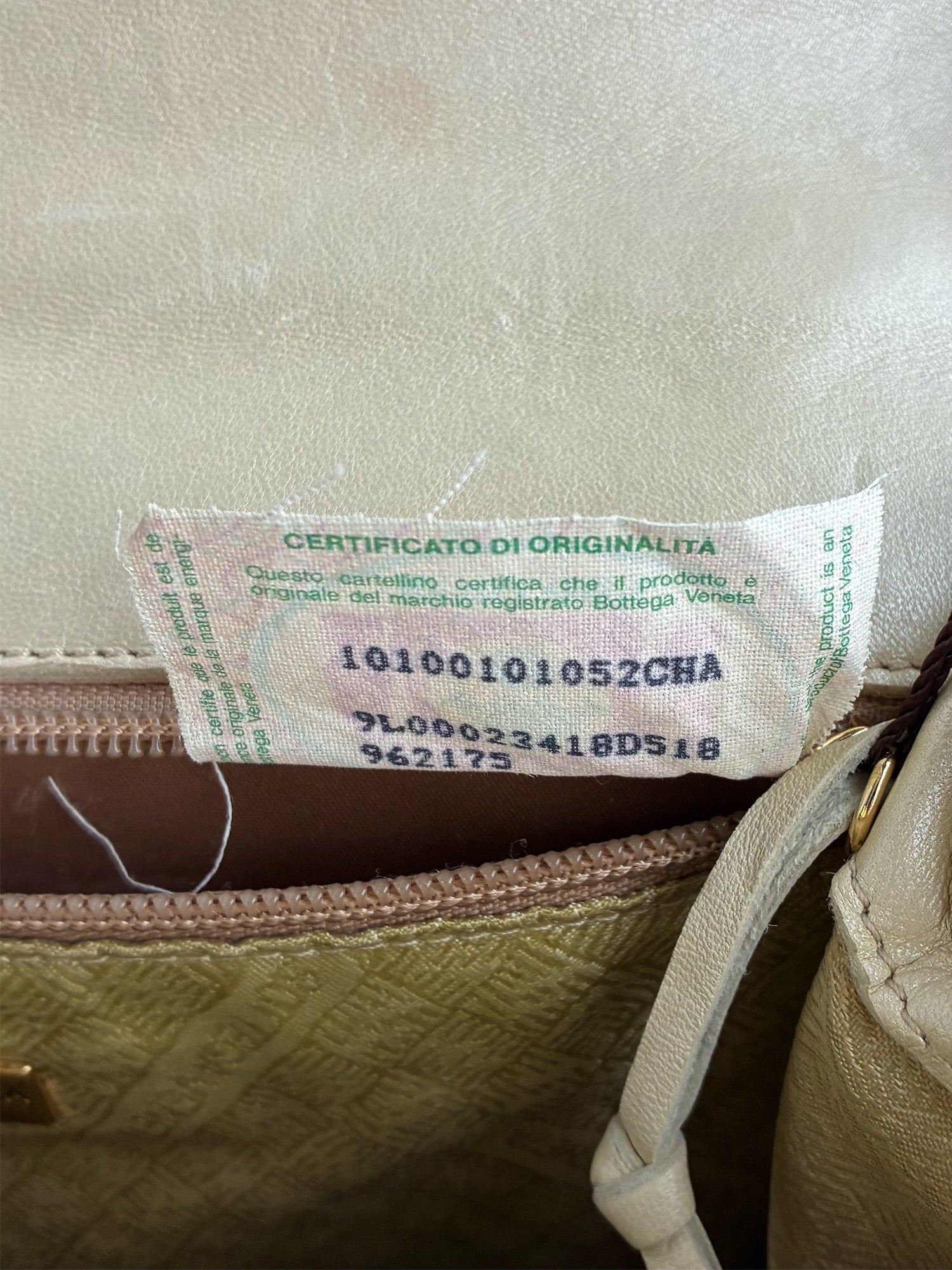- Podszewka materiałowa w beżowo-złotym odcieniu z delikatnym wzorem Bottega Veneta