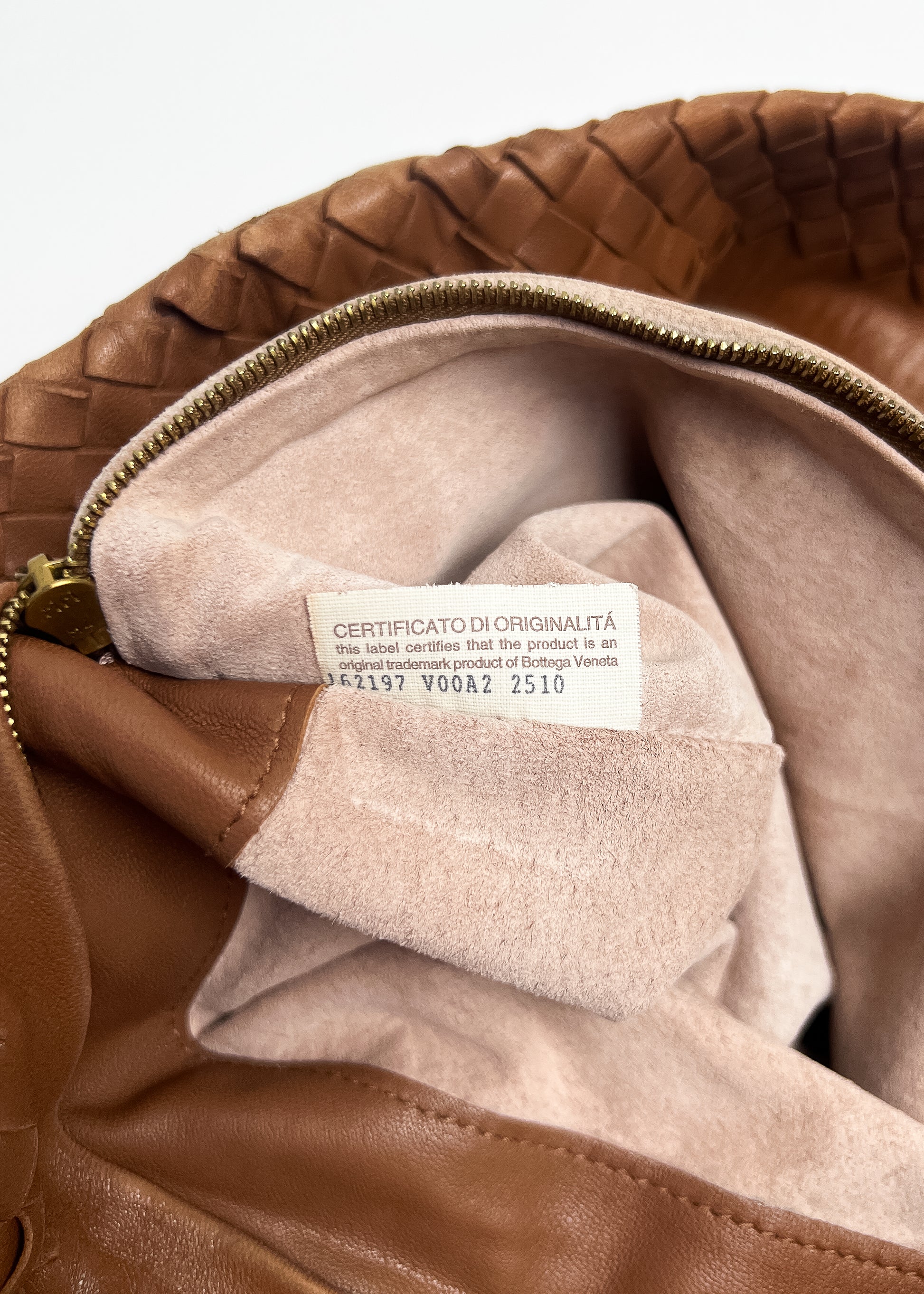 Ponadczasowa torba typu tote od Bottega Veneta, wykonana z miękkiej cielęcej skóry w charakterystycznym splocie Intrecciato w odcieniu ciepłego karmelu.