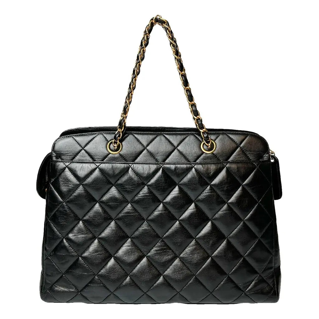 Kultowa torebka Chanel Matelasse w czarnej skórze jagnięcej z charakterystycznym pikowaniem i złotymi detalami.