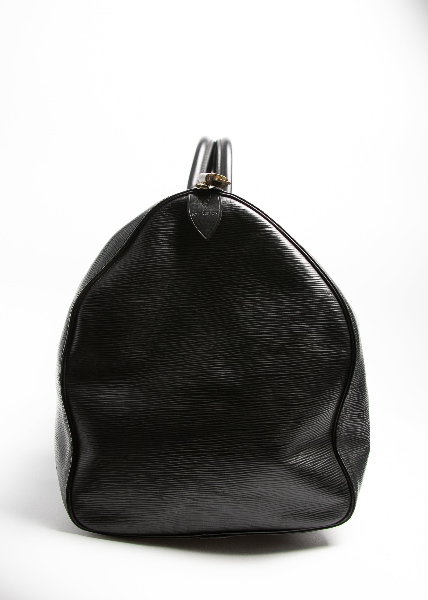 Ponadczasowa torba podróżna Louis Vuitton Keepall 55 w wersji z czarnej skóry Epi, stanowiącej elegancką i dyskretną alternatywę dla klasycznego monogramu.