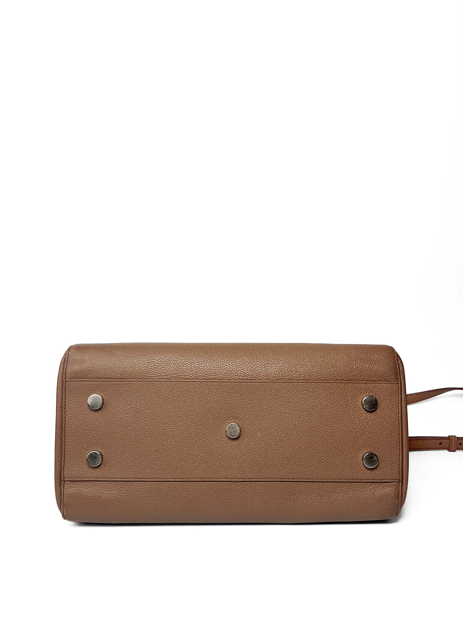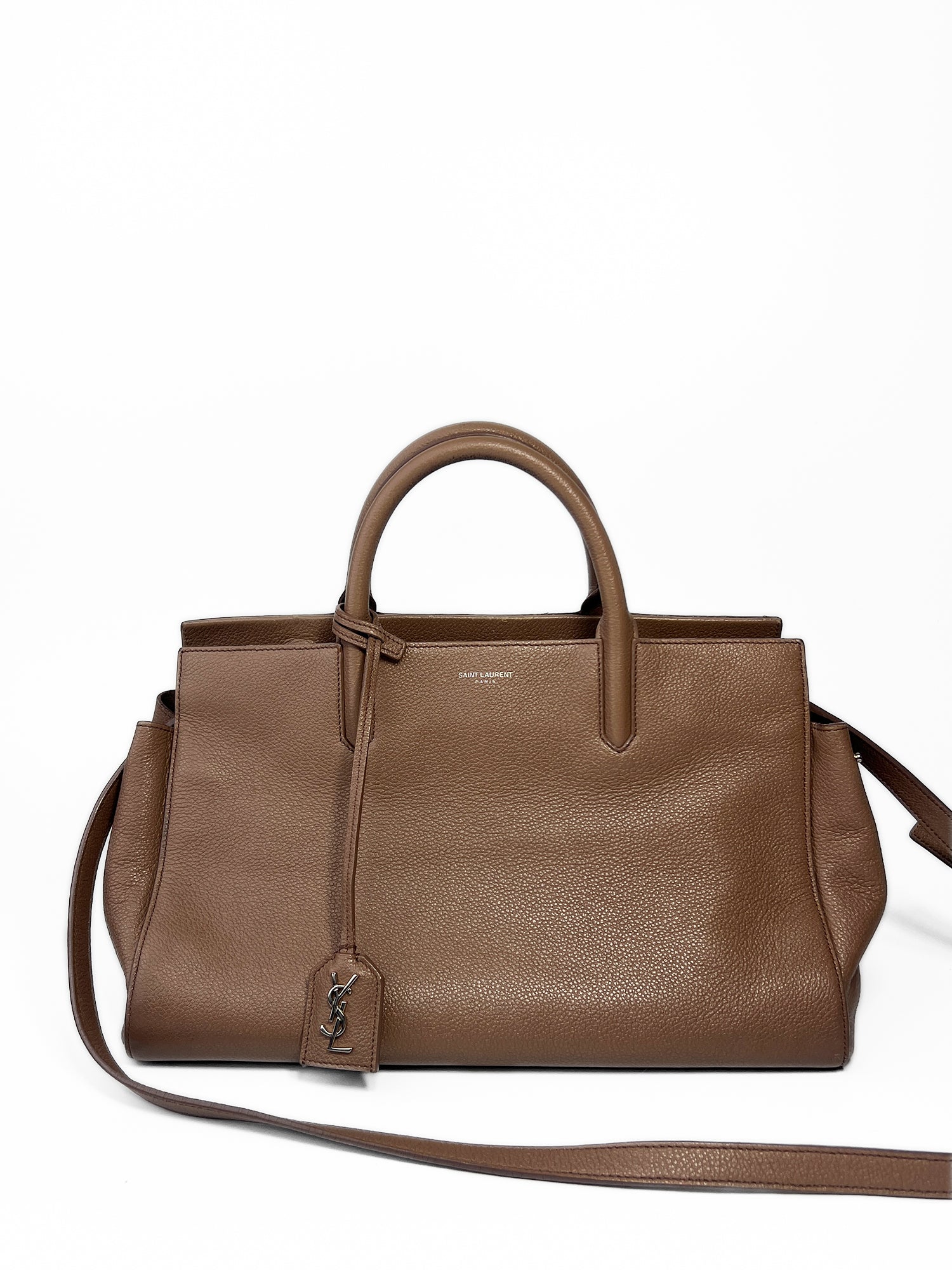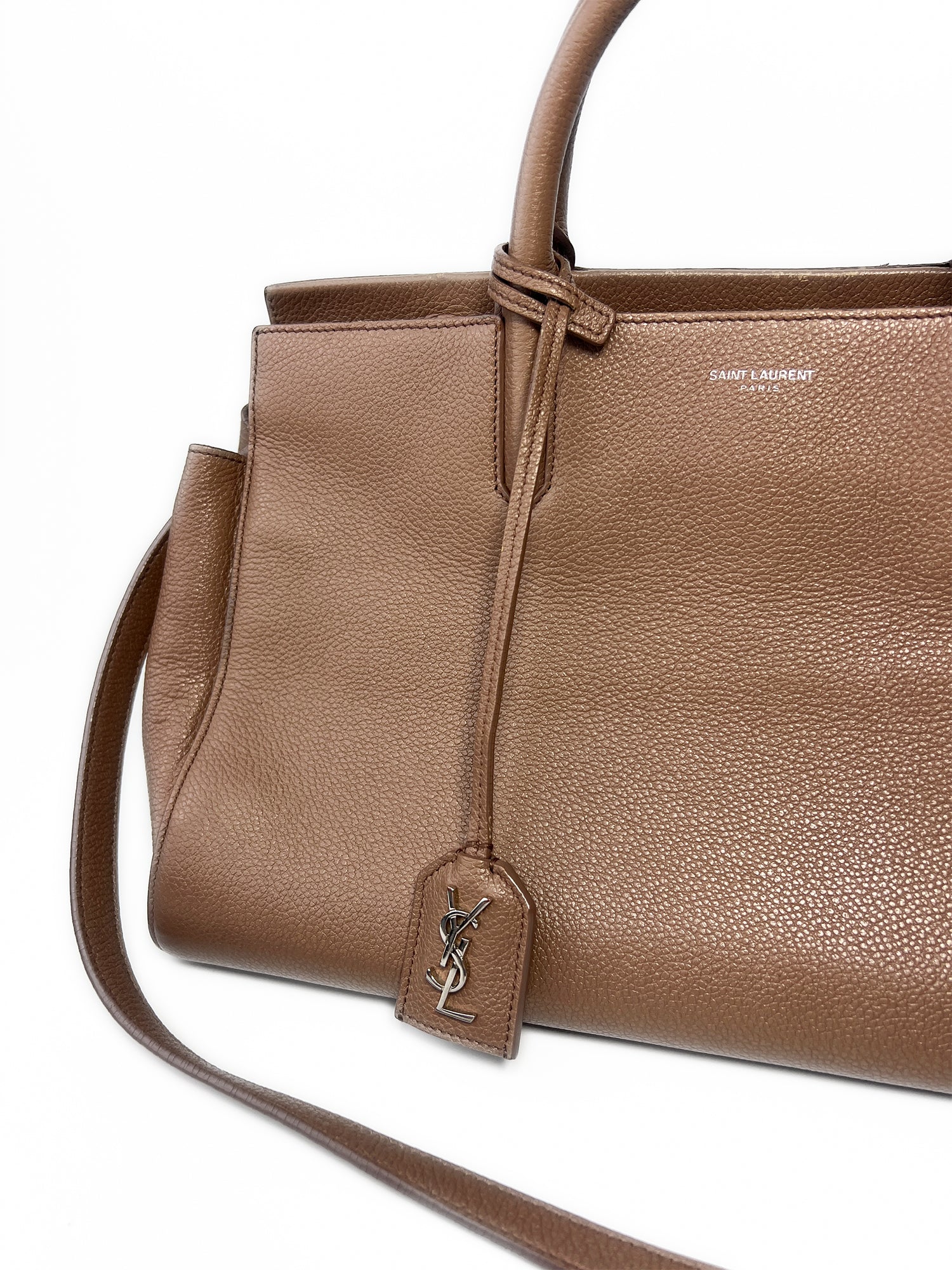Elegancka torebka Saint Laurent w ciepłym odcieniu taupe, wykonana z miękkiej ziarnistej skóry naturalnej.