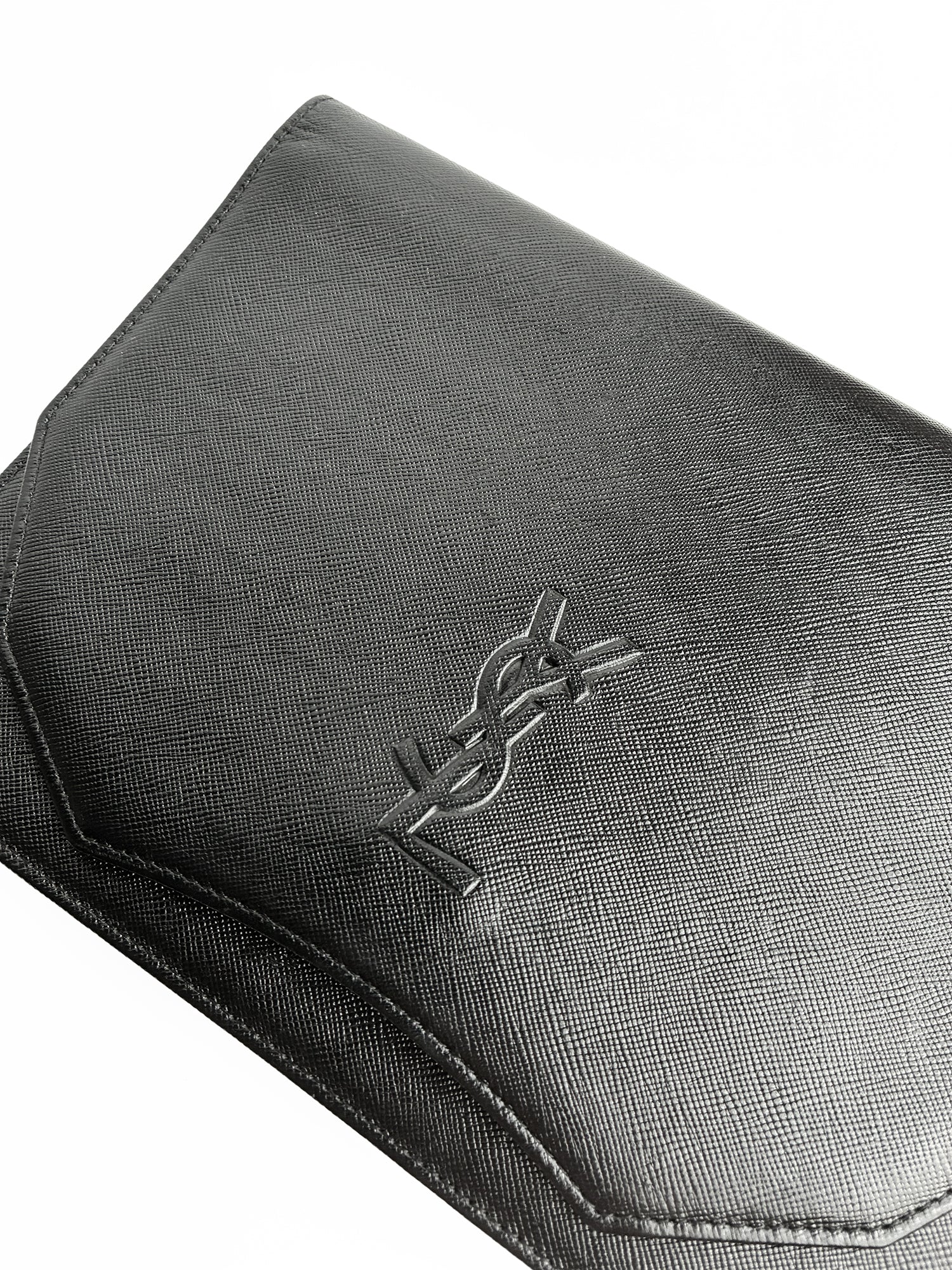 Elegancka kopertówka Yves Saint Laurent w klasycznej czarnej kolorystyce, wykonana z teksturowanej skóry saffiano z charakterystycznym wytłoczonym monogramem YSL.