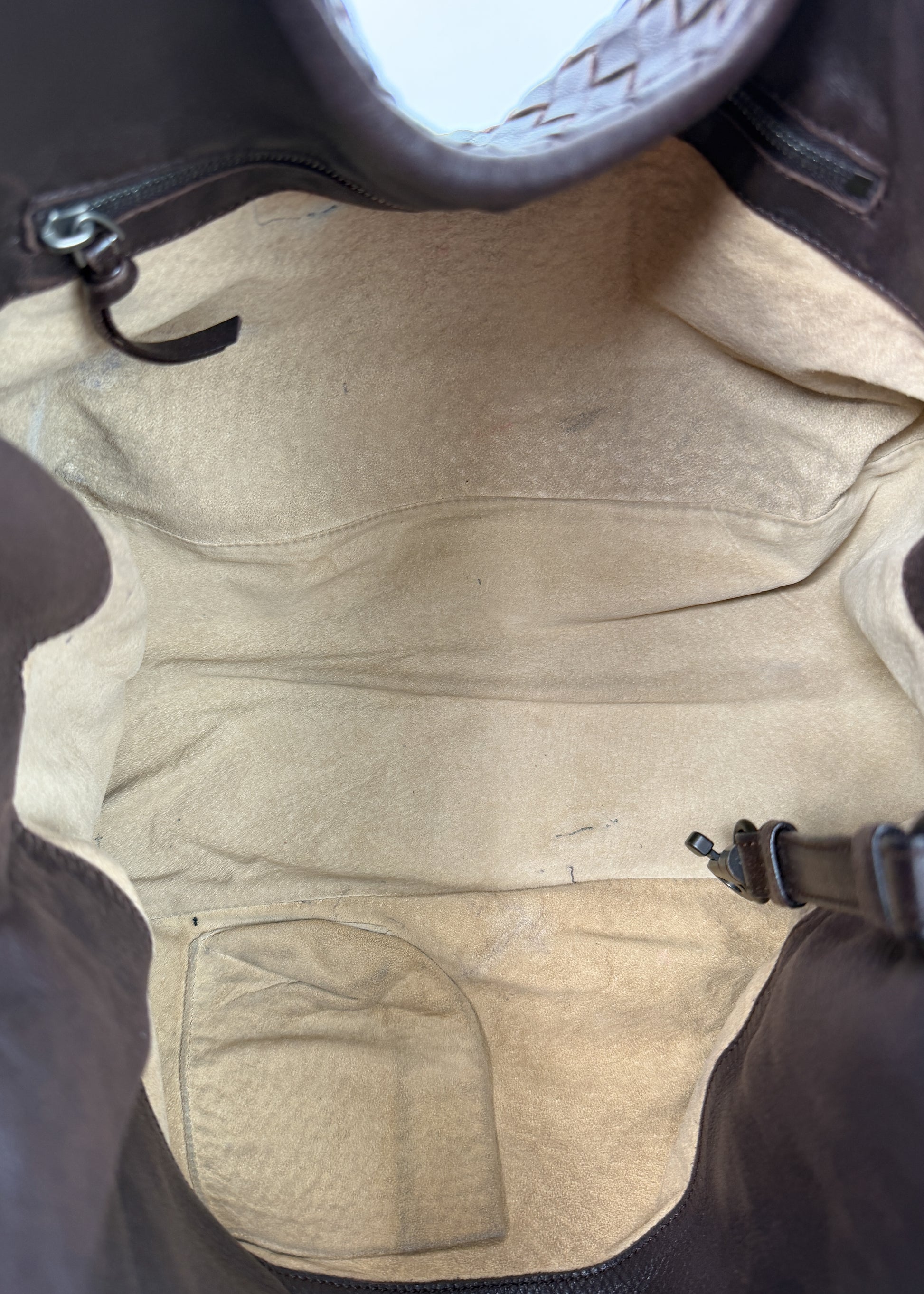 Torebka hobo Bottega Veneta w odcieniu gorzkiej czekolady, wykonana w całości ze skóry splecionej w kultowy splot intrecciato. To klasyk epoki Tomas Maiera — torba, która miała wyglądać jak „żyjąca”, dopasowująca się do ciała.