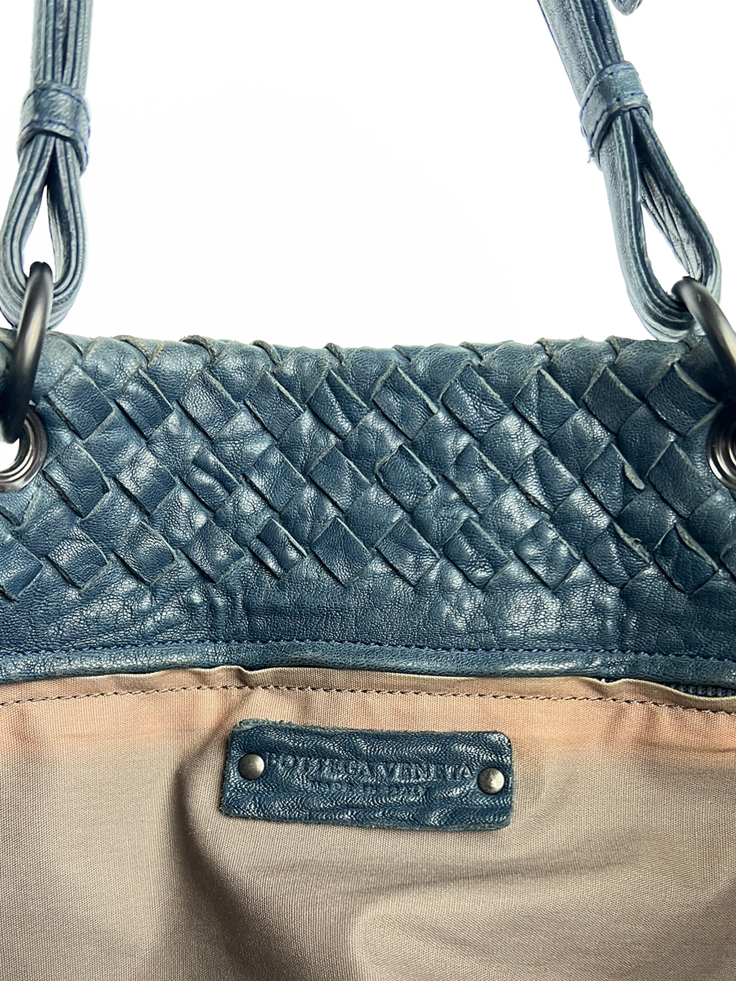 Elegancka torebka Bottega Veneta Roma w eleganckim odcieniu granatu, wykonana z miękkiej skóry nappa z charakterystycznym ręcznie plecionym wzorem intrecciato.