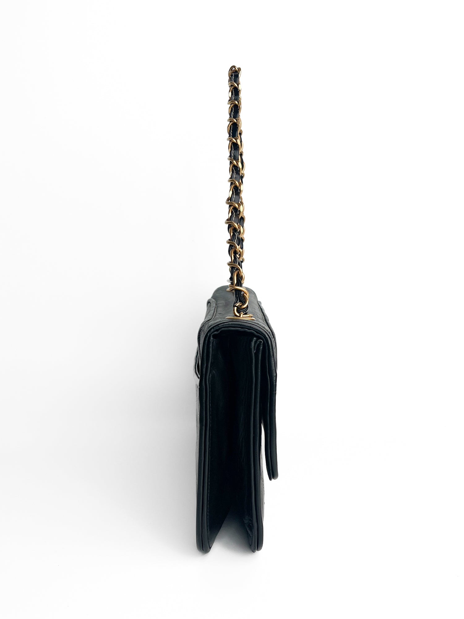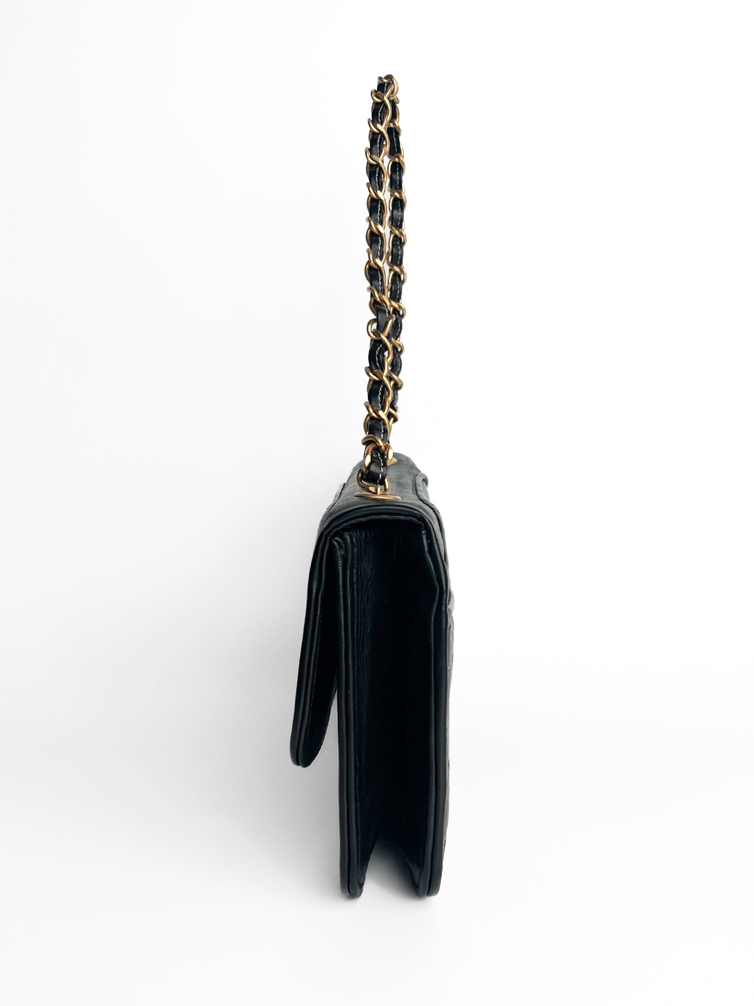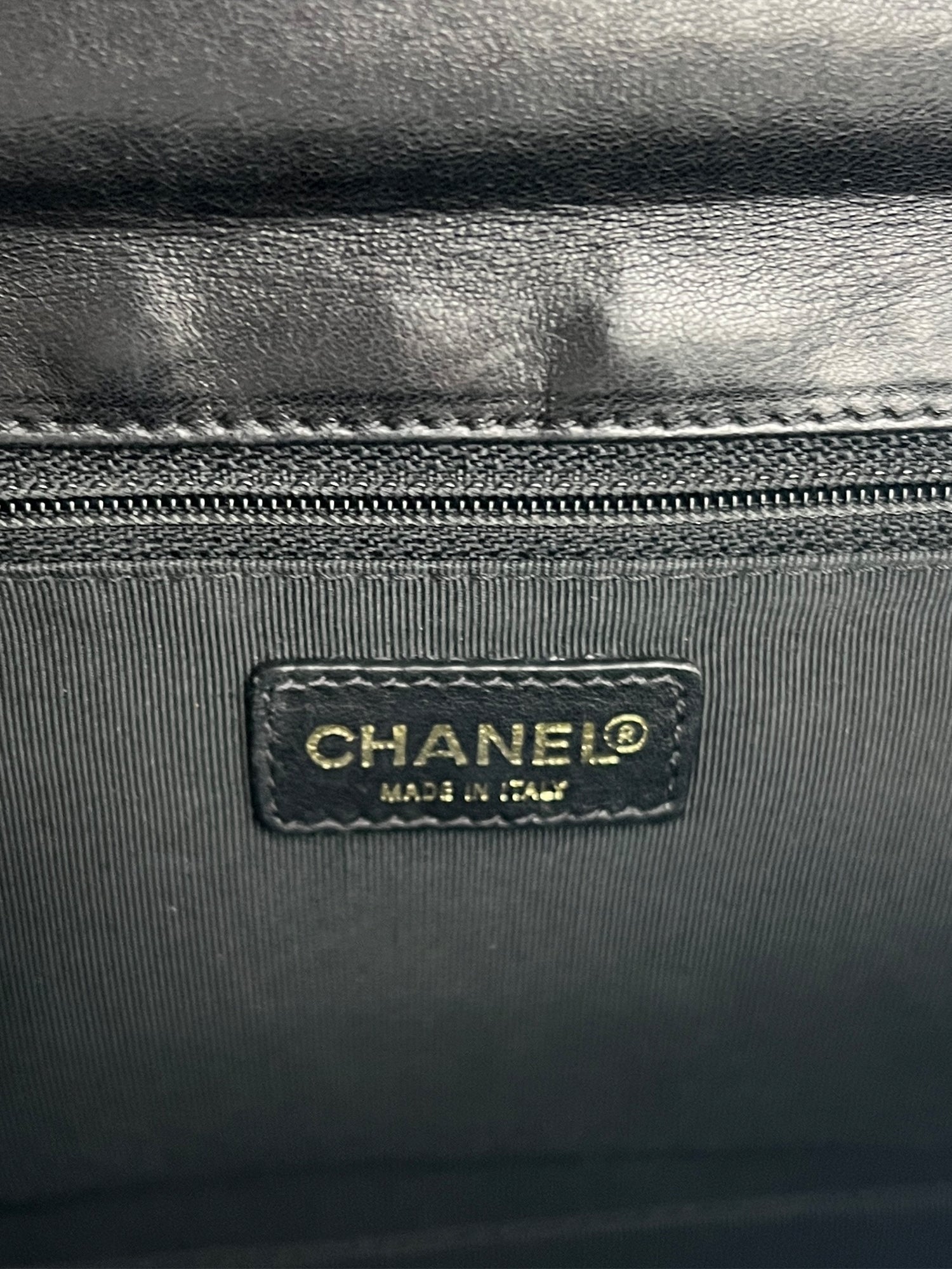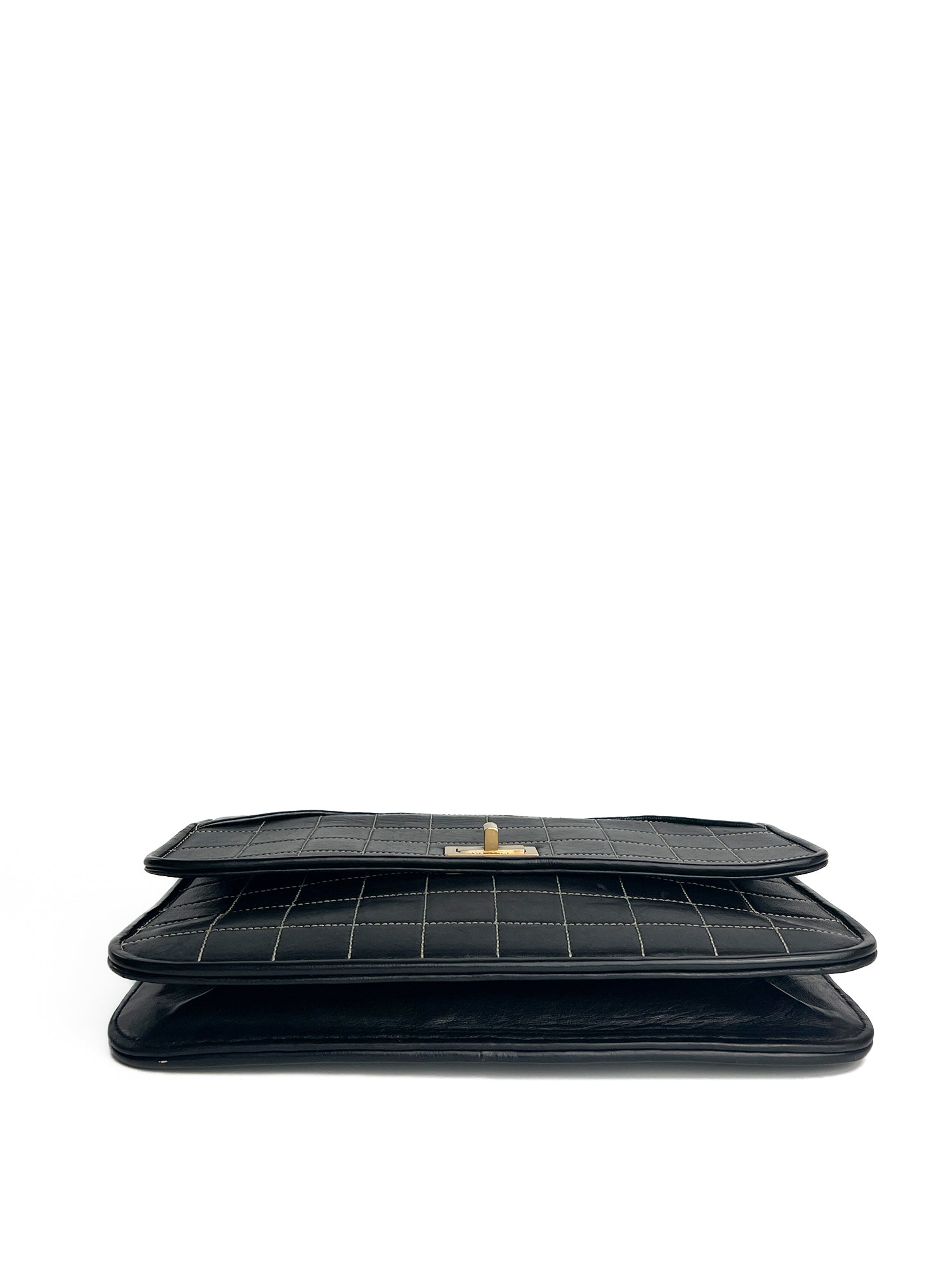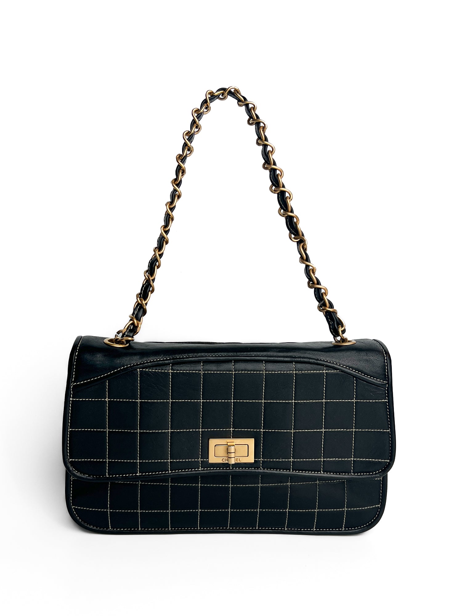 Klasyczna torebka Chanel 2.55 w eleganckiej czarnej kolorystyce z charakterystycznym wzorem typu Choco Bar.