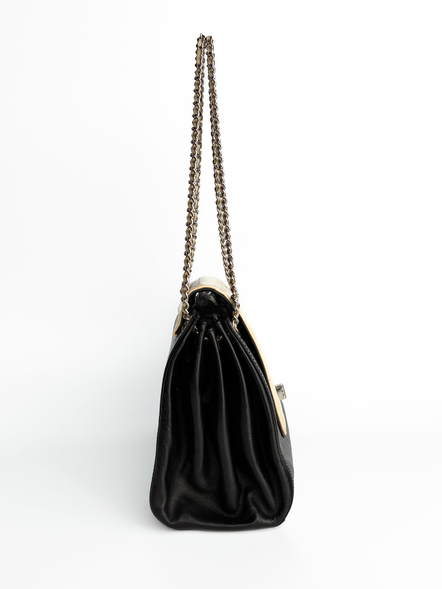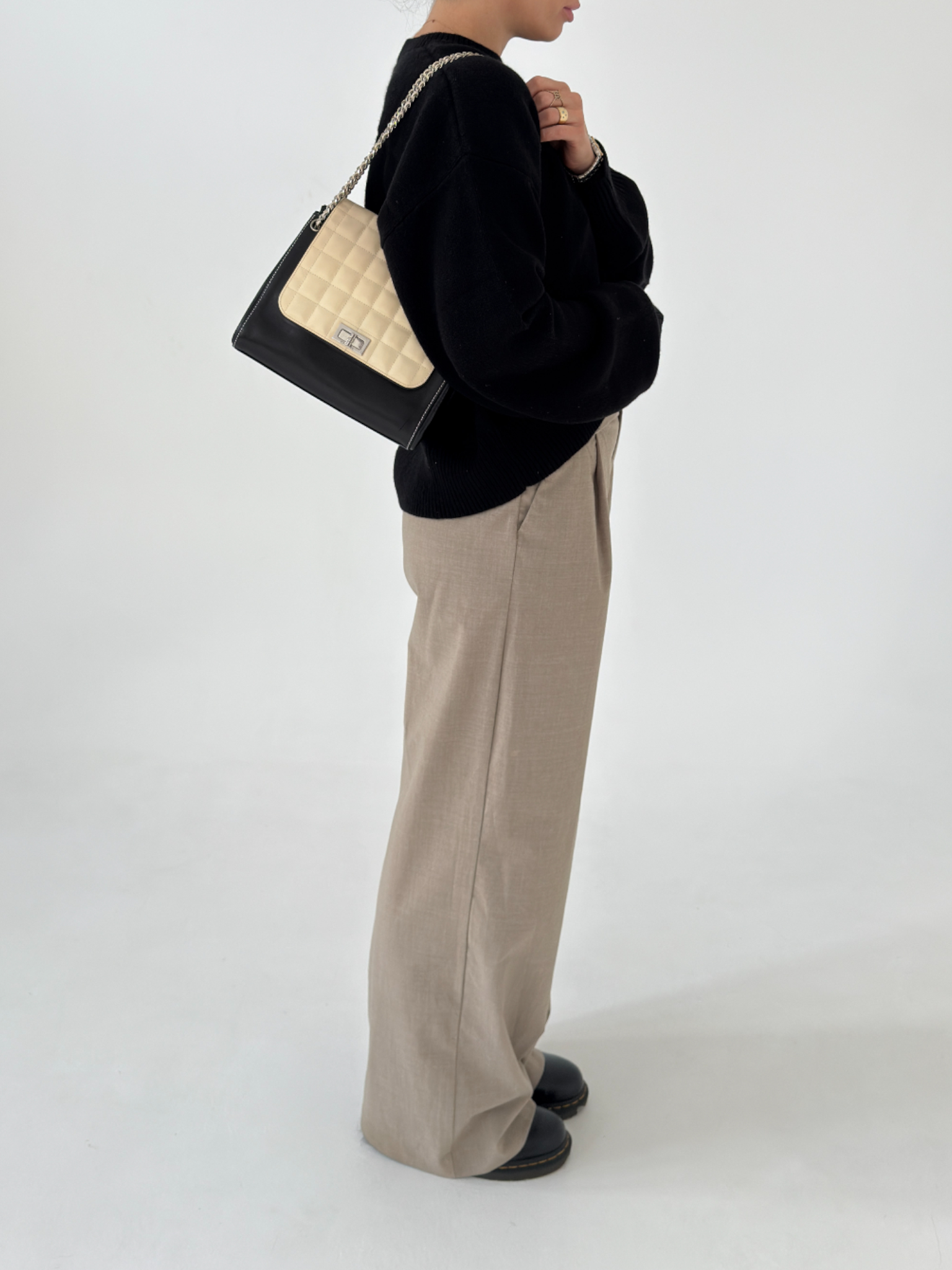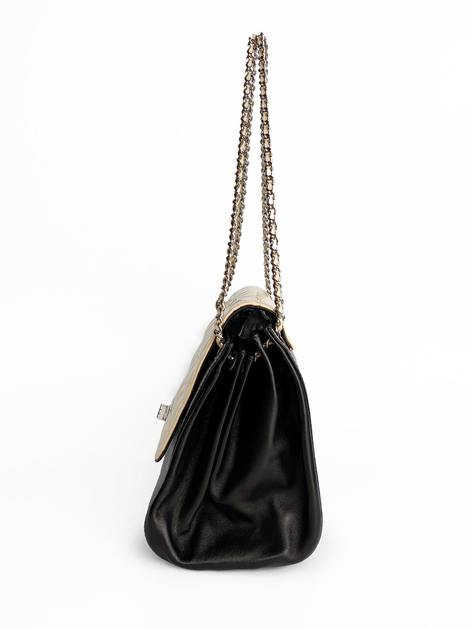 Ponadczasowa torebka Chanel w oryginalnej dwukolorowej odsłonie, łącząca elegancką czerń z subtelnym beżem, wykonana z miękkiej skóry jagnięcej z charakterystycznym pikowaniem Chocolate Bar.