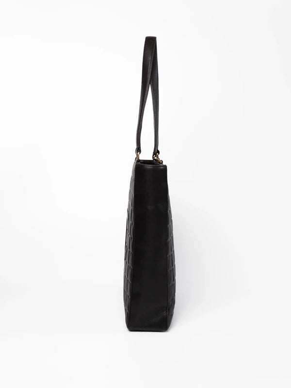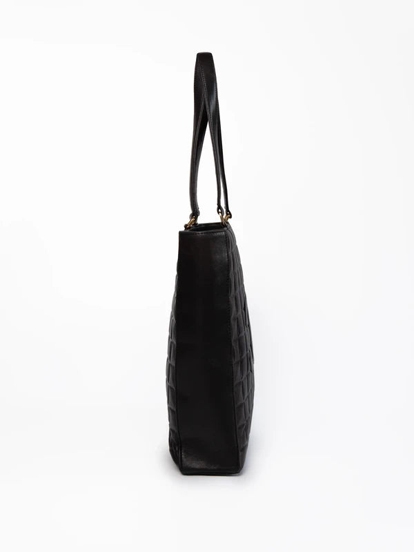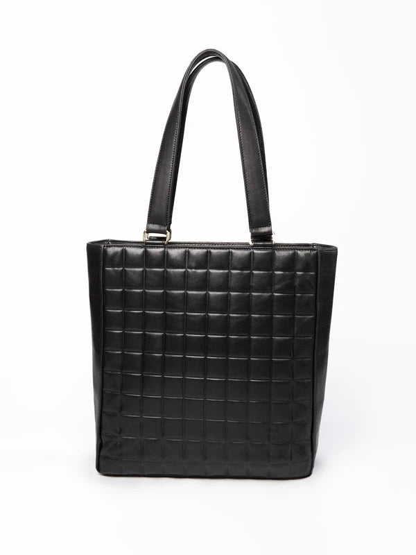 Elegancka torebka Chanel Chocolate Bar w klasycznej czarnej kolorystyce, wykonana z miękkiej skóry z charakterystycznym pikowanym wzorem przypominającym tabliczkę czekolady.
