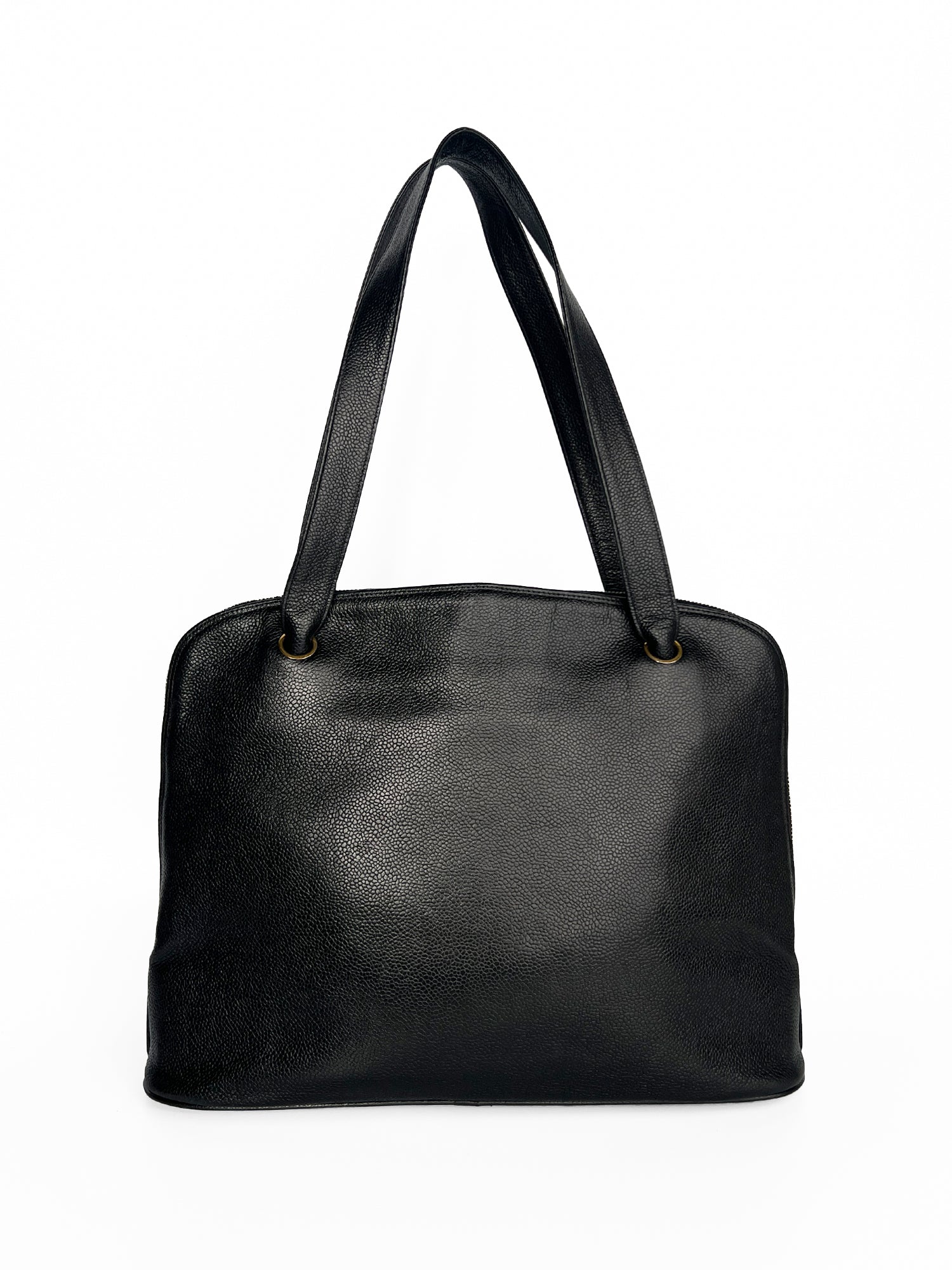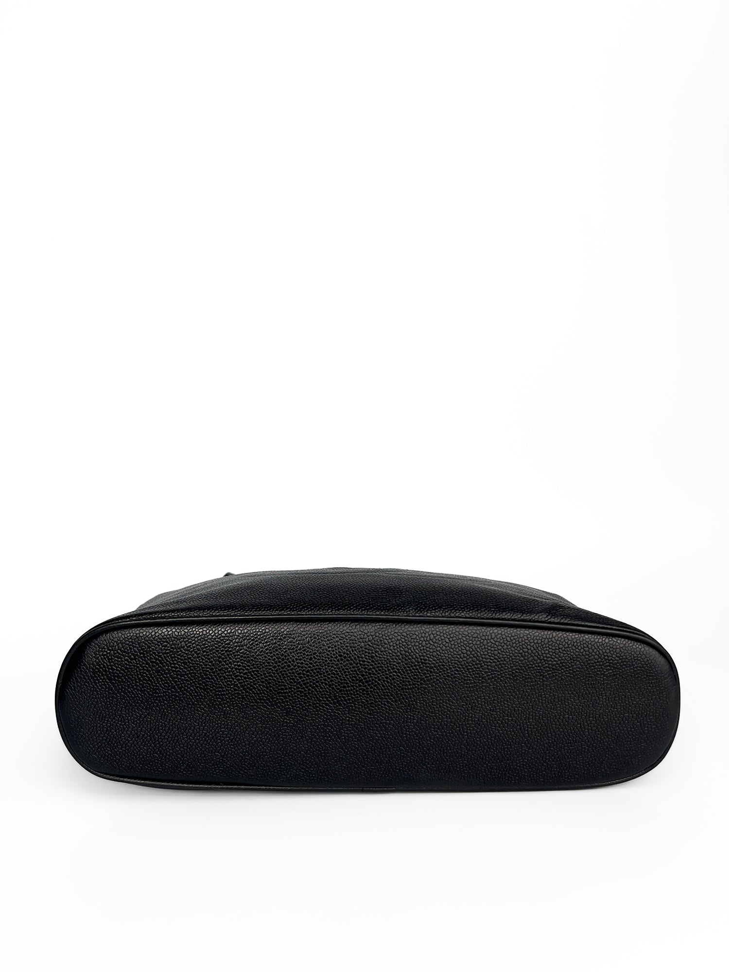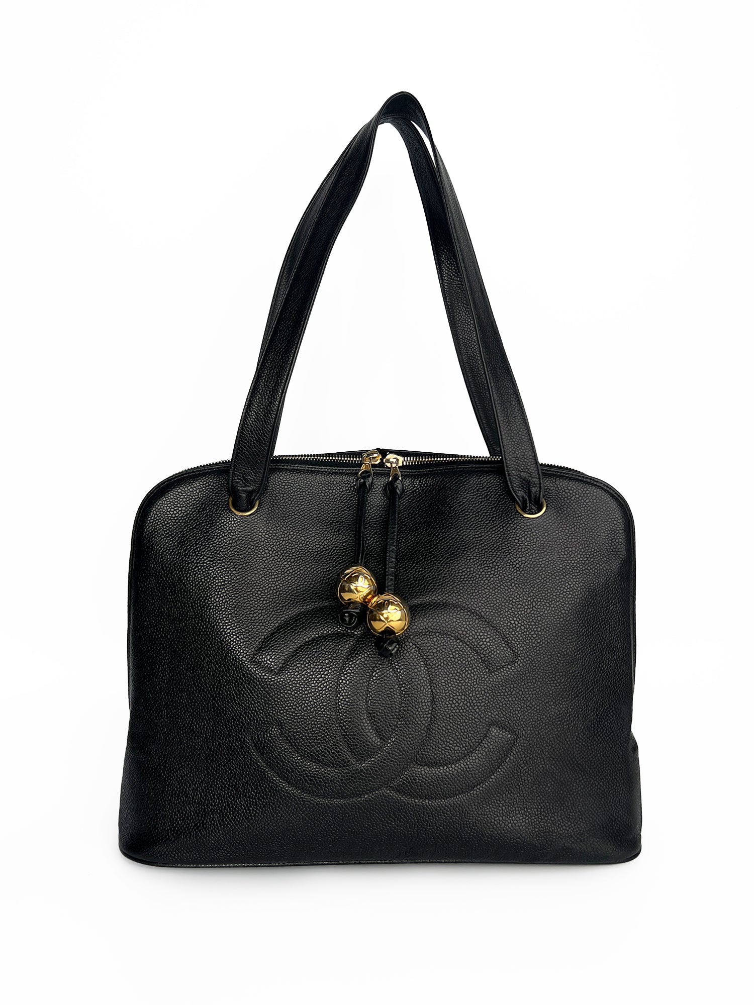 Klasyczna torebka Chanel Coco Mark Tote Bag wykonana z wytrzymałej skóry Caviar w ponadczasowej czarnej kolorystyce z eleganckimi złotymi detalami.