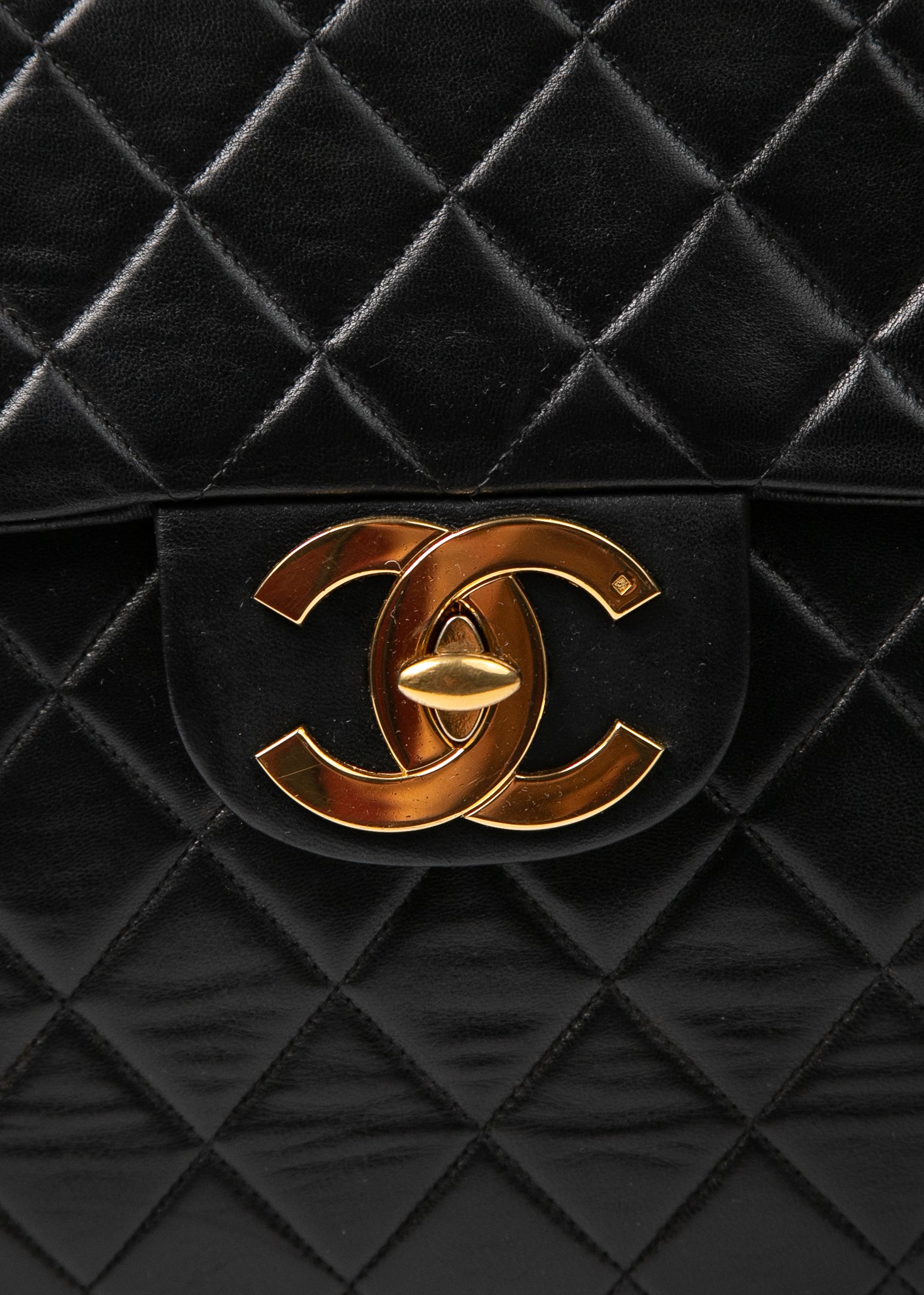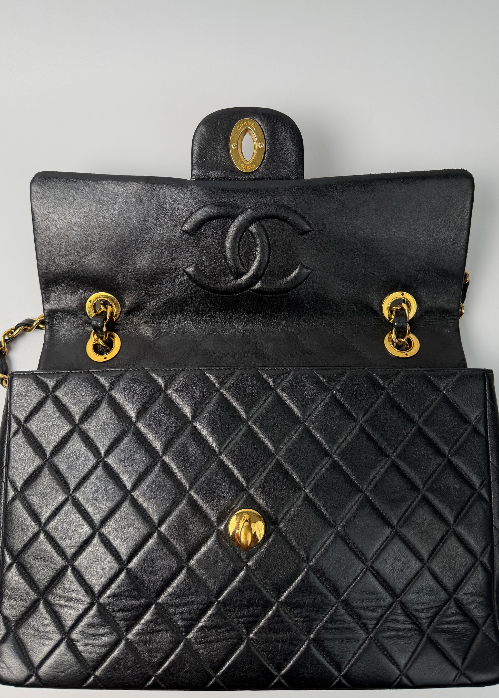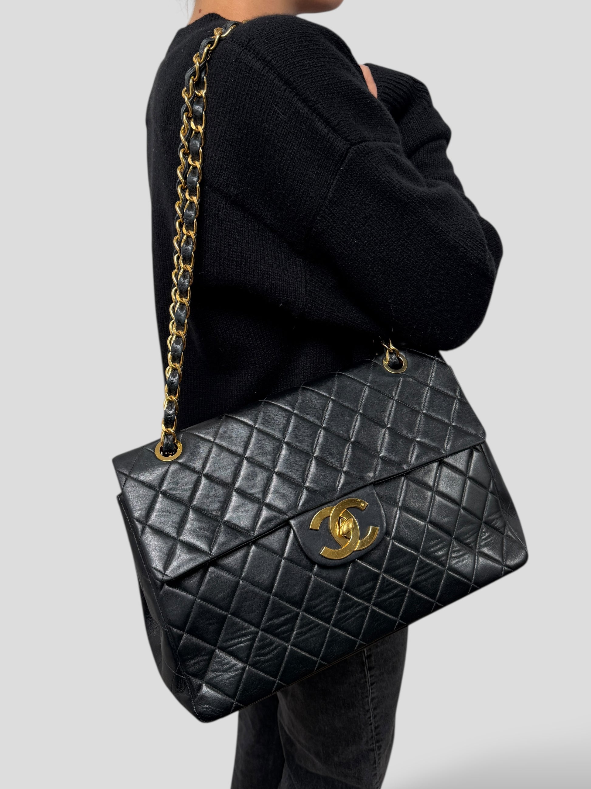 To ten typ Chanel, który widzisz w starych kampaniach i archiwalnych zdjęciach Carli Bruni — duży, miękki, z monumentalnym turn-lockiem i łańcuchem, który sam w sobie wygląda jak biżuteria. Wersja single flap (czyli bez dodatkowej klapy w środku) jest znacznie lżejsza i praktyczniejsza niż późniejsze double flap, a jednocześnie zachowuje całą charakterystyczną objętość pikowania.