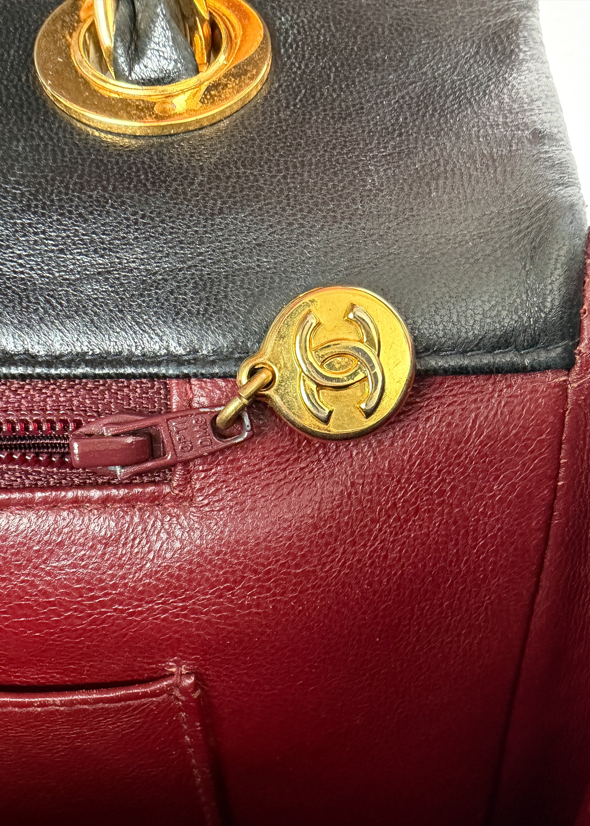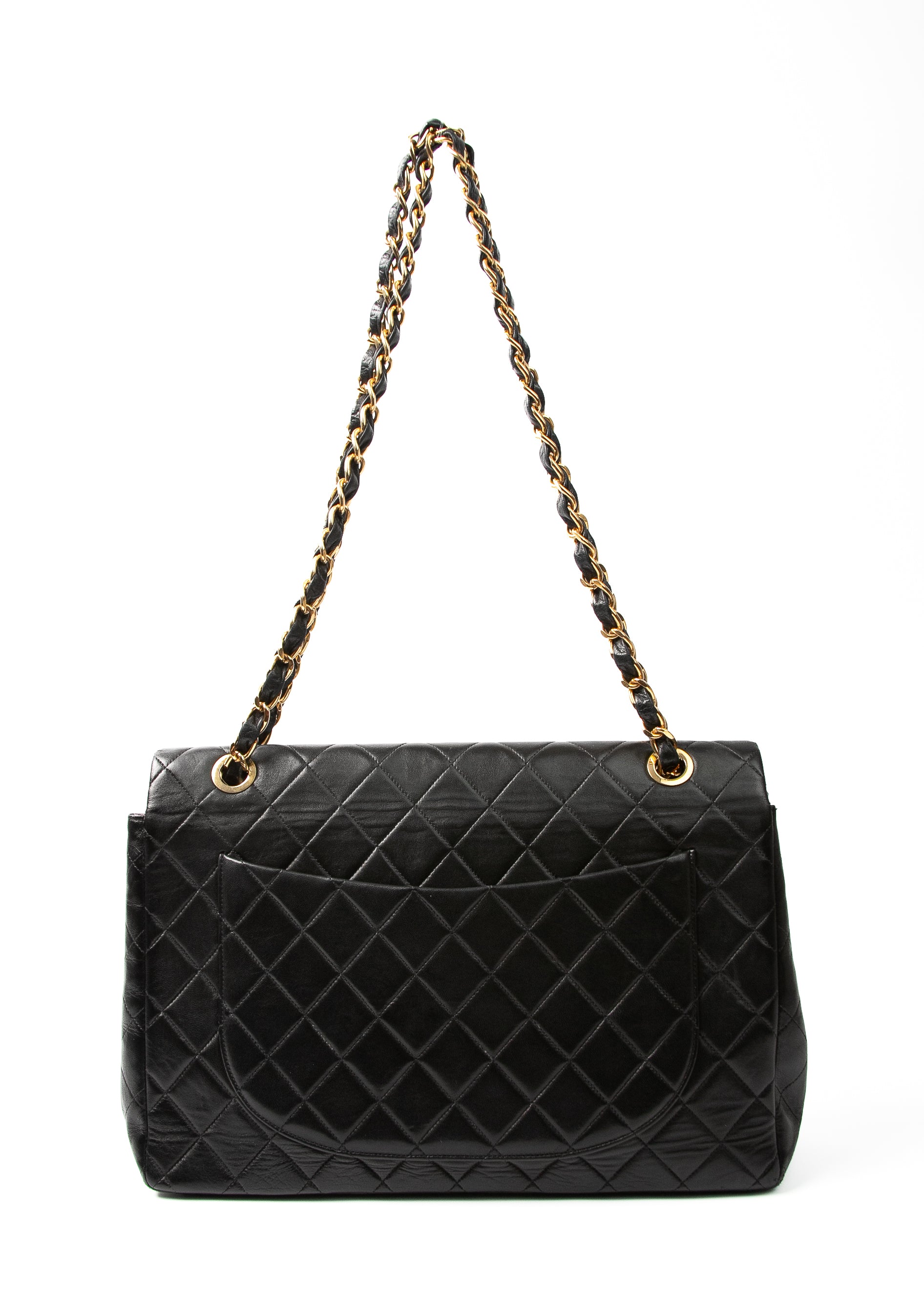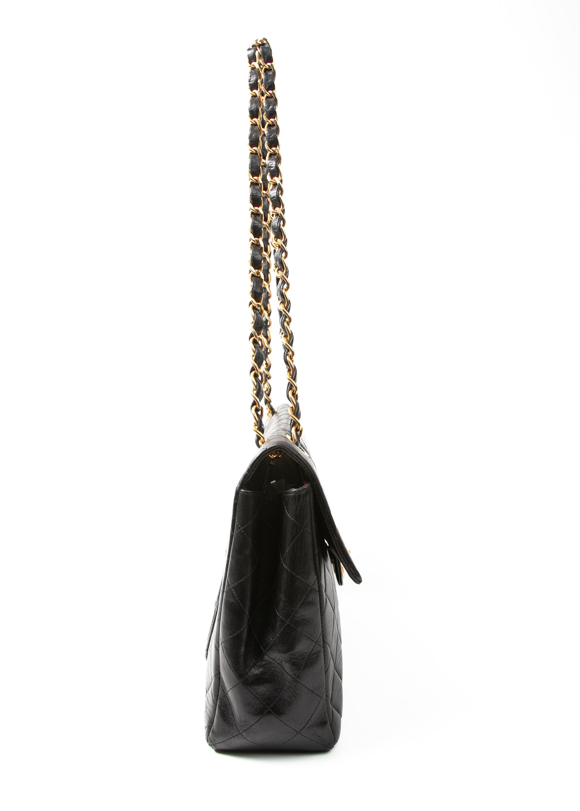 To ten typ Chanel, który widzisz w starych kampaniach i archiwalnych zdjęciach Carli Bruni — duży, miękki, z monumentalnym turn-lockiem i łańcuchem, który sam w sobie wygląda jak biżuteria. Wersja single flap (czyli bez dodatkowej klapy w środku) jest znacznie lżejsza i praktyczniejsza niż późniejsze double flap, a jednocześnie zachowuje całą charakterystyczną objętość pikowania.