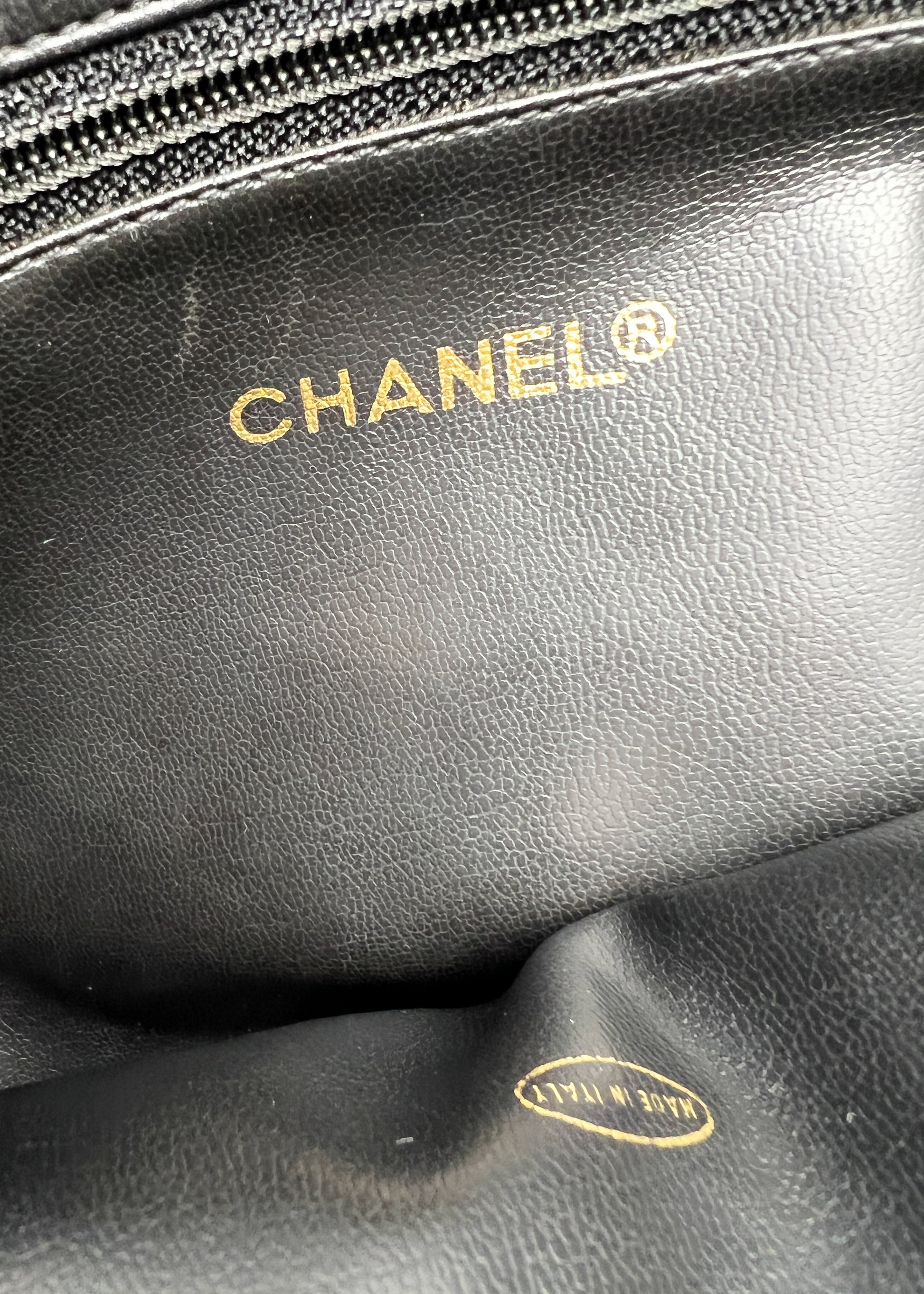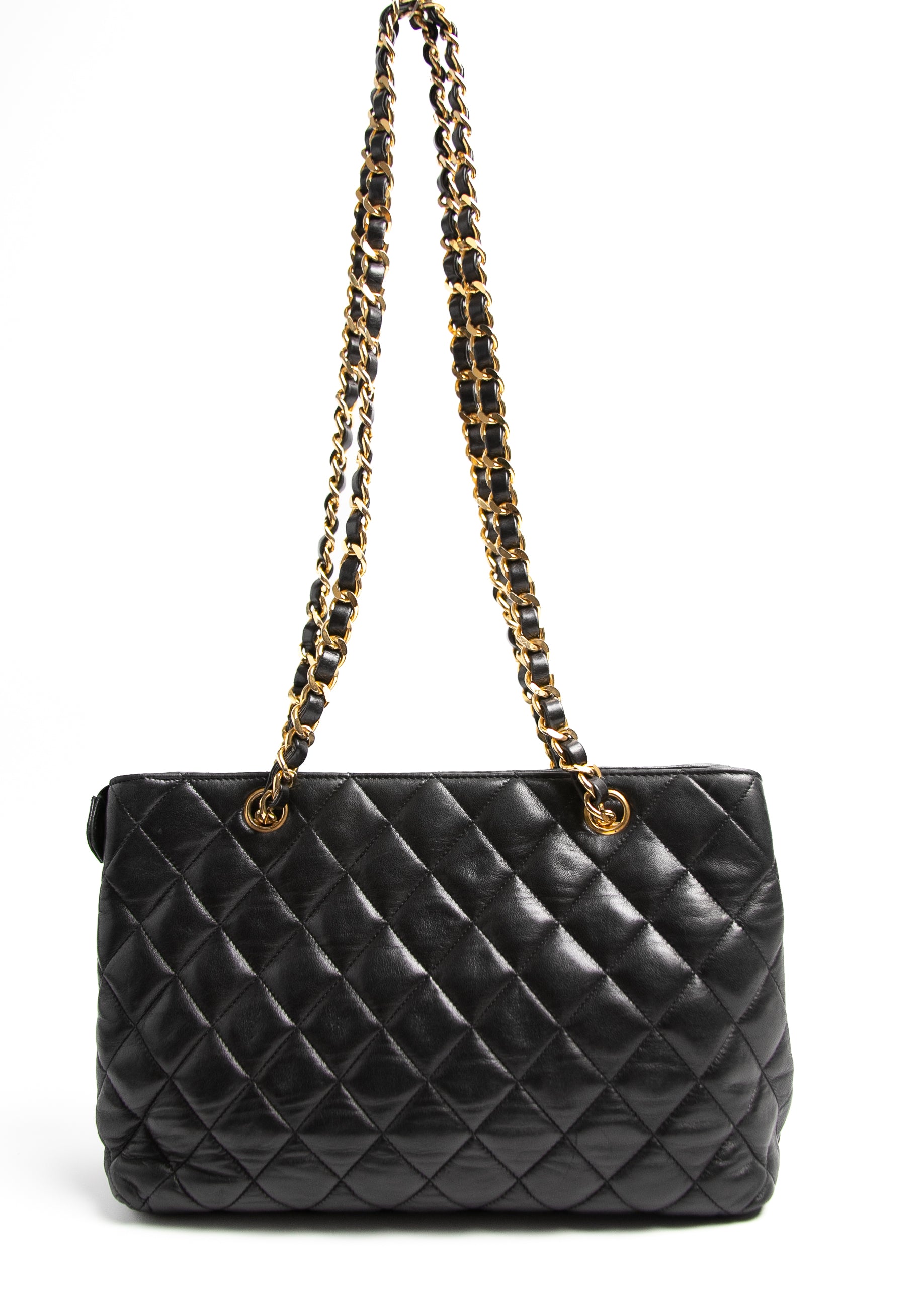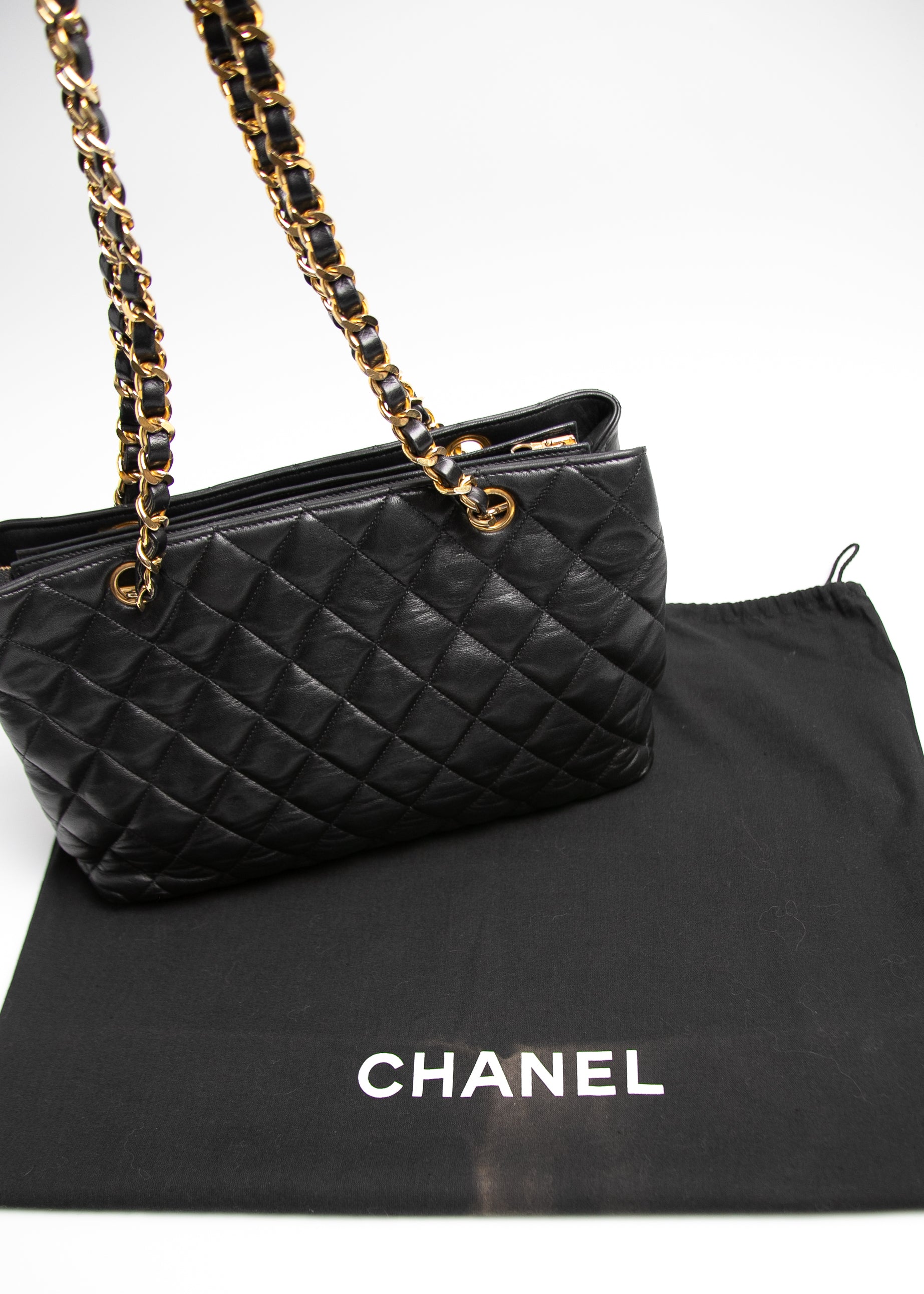 Ponadczasowa torebka Chanel wykonana z miękkiej, czarnej skóry jagnięcej o klasycznym pikowaniu, zdobiona charakterystycznym łańcuchem przeplatanym skórą, wyróżniający się prostą formą i złotymi detalami, typowymi dla epoki Karla Lagerfelda.