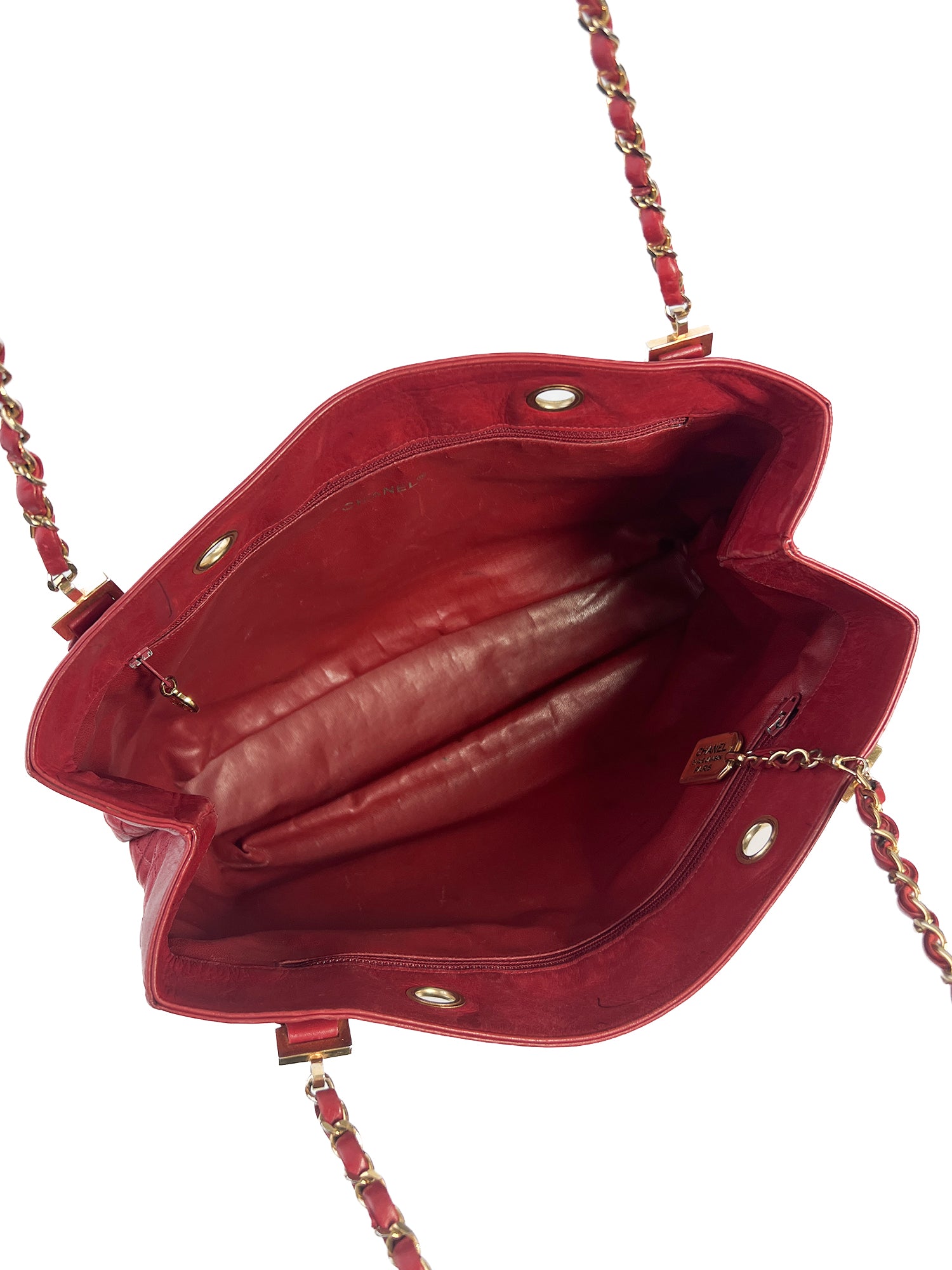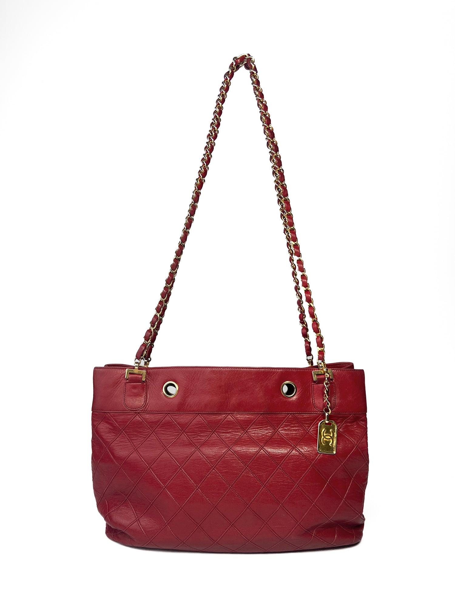 Elegancka torebka wykonana z najwyższej jakości skóry jagnięcej w głębokim, karmazynowym odcieniu czerwieni z charakterystycznym pikowanym wzorem.