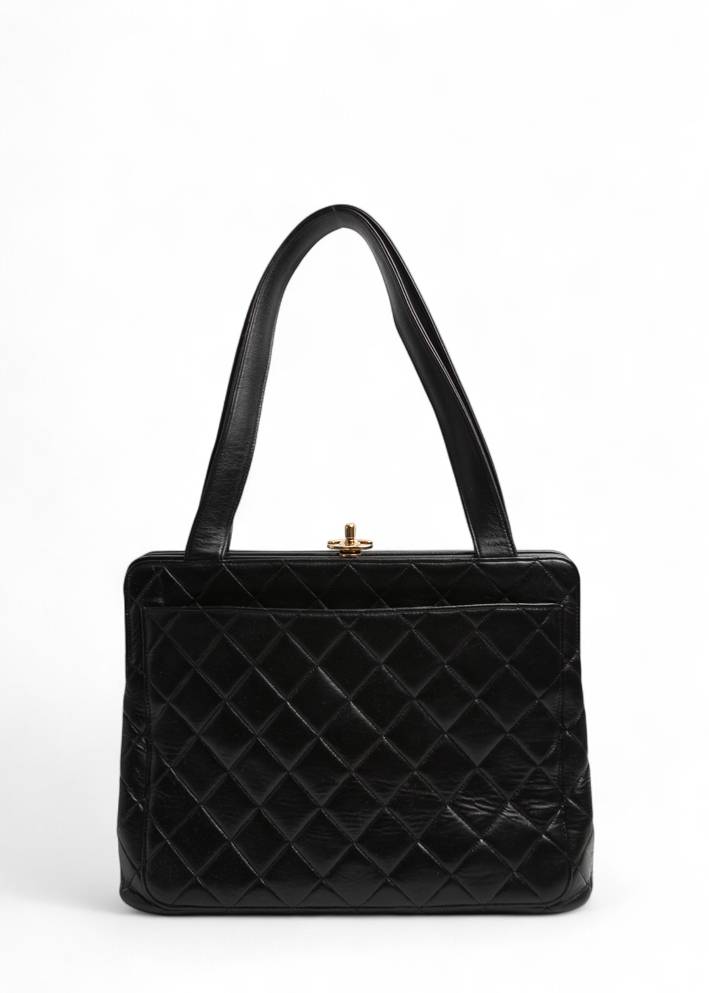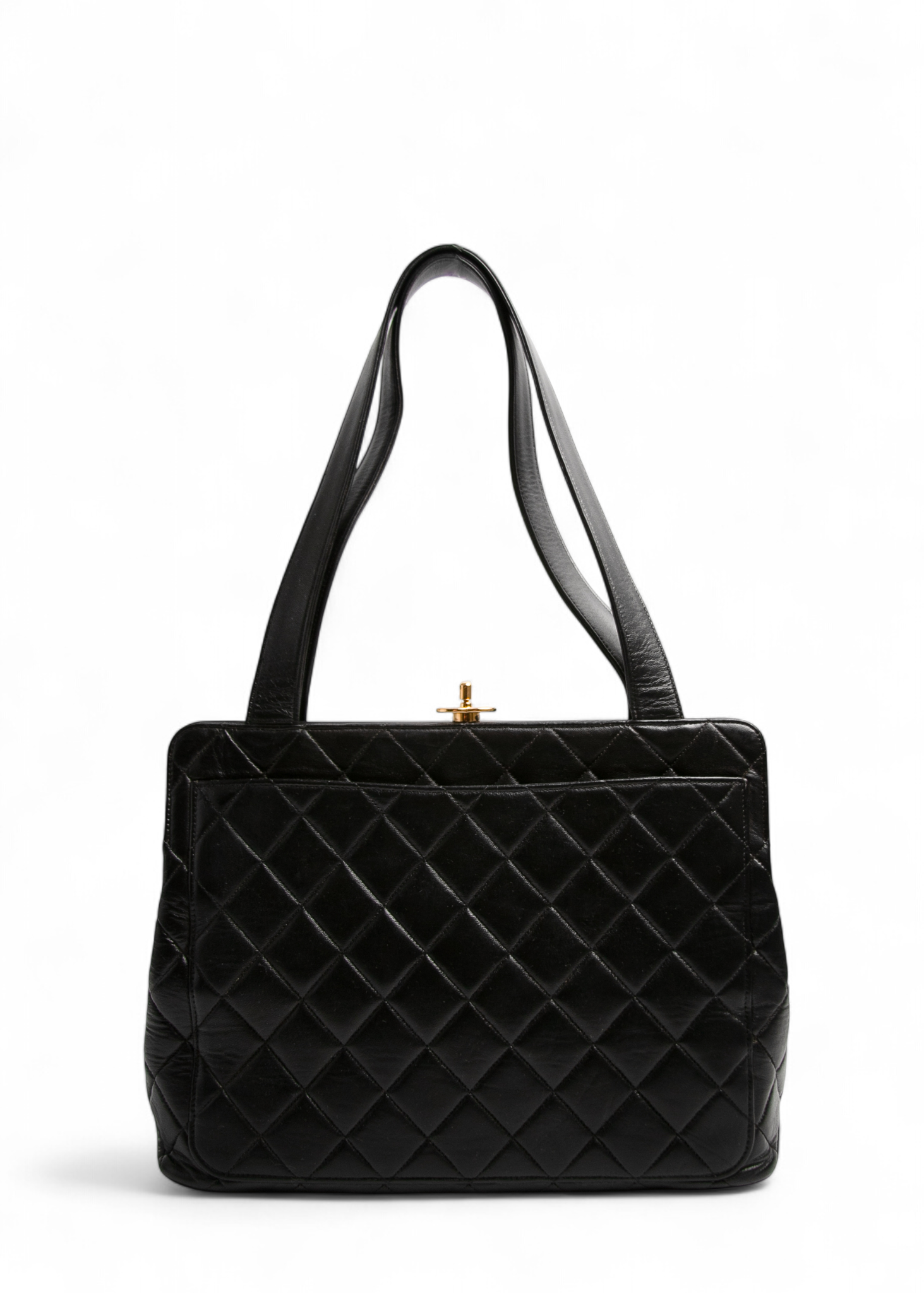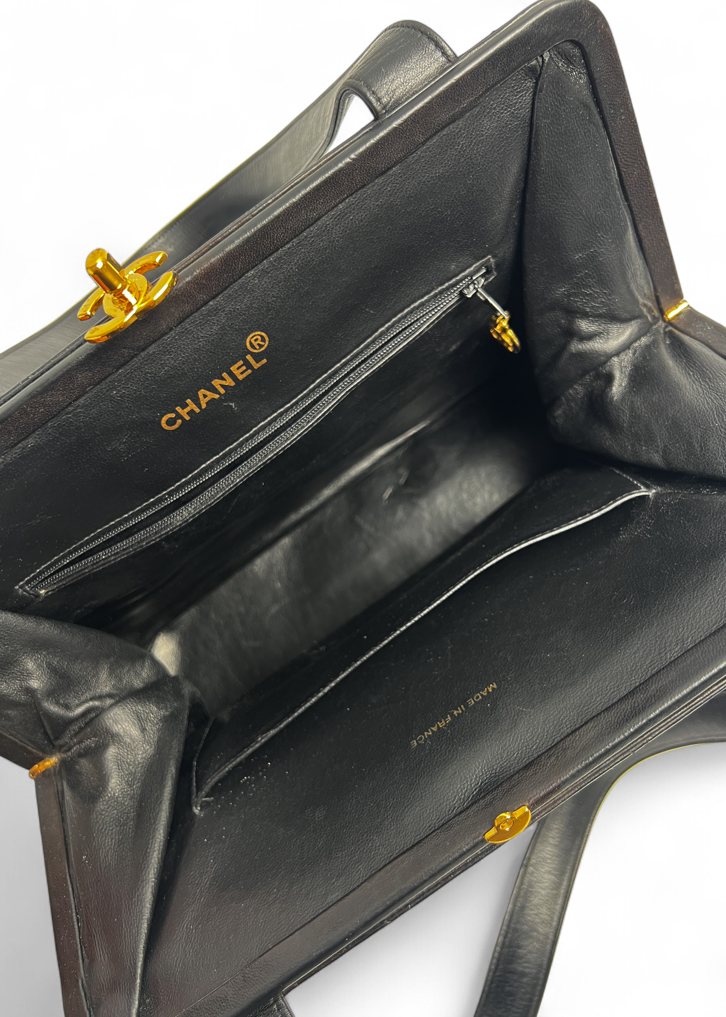 Chanel Top CC Vintage – model z podwójnymi skórzanymi rączkami i obrotowym zapięciem CC pozłacanym 24k złotem.