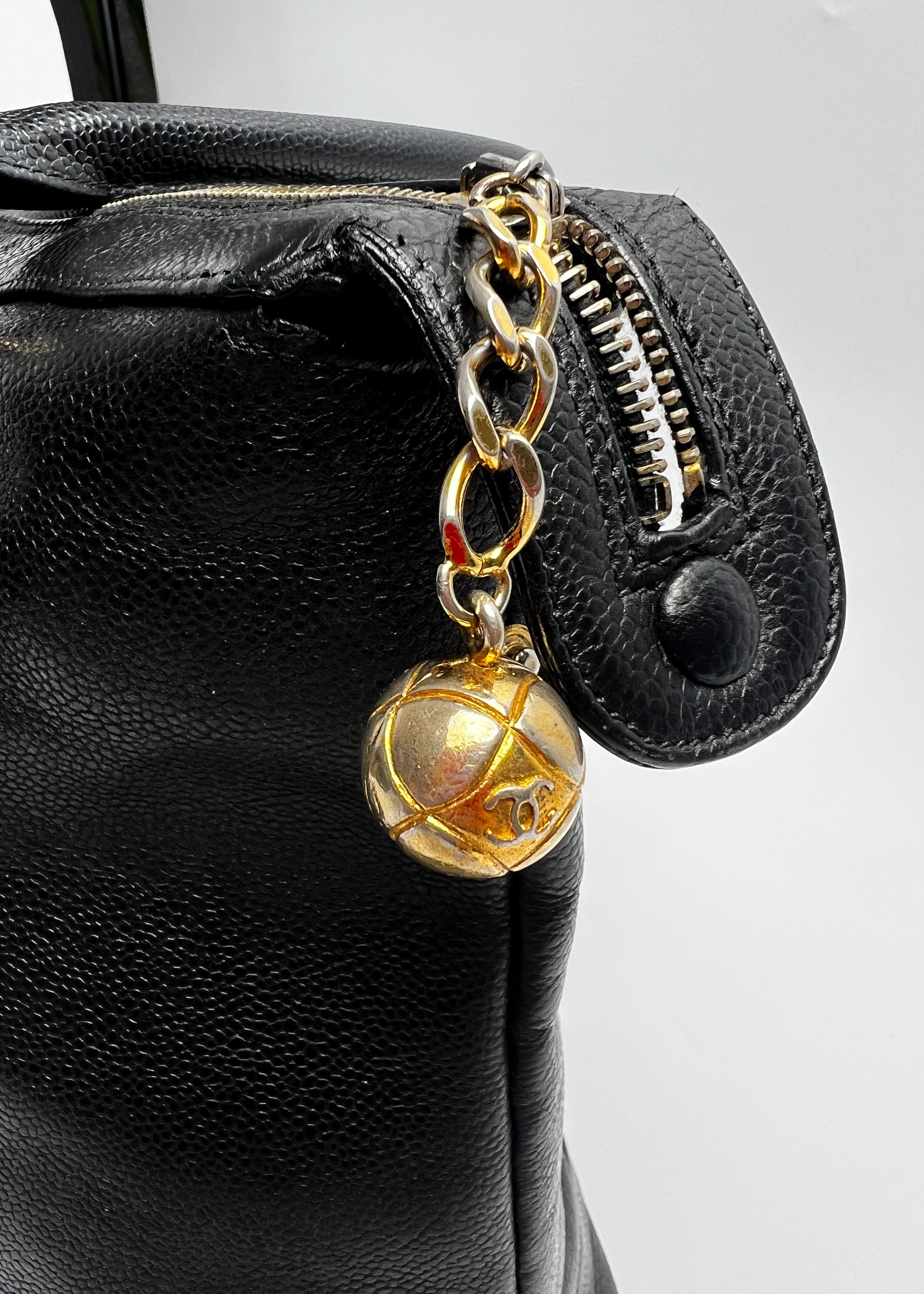 Torba Chanel wykonana z czarnej skóry caviar o wyraźnej fakturze, ozdobiona charakterystycznym logo CC i złotymi detalami. To klasyczny model o pojemnym, funkcjonalnym kroju.