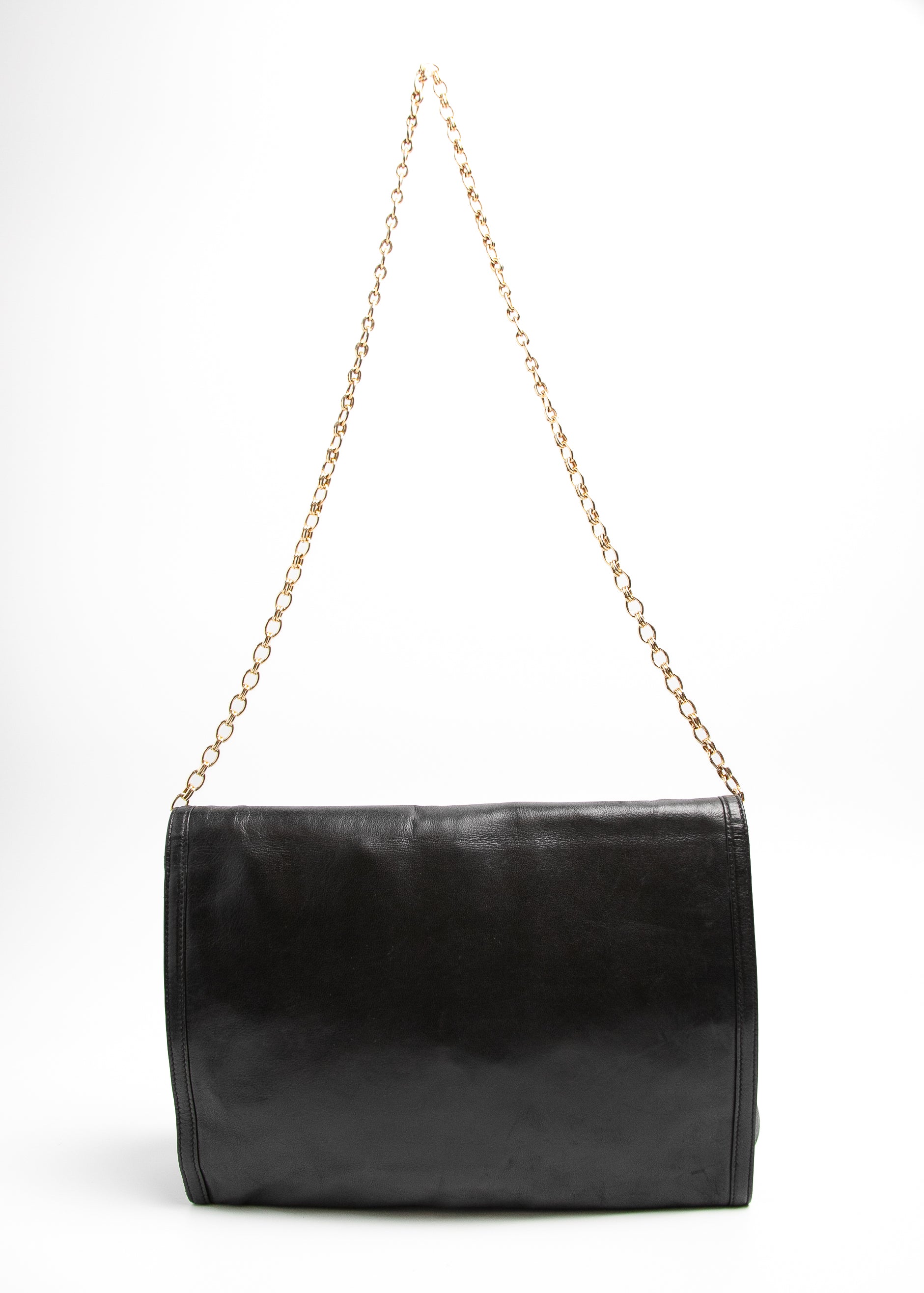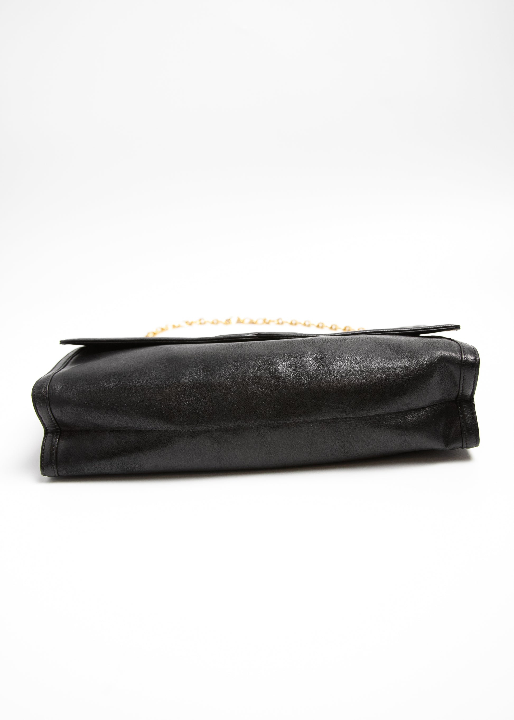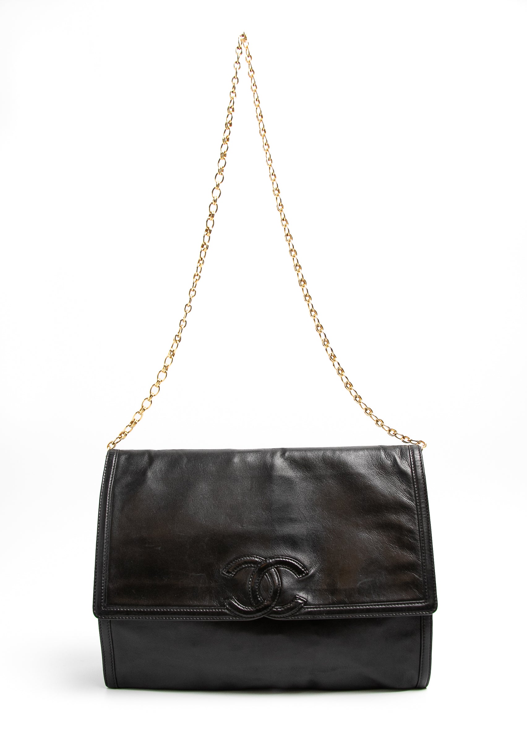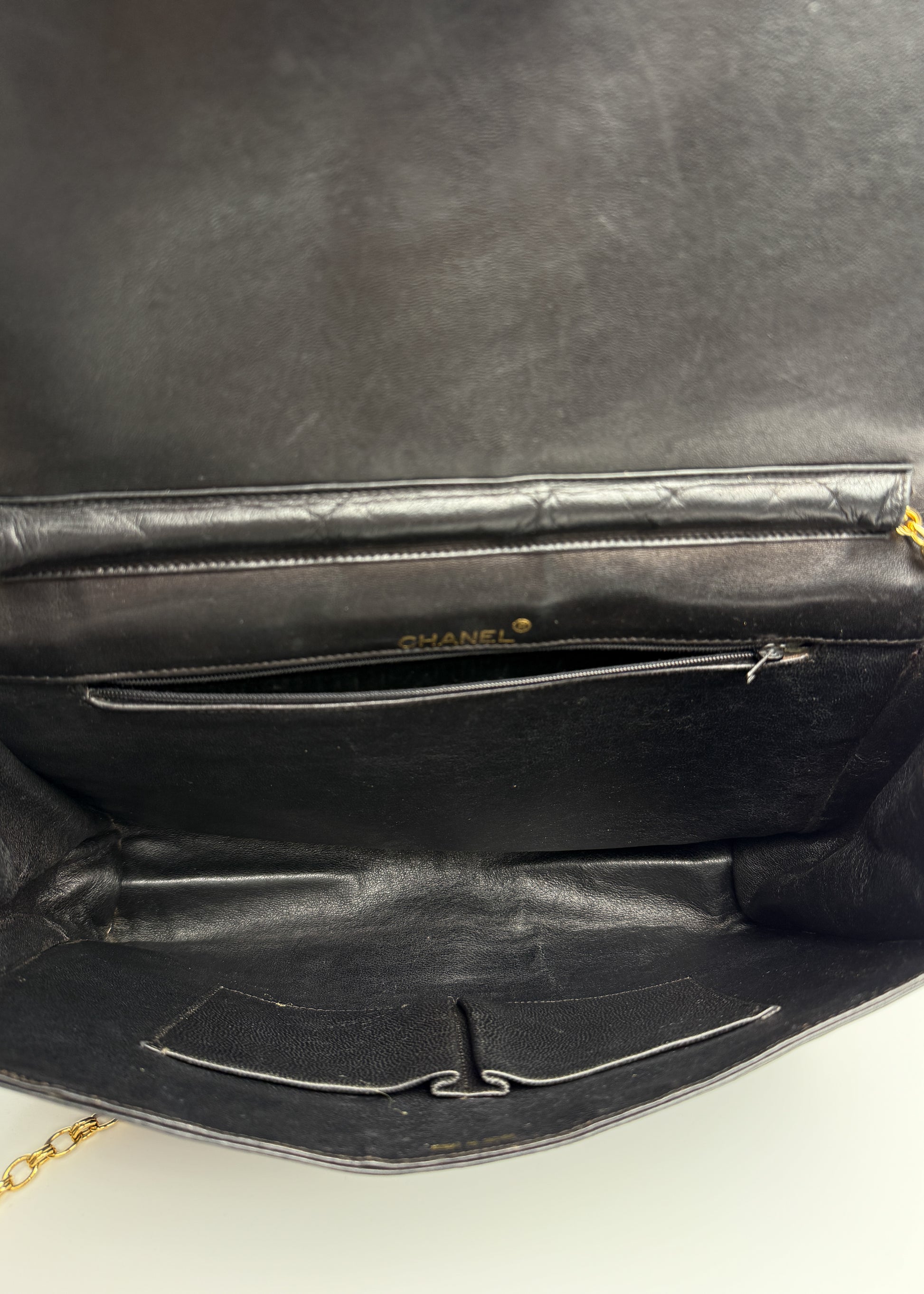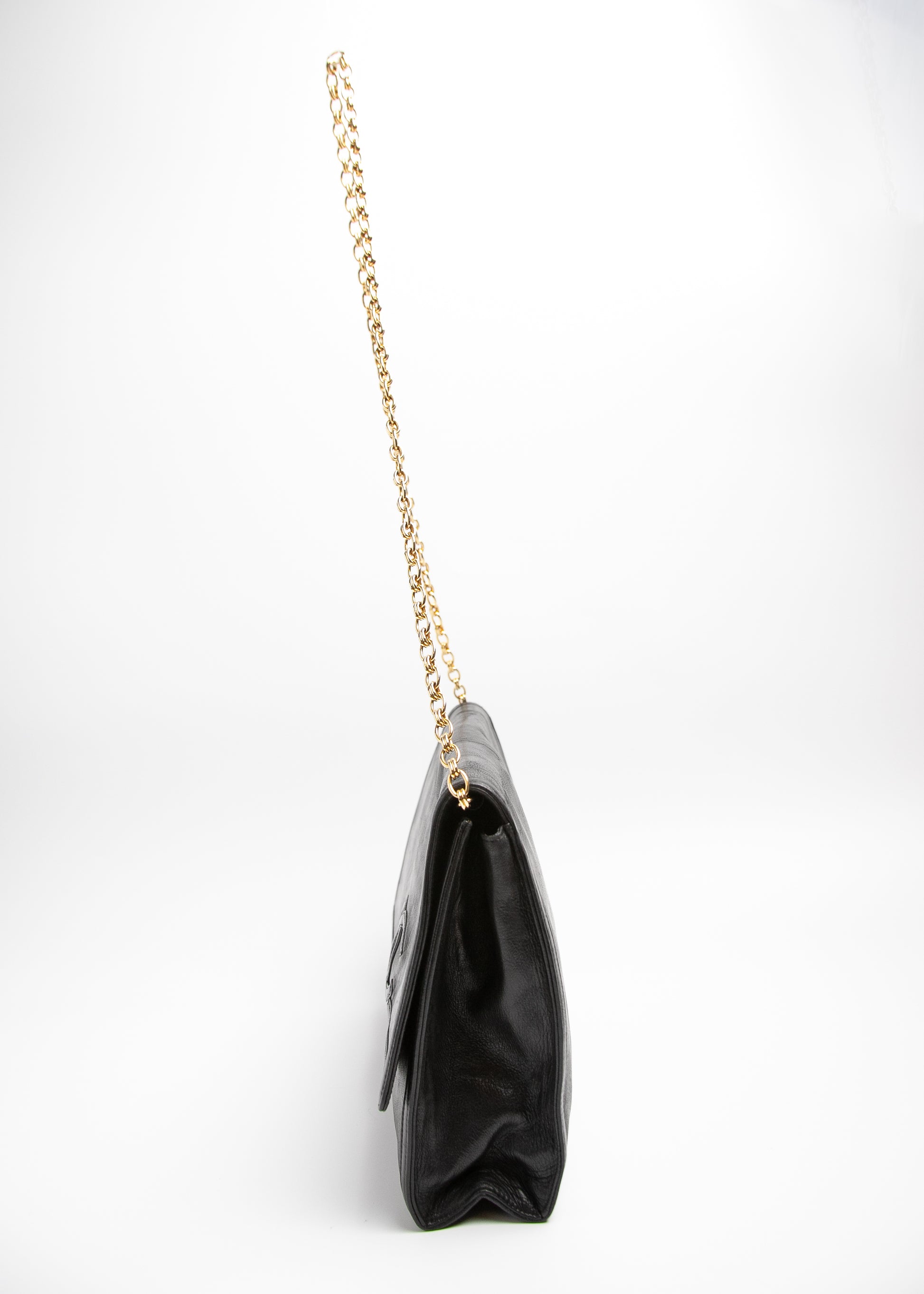 Elegancka torba Chanel w odcieniu głębokiej czerni, wykonana z delikatnej skóry jagnięcej, z charakterystycznym tłoczonym logo CC. reprezentujący minimalistyczną odsłonę stylu „Timeless” — większy format, prosty krój i złoty łańcuch typowy dla epoki.
