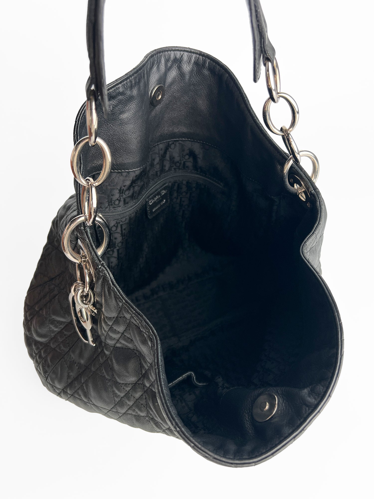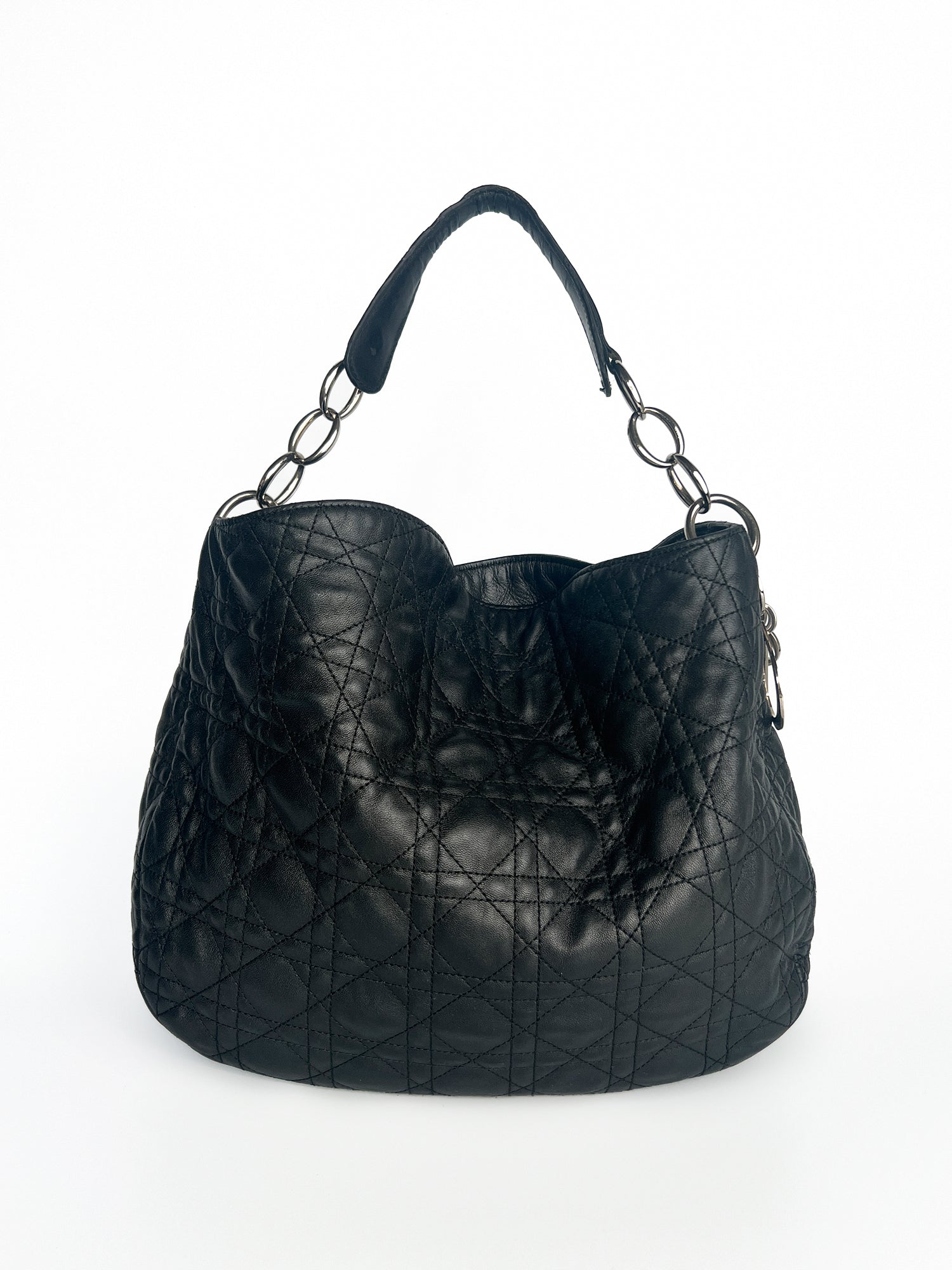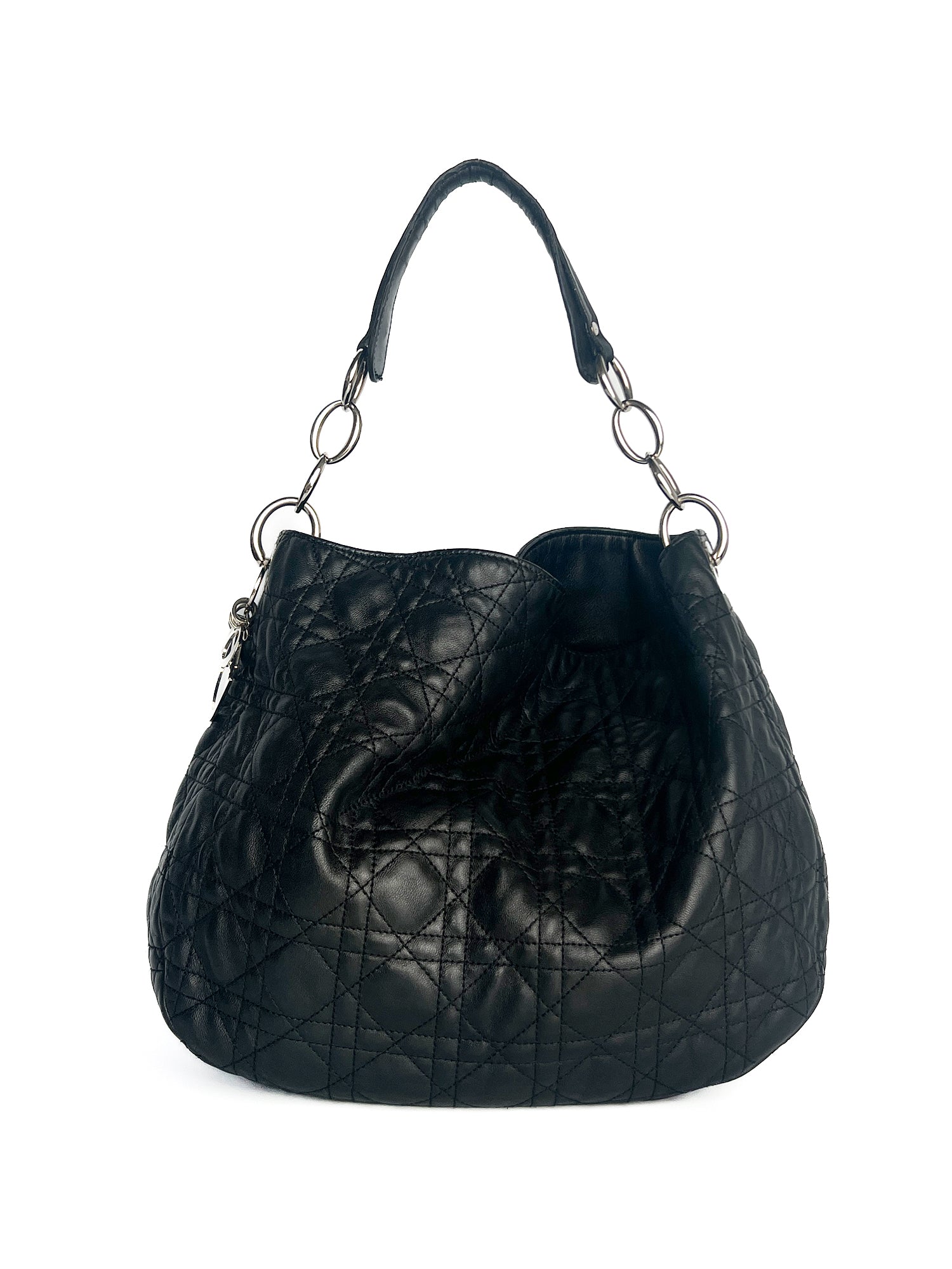 Elegancka torebka typu hobo Christian Dior w klasycznej czarnej kolorystyce, wykonana z miękkiej skóry jagnięcej z charakterystycznym pikowanym wzorem Cannage.
