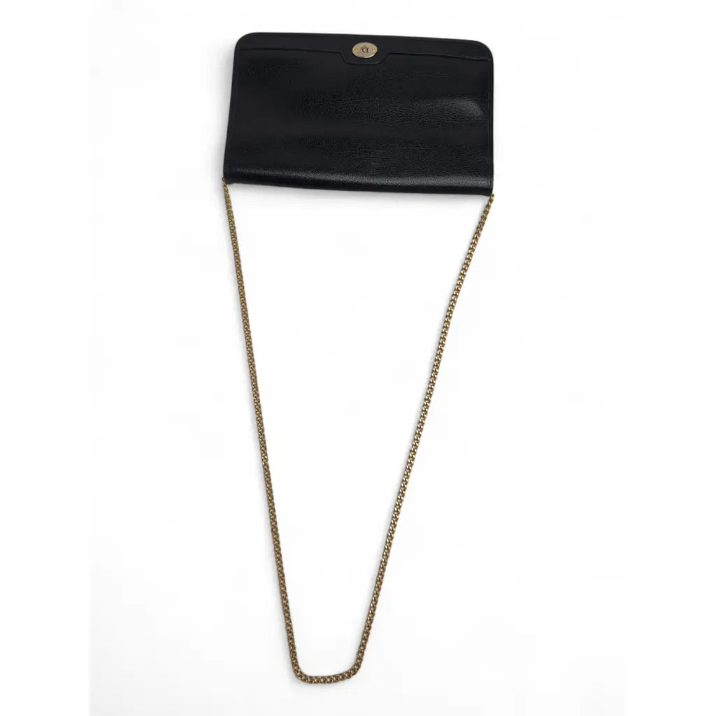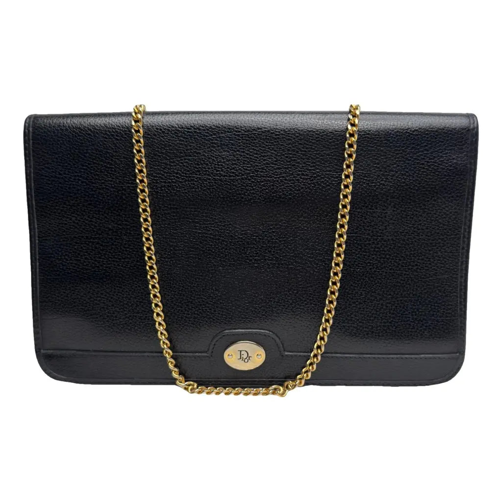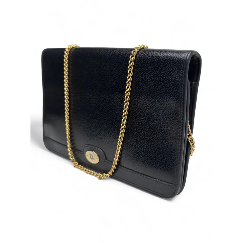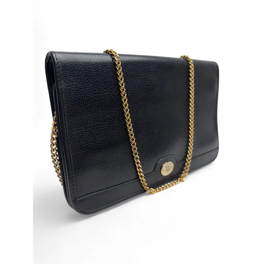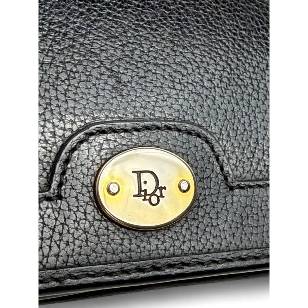 Elegancka kopertówka Christian Dior w uniwersalnej czarnej kolorystyce, wykonana z wysokiej jakości ziarnistej skóry cielęcej z charakterystycznym złotym logo Dior.