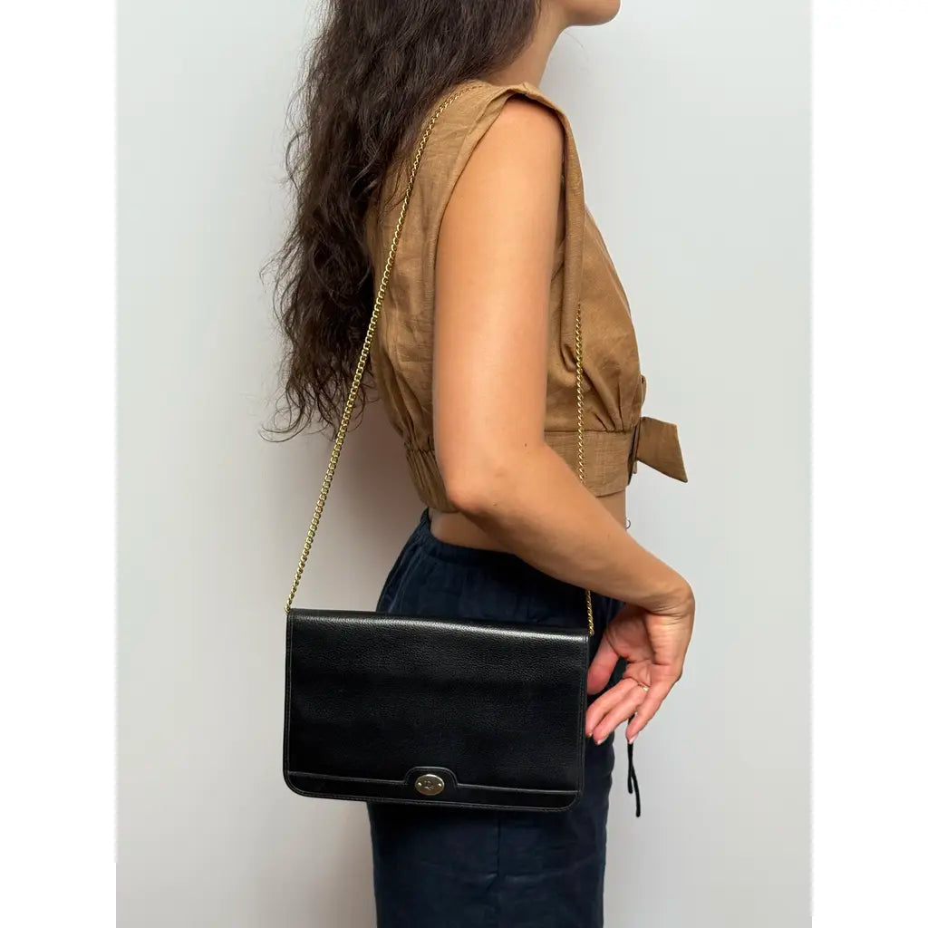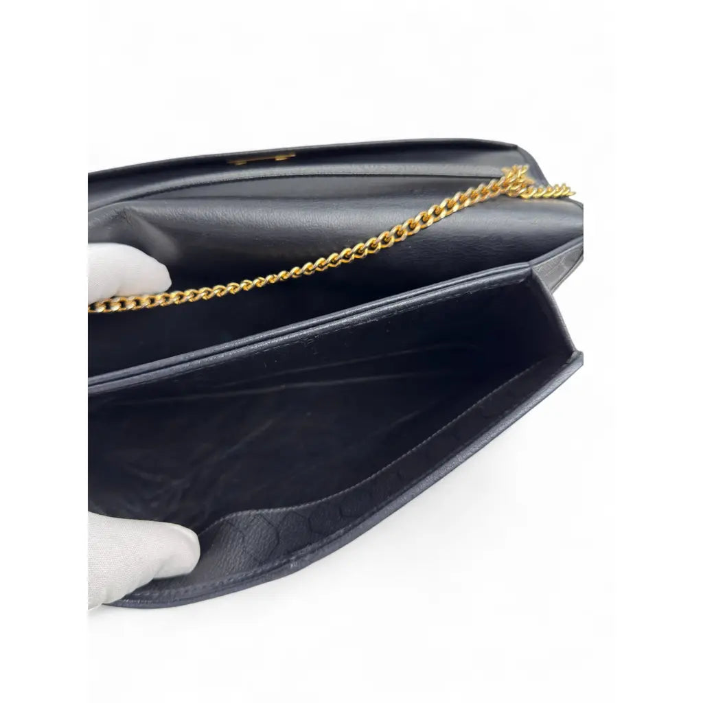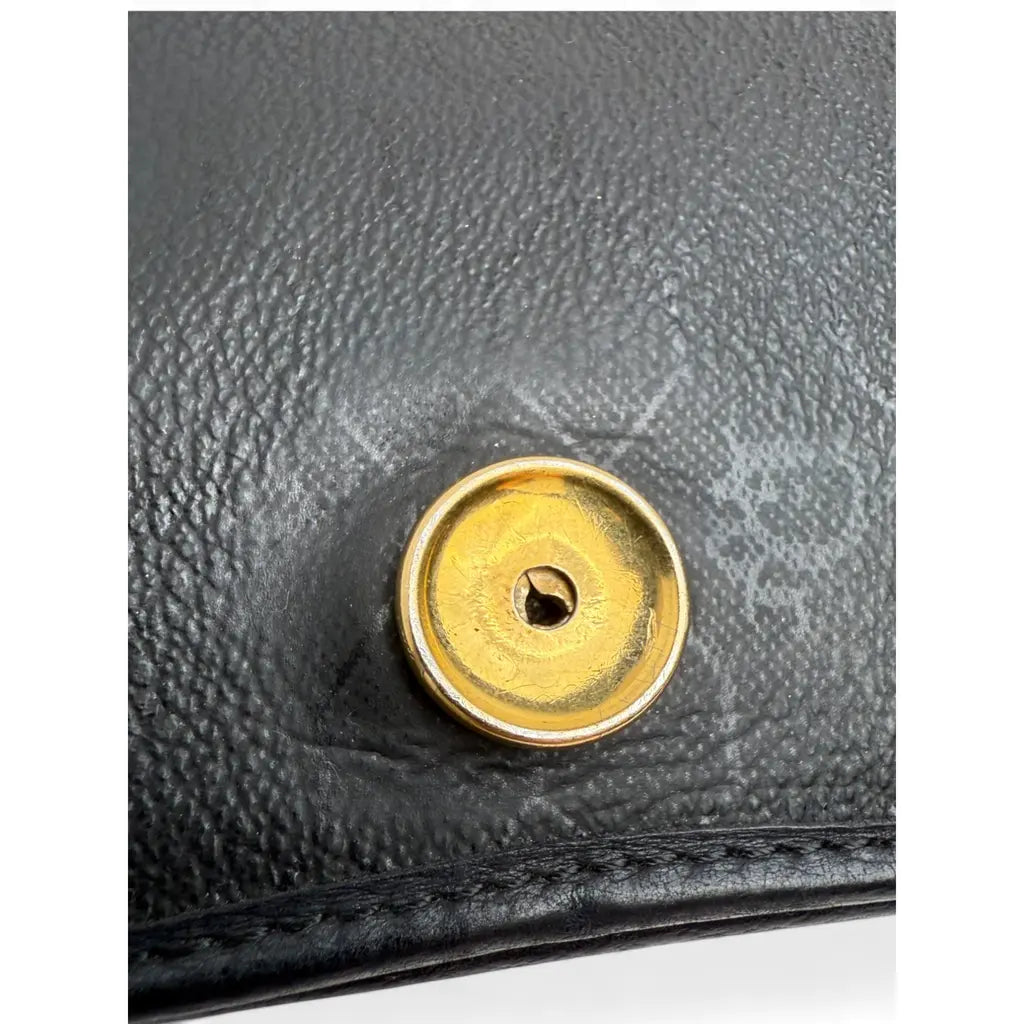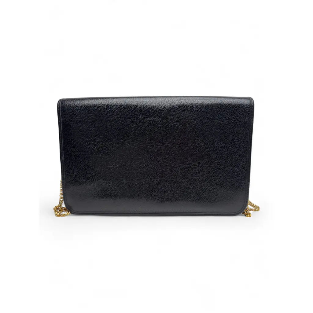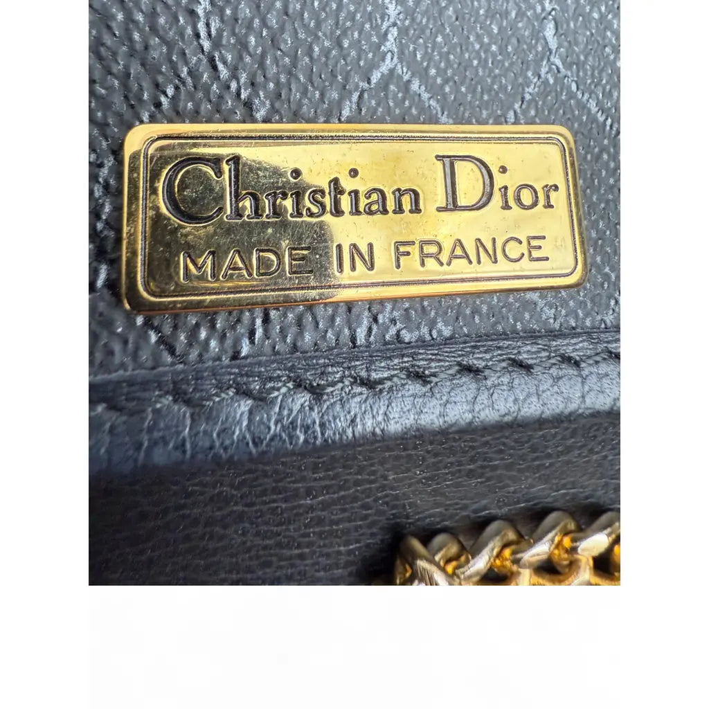 Elegancka kopertówka Christian Dior w uniwersalnej czarnej kolorystyce, wykonana z wysokiej jakości ziarnistej skóry cielęcej z charakterystycznym złotym logo Dior.