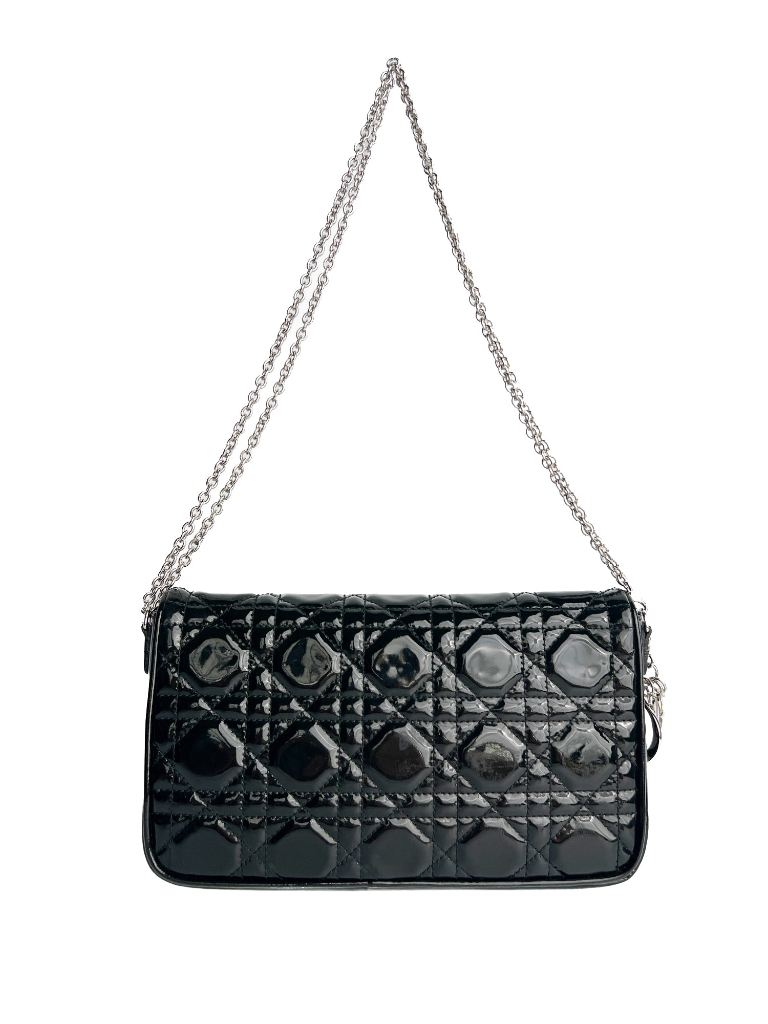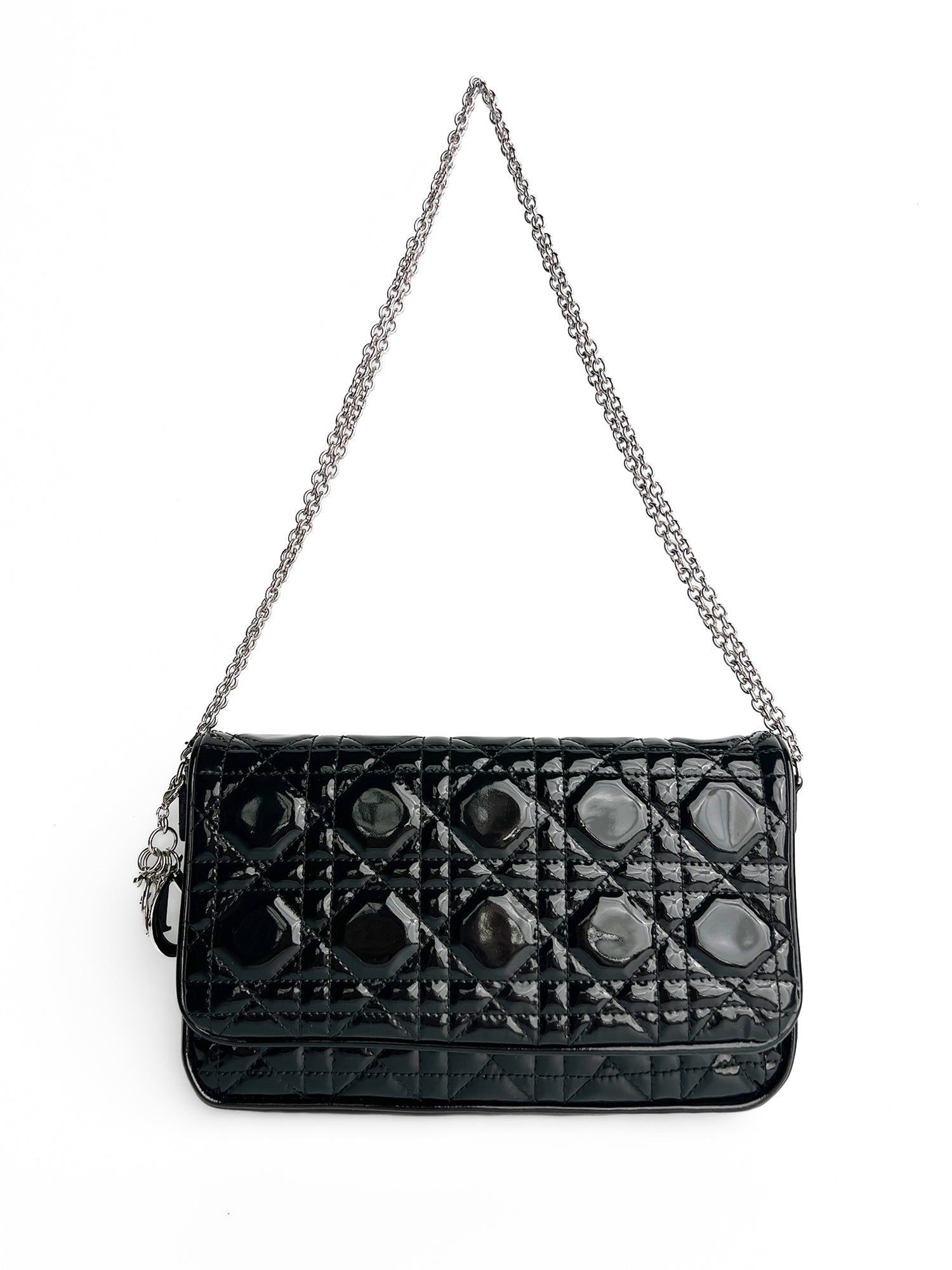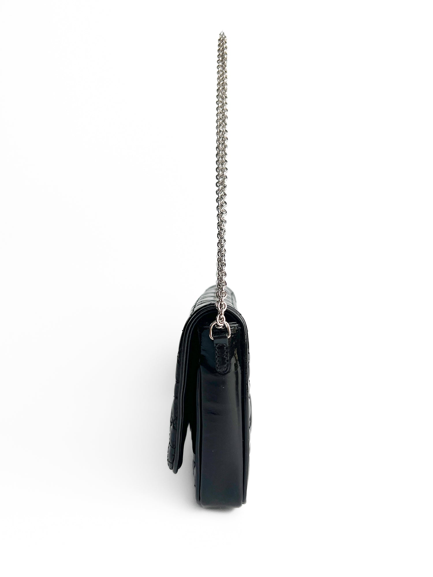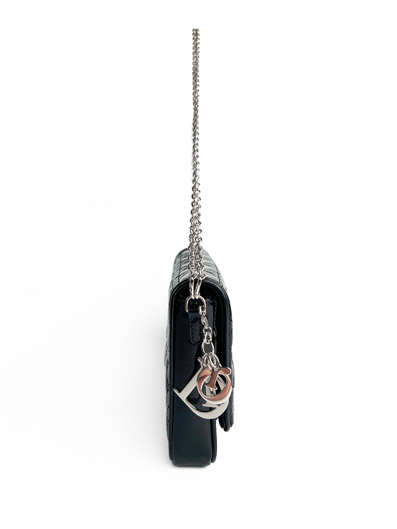 Elegancka torebka Dior Patent Cannage Wallet w czarnej kolorystyce, wykonana z wysokiej jakości lakierowanej skóry z charakterystycznym pikowanym wzorem Cannage.