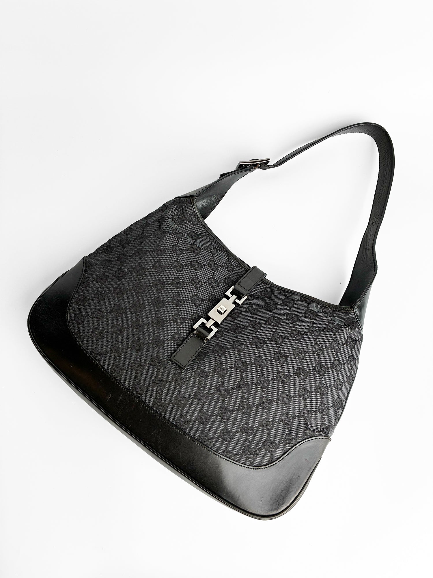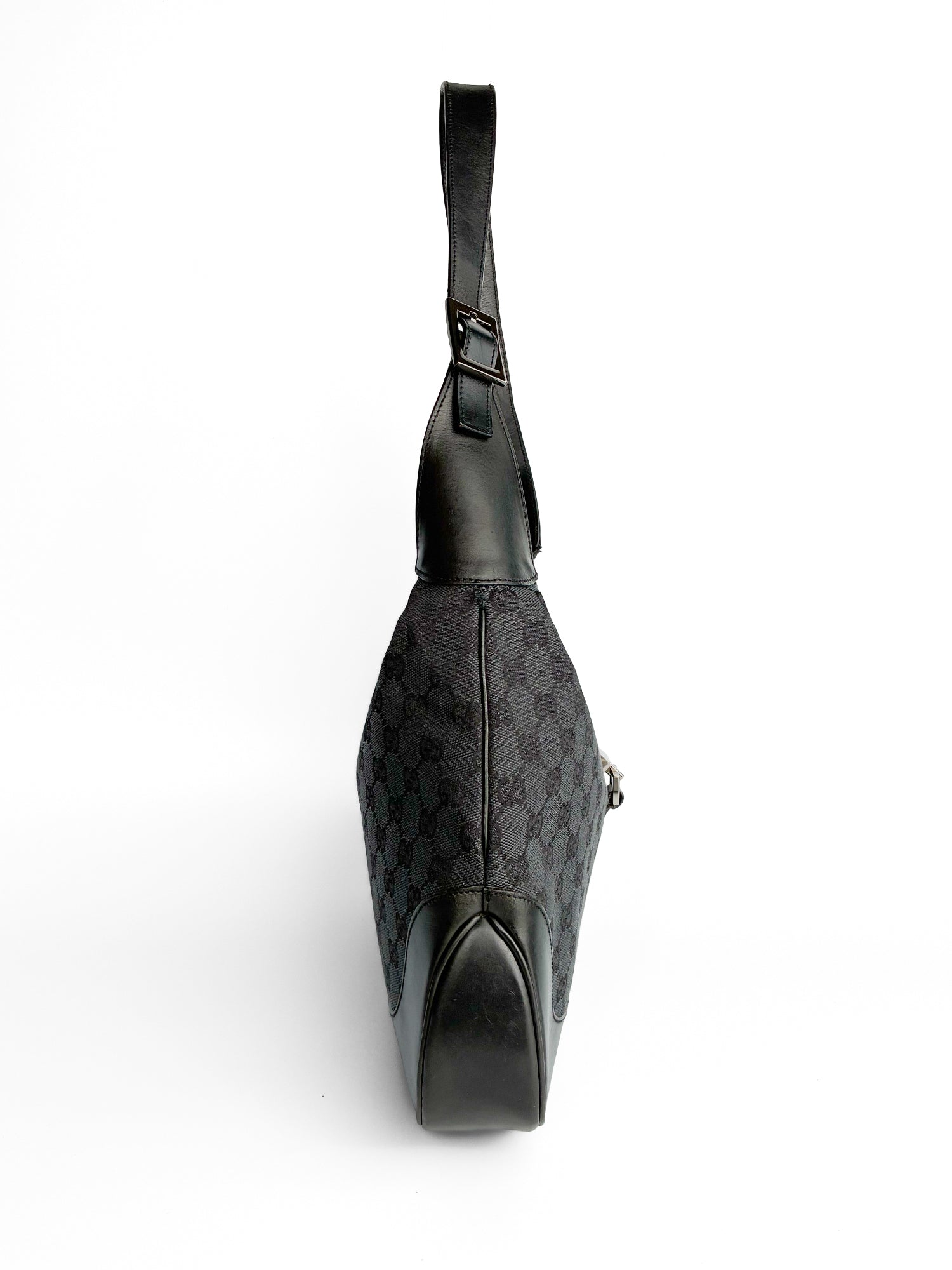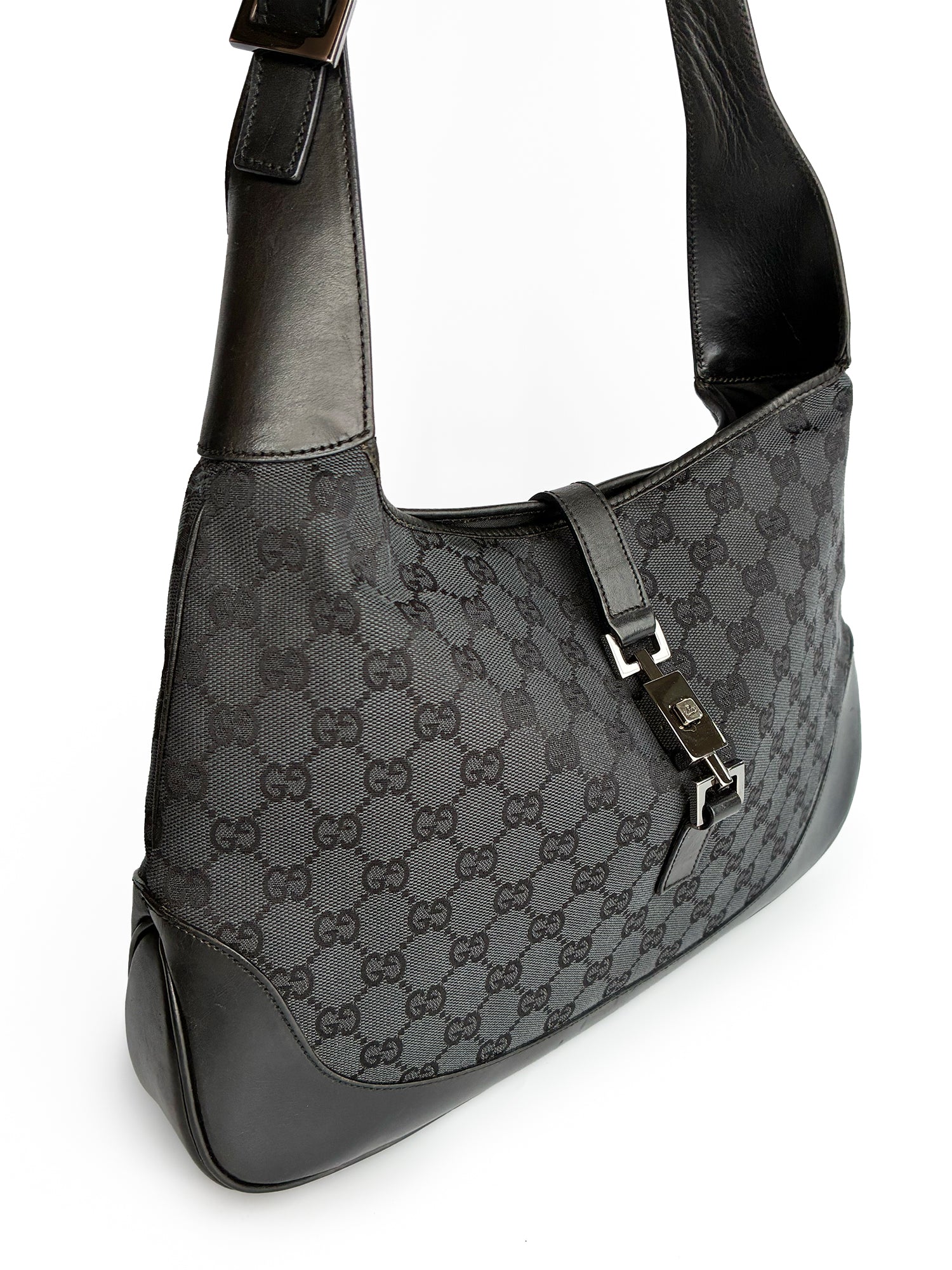 Kultowa torebka Gucci Jackie w klasycznej czarno-szarej kolorystyce, wykonana z charakterystycznego płótna GG Canvas z detalami ze skóry naturalnej.