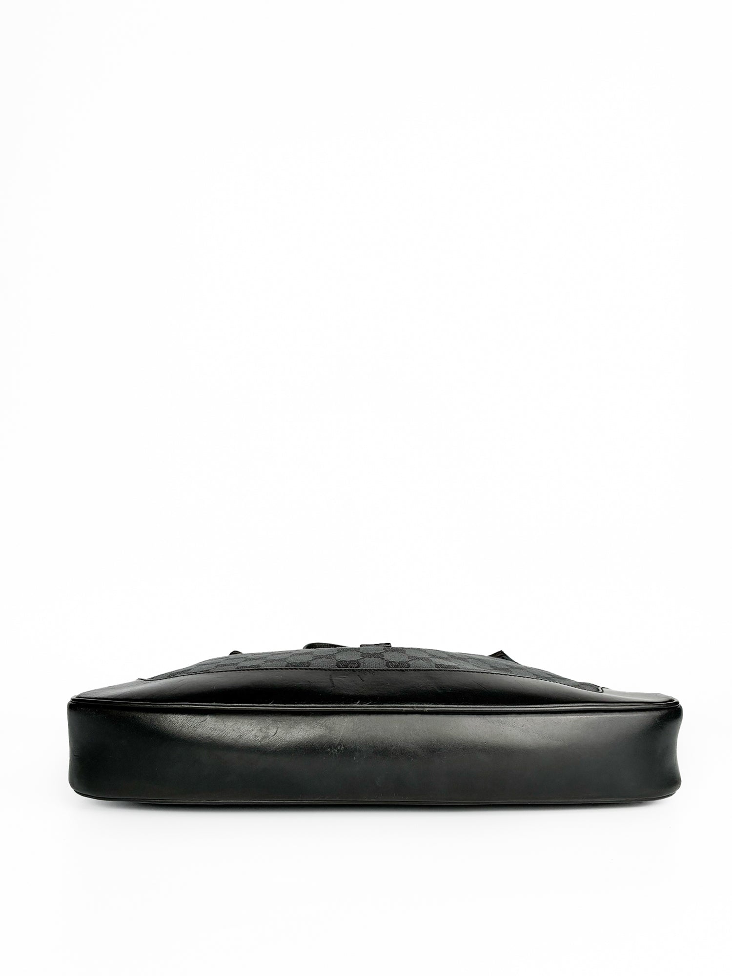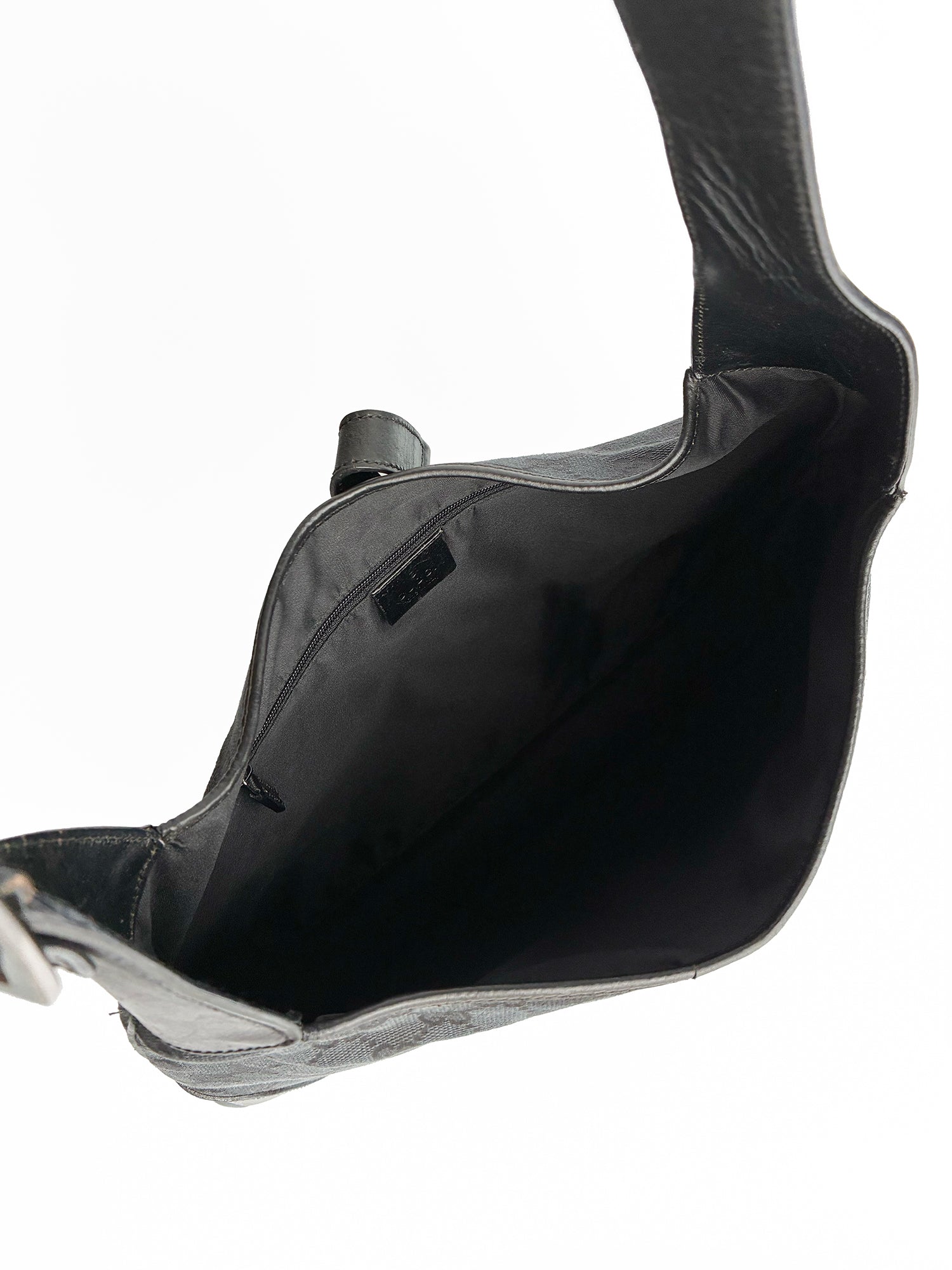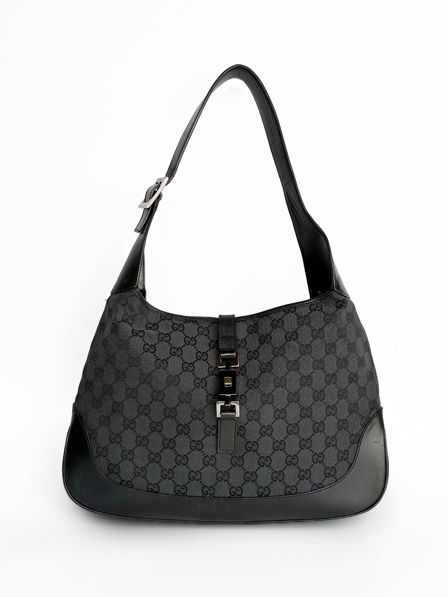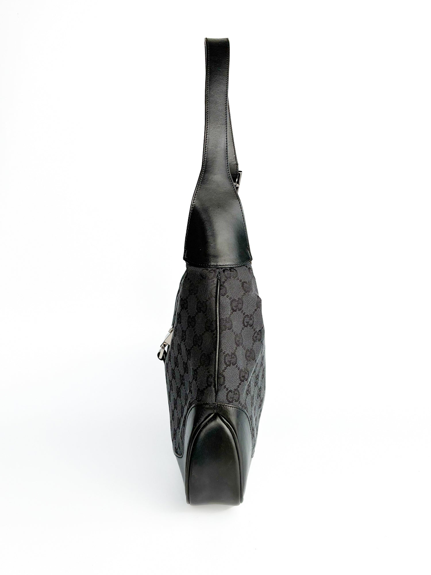 Kultowa torebka Gucci Jackie w klasycznej czarno-szarej kolorystyce, wykonana z charakterystycznego płótna GG Canvas z detalami ze skóry naturalnej.