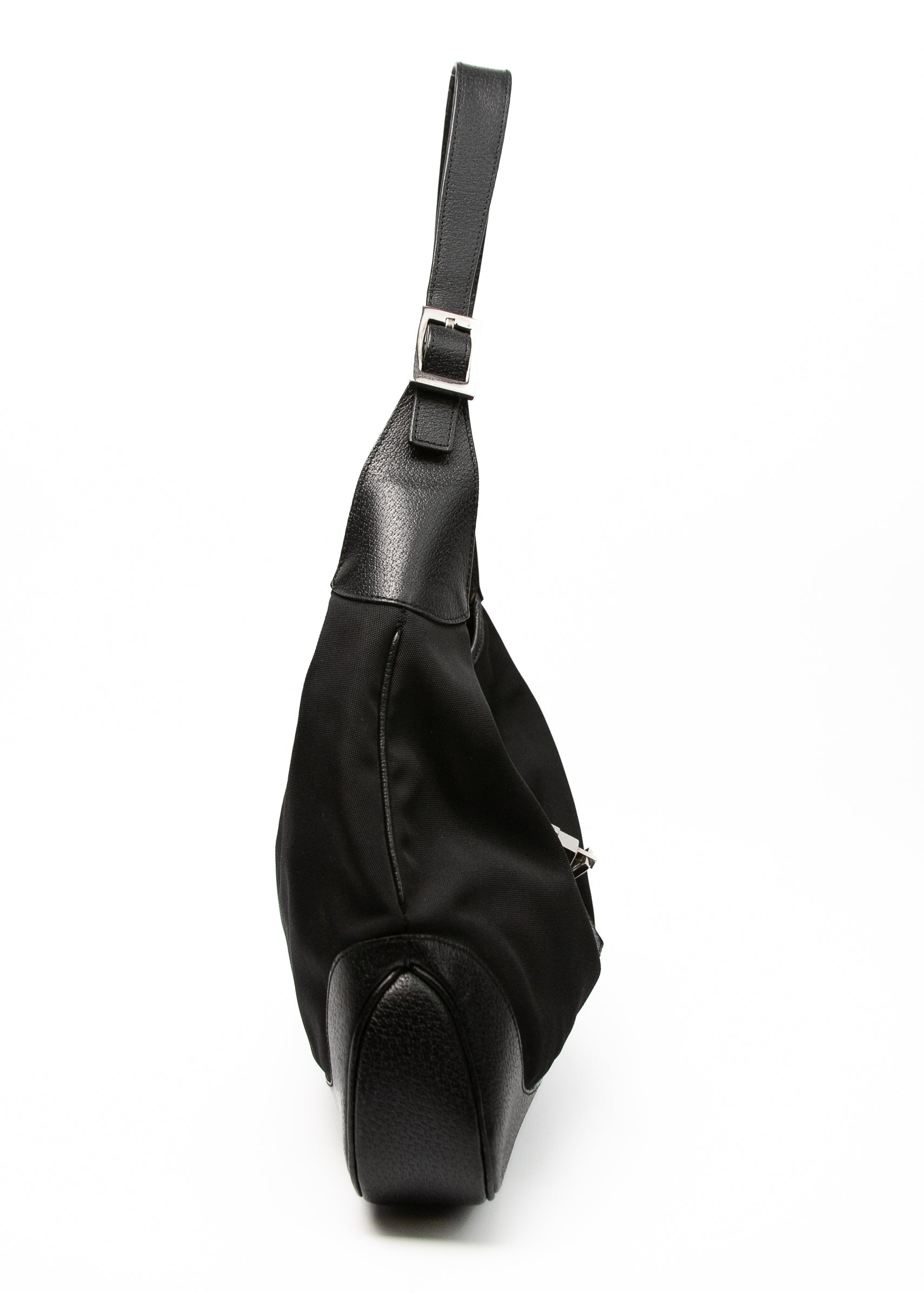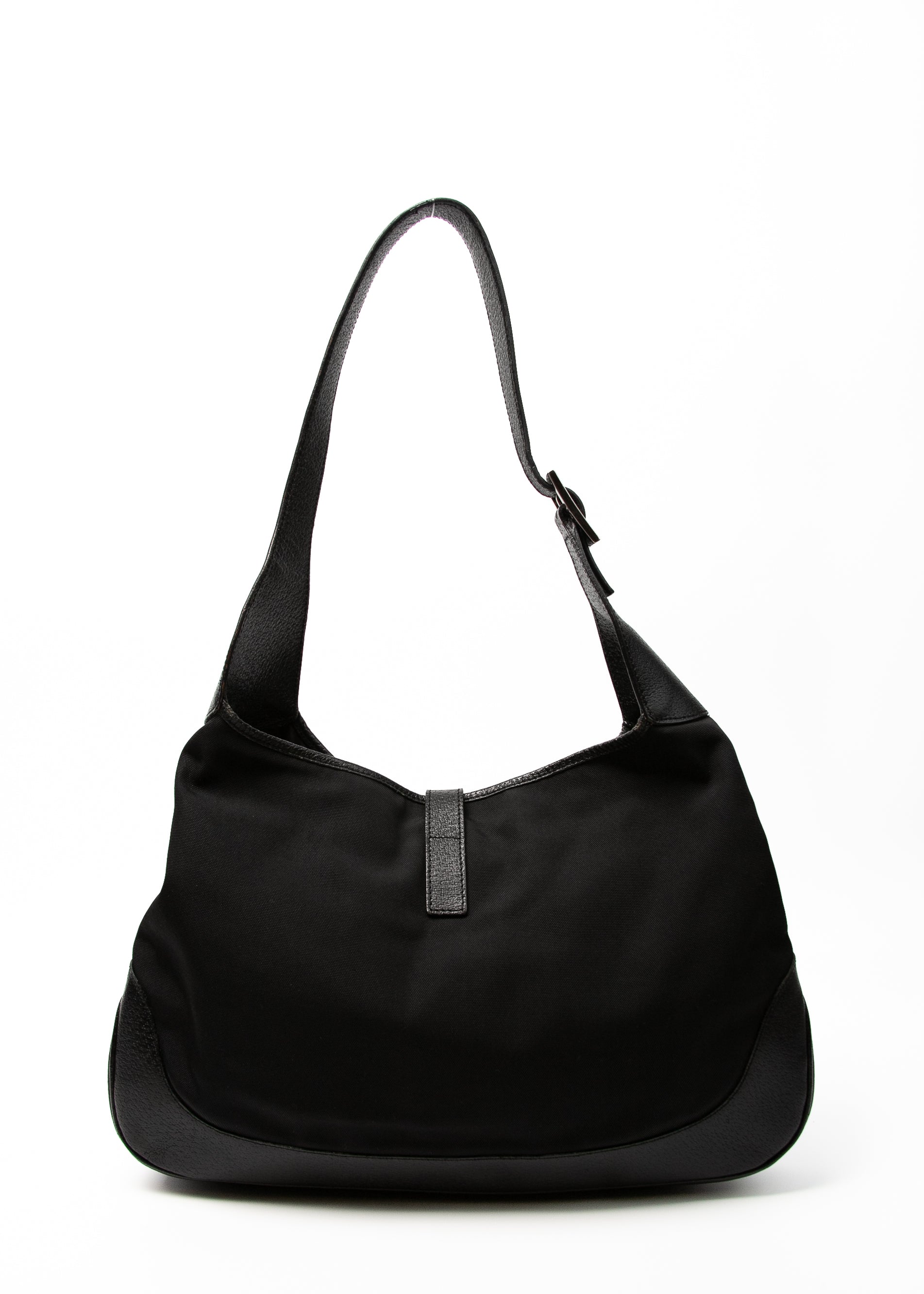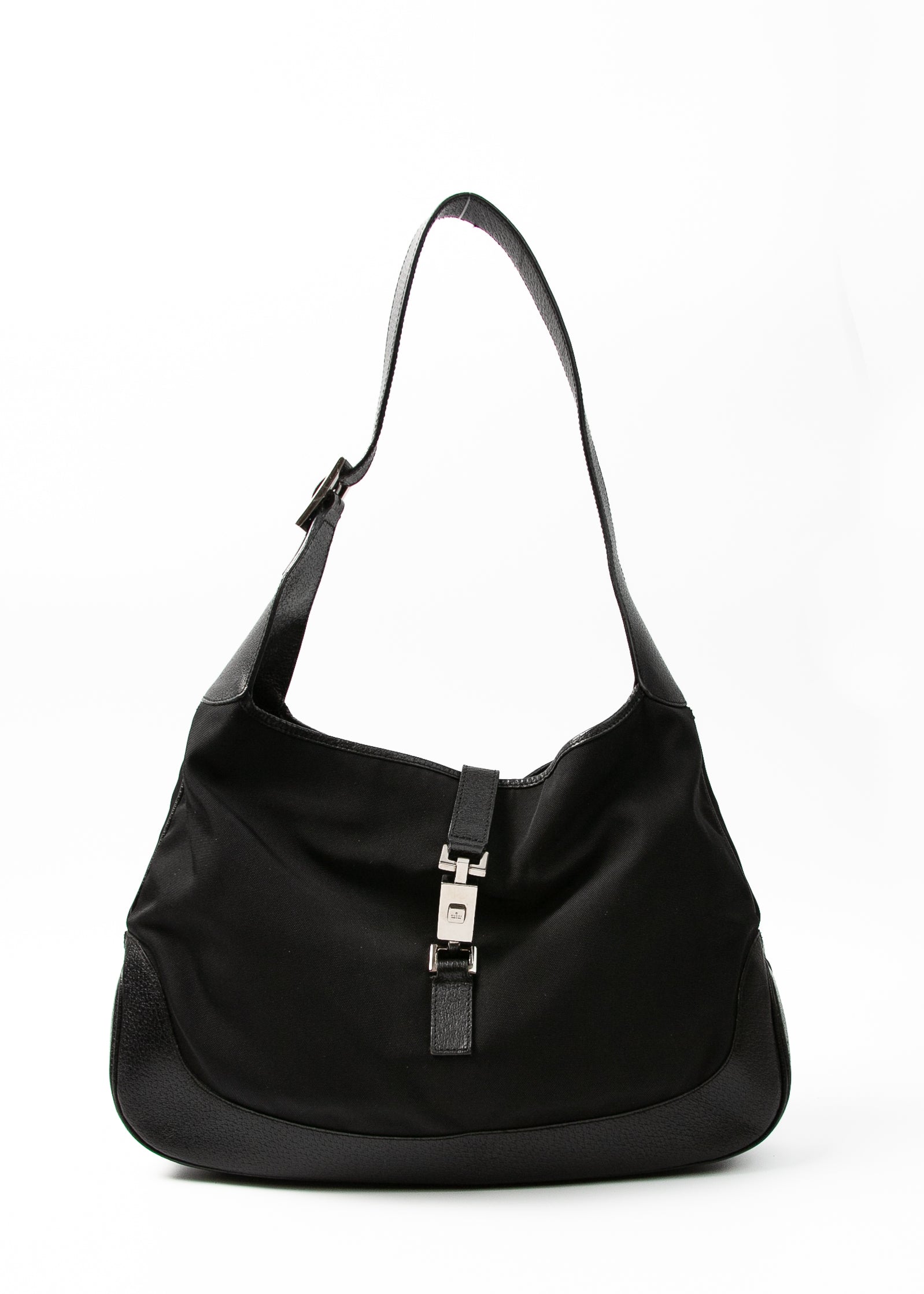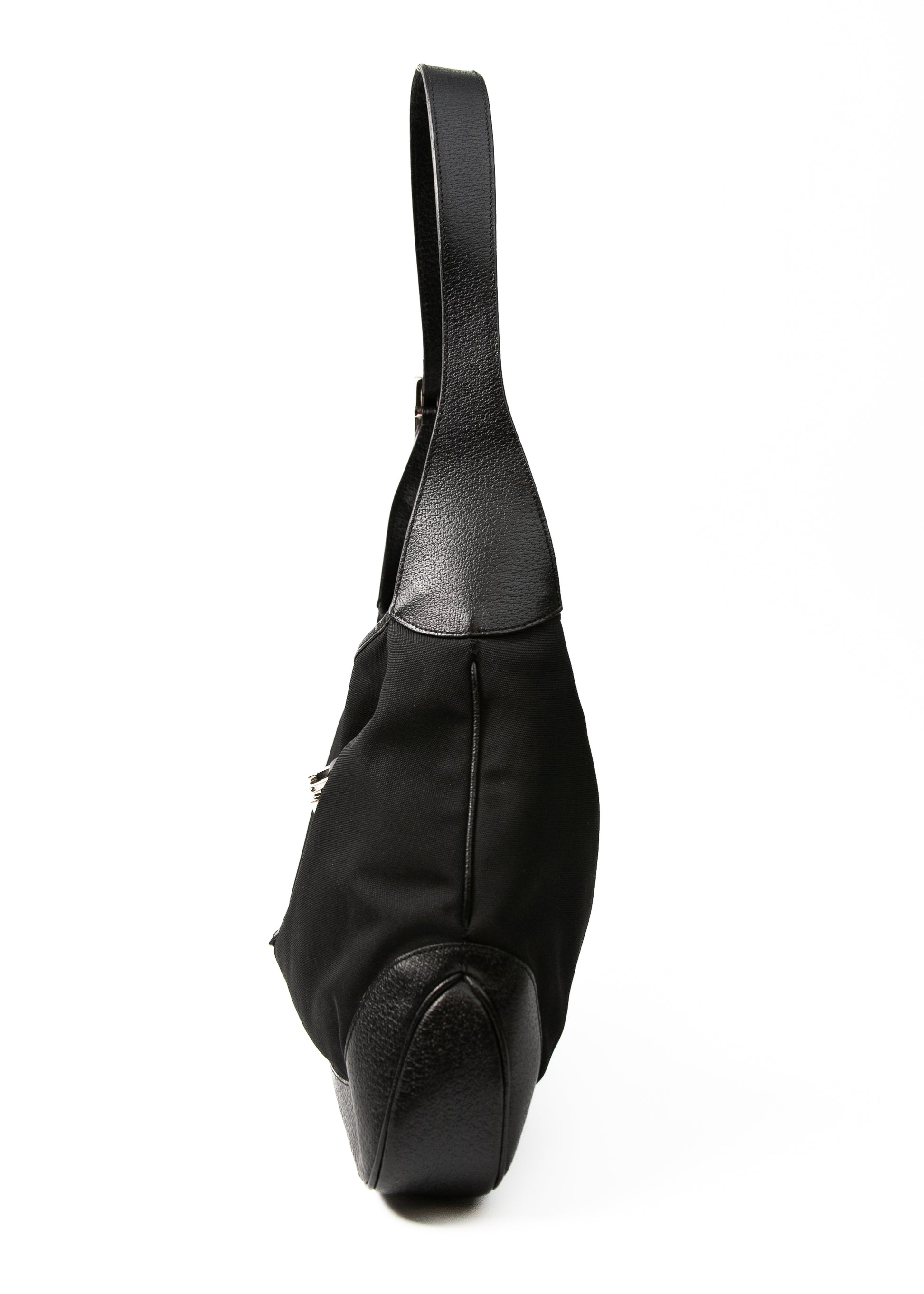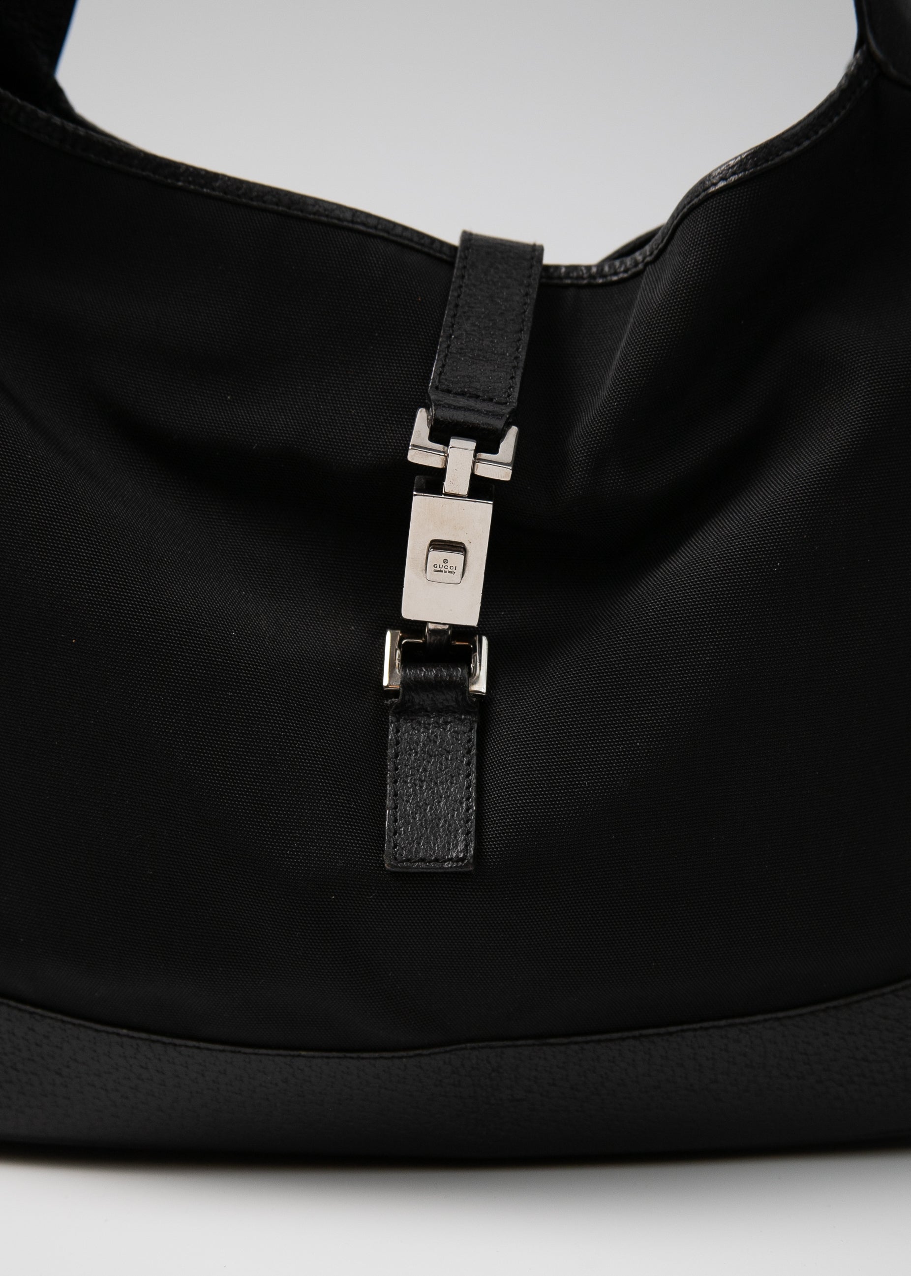 Torebka Gucci Jackie, wykonana z czarnego nylonu z wykończeniami ze skóry naturalnej. Minimalistyczna forma, charakterystyczne zapięcie typu piston lock w srebrnym metalu i prosta linia sprawiają, że to model, który pasuje do wszystkiego.