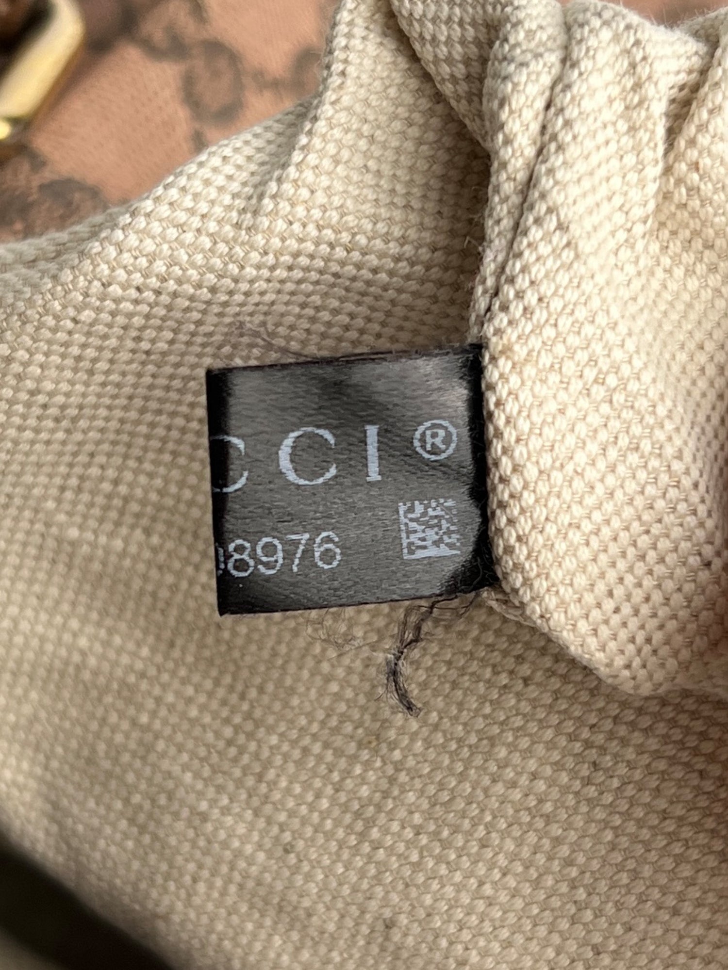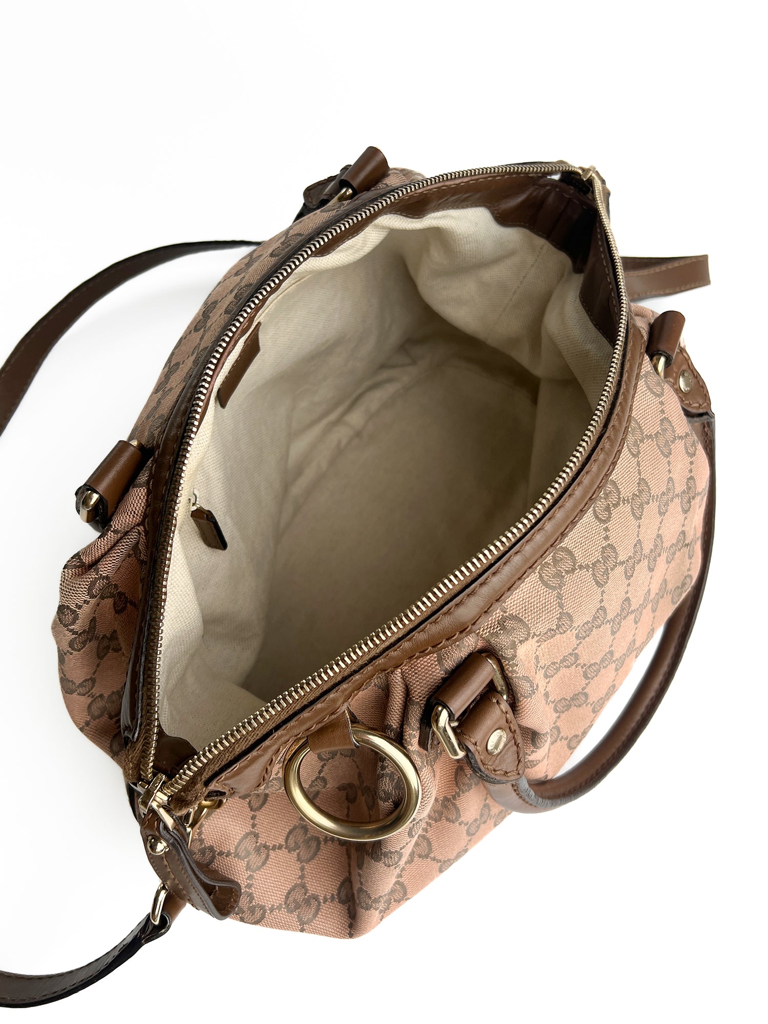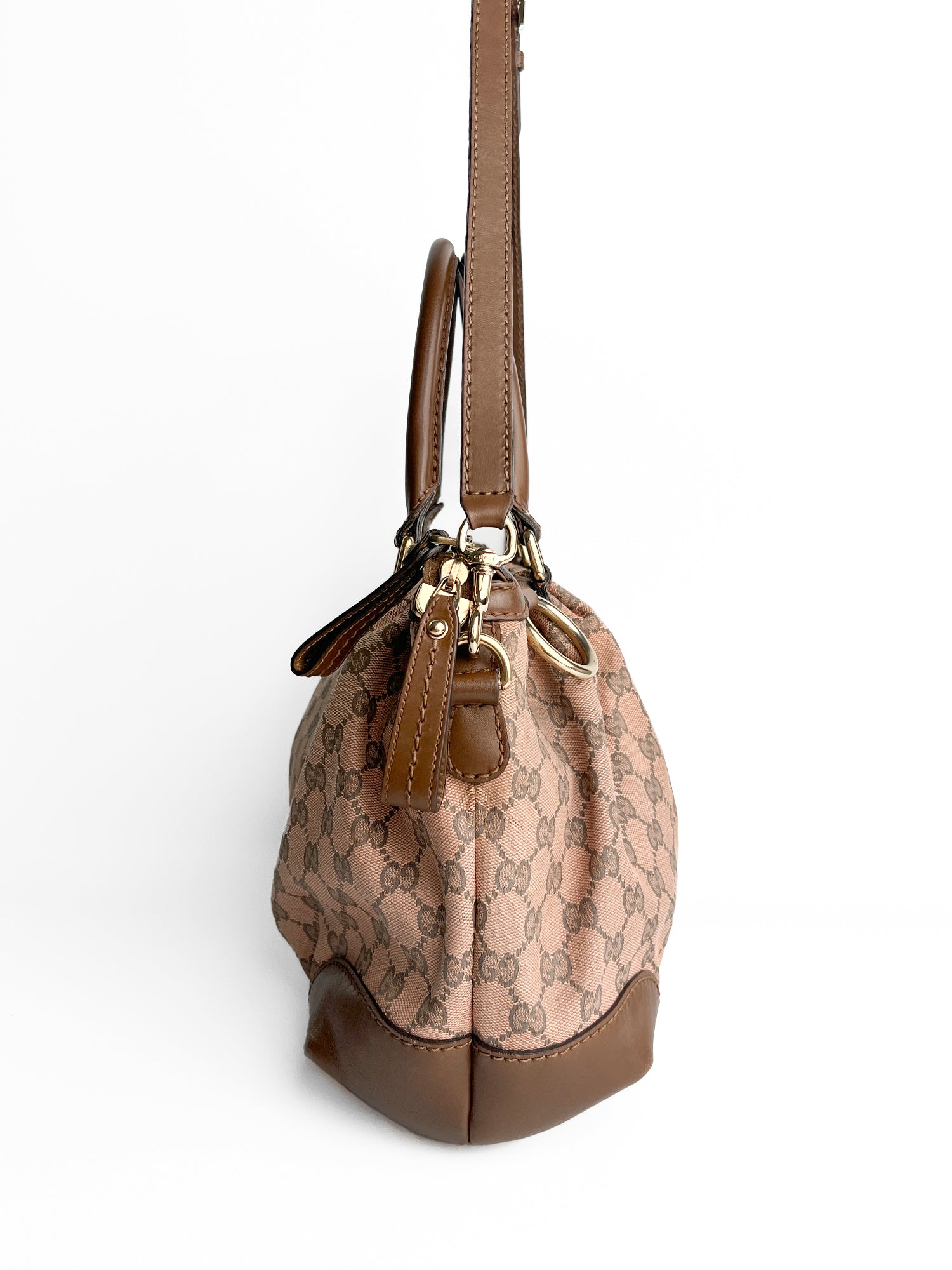 Kultowa torebka Gucci Sukey w delikatnym kolorze dust pink z charakterystycznym wzorem GG Canvas, elegancko wykończona skórzanymi detalami w kolorze brązowym.