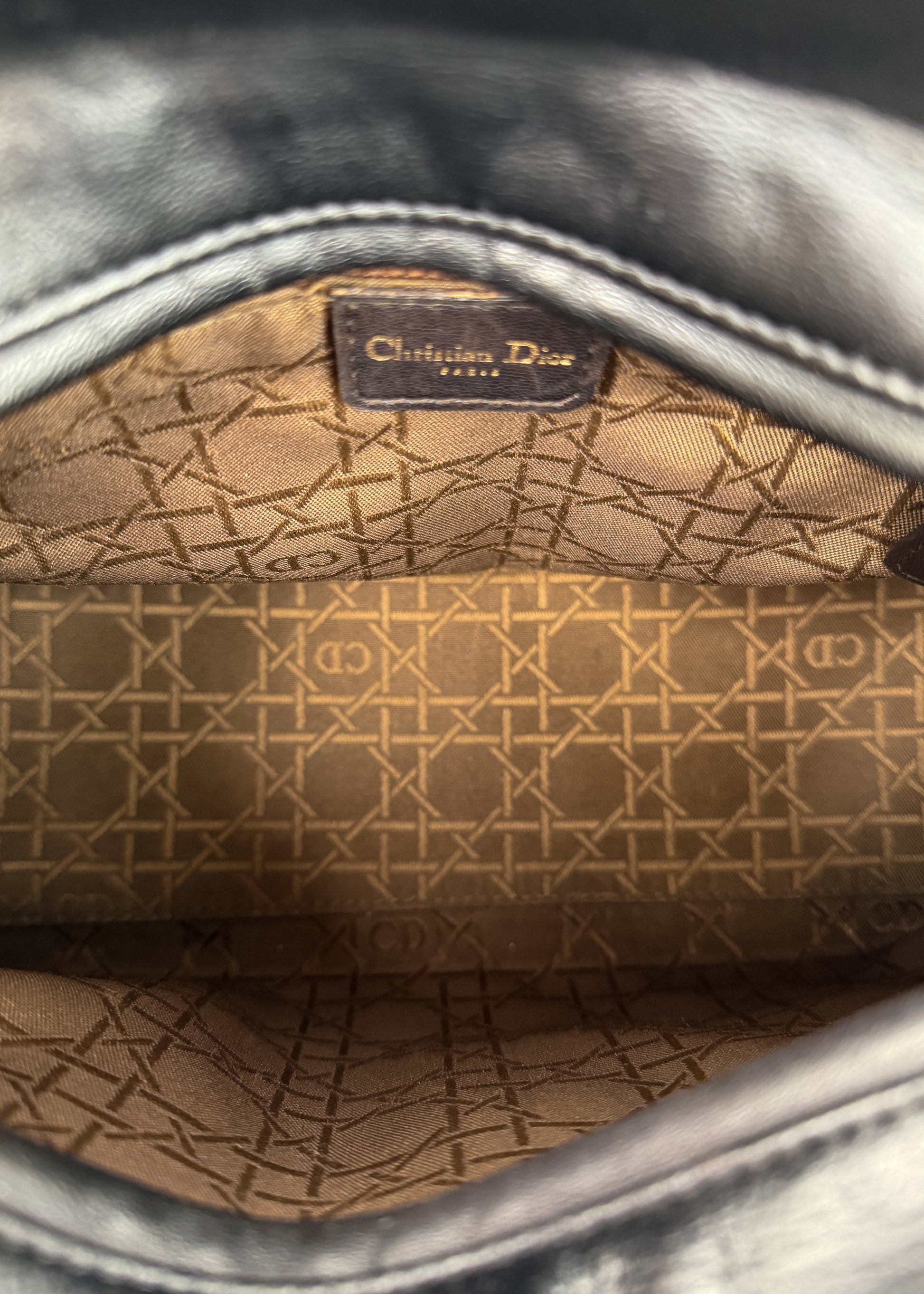 Klasyczna Lady Dior w czarnej, miękkiej skórze jagnięcej z pikowaniem Cannage — dokładnie ten model, który kojarzy się z czystą elegancją Diora z początku lat 2000. Złote okucia, kultowe literki „DIOR” i geometryczna linia.