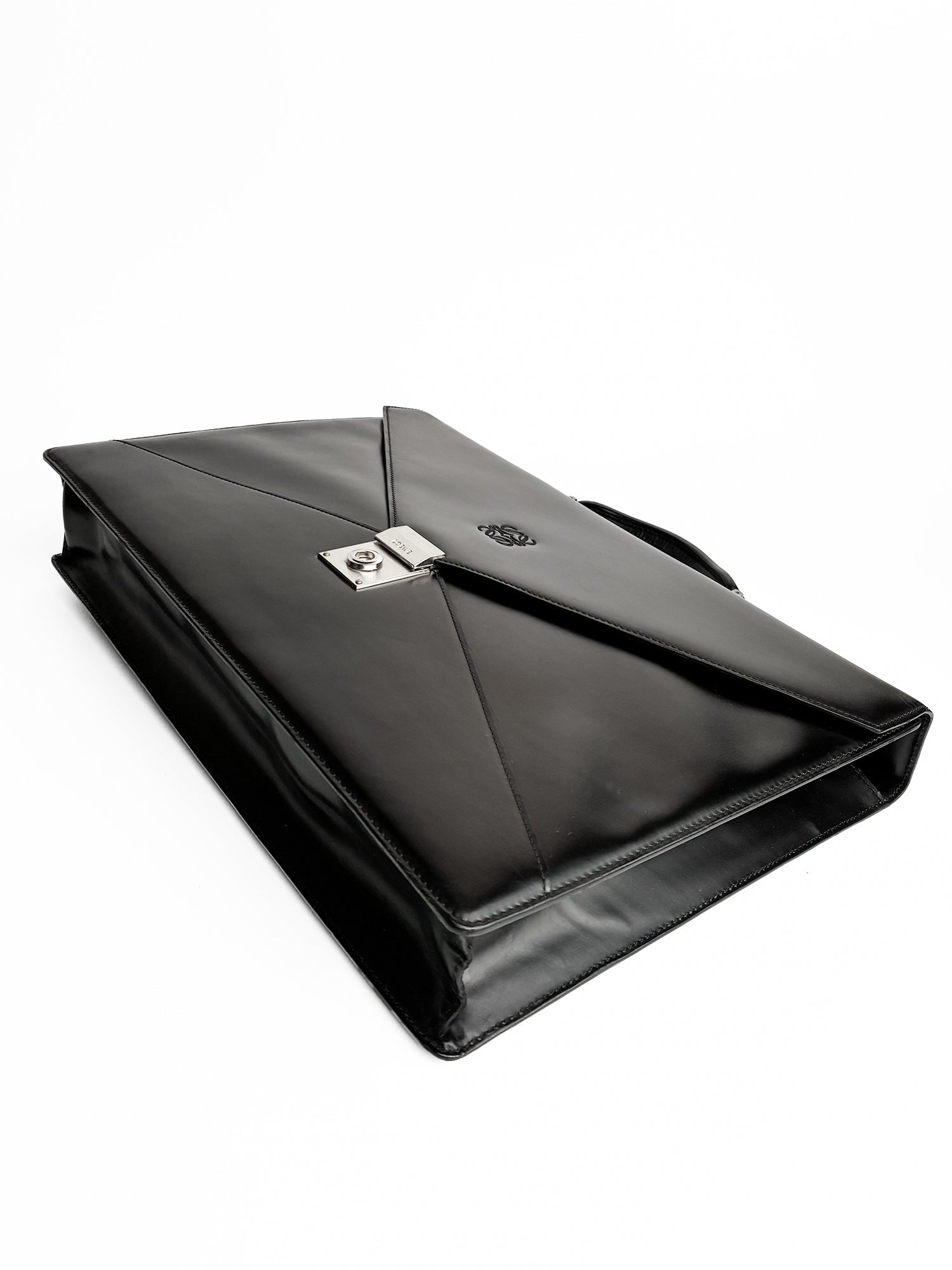 Elegancka teczka biznesowa Loewe w klasycznej czarnej kolorystyce, wykonana ze skóry naturalnej z charakterystycznym geometrycznym designem.