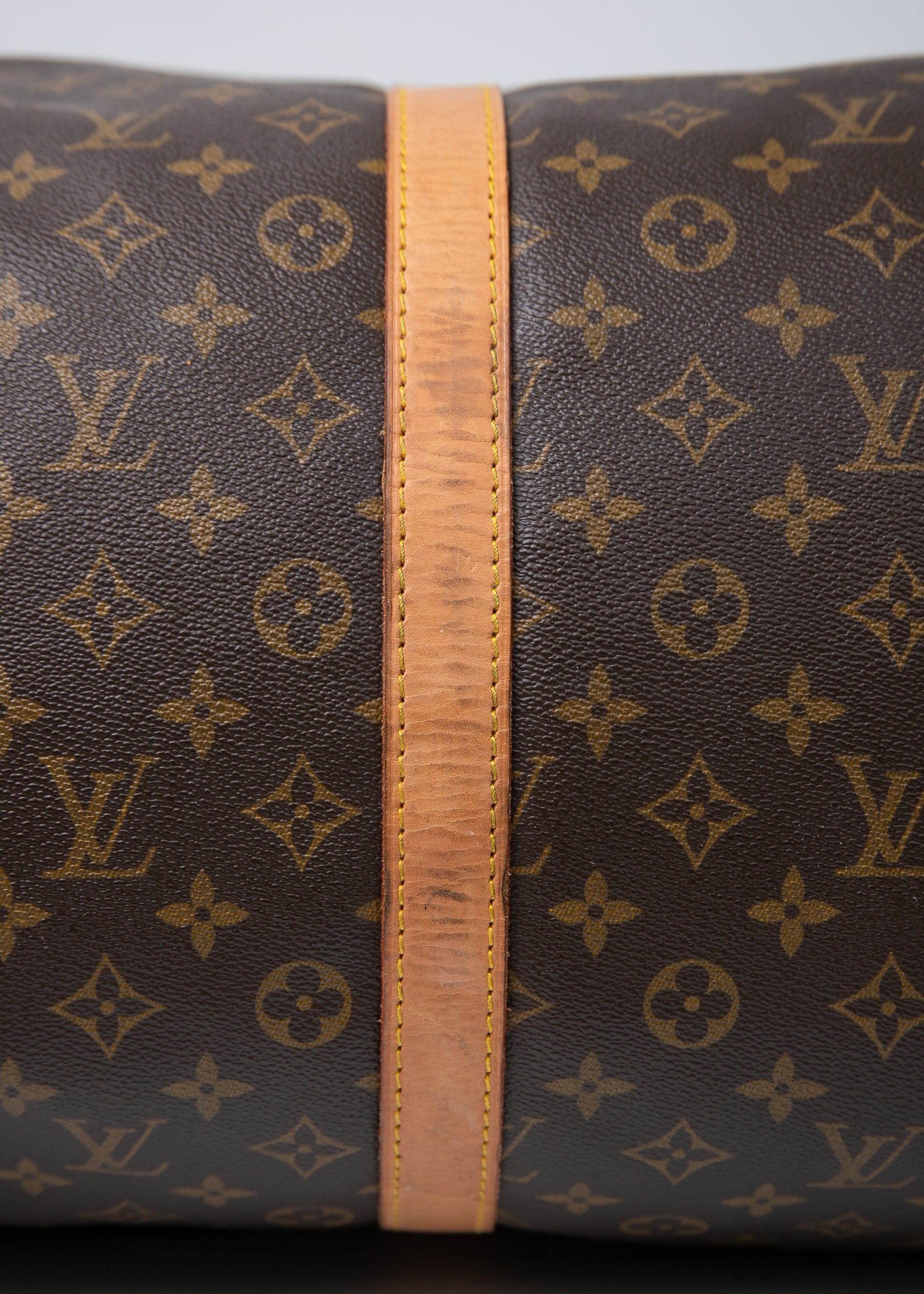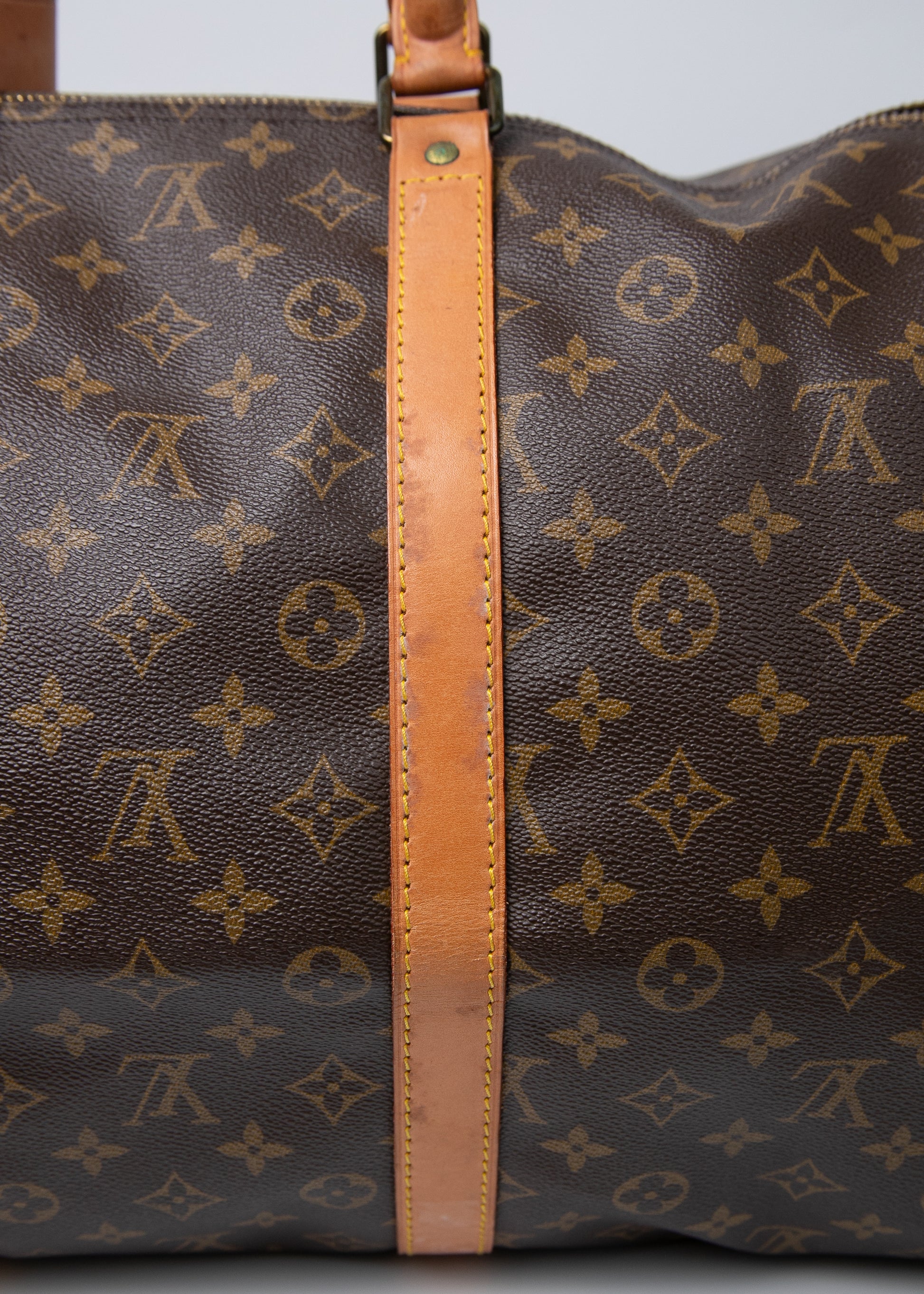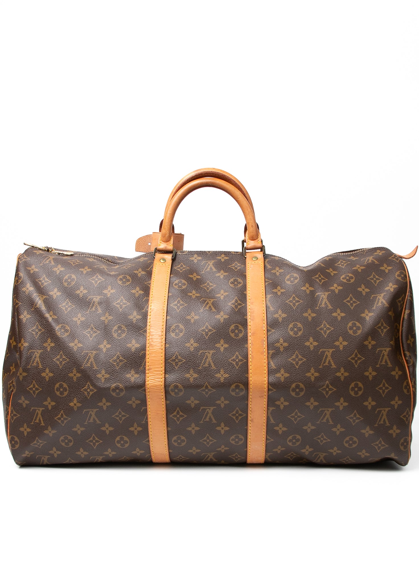 Klasyczna torba podróżna Louis Vuitton. Monogram canvas w odcieniu czekolady, naturalna skóra vachetta, klasyczny krój z lat 30., który od tego czasu praktycznie się nie zmienił. Torba jest miękka, pojemna i zawsze wygląda dobrze — nawet gdy jest wypchana po brzegi.