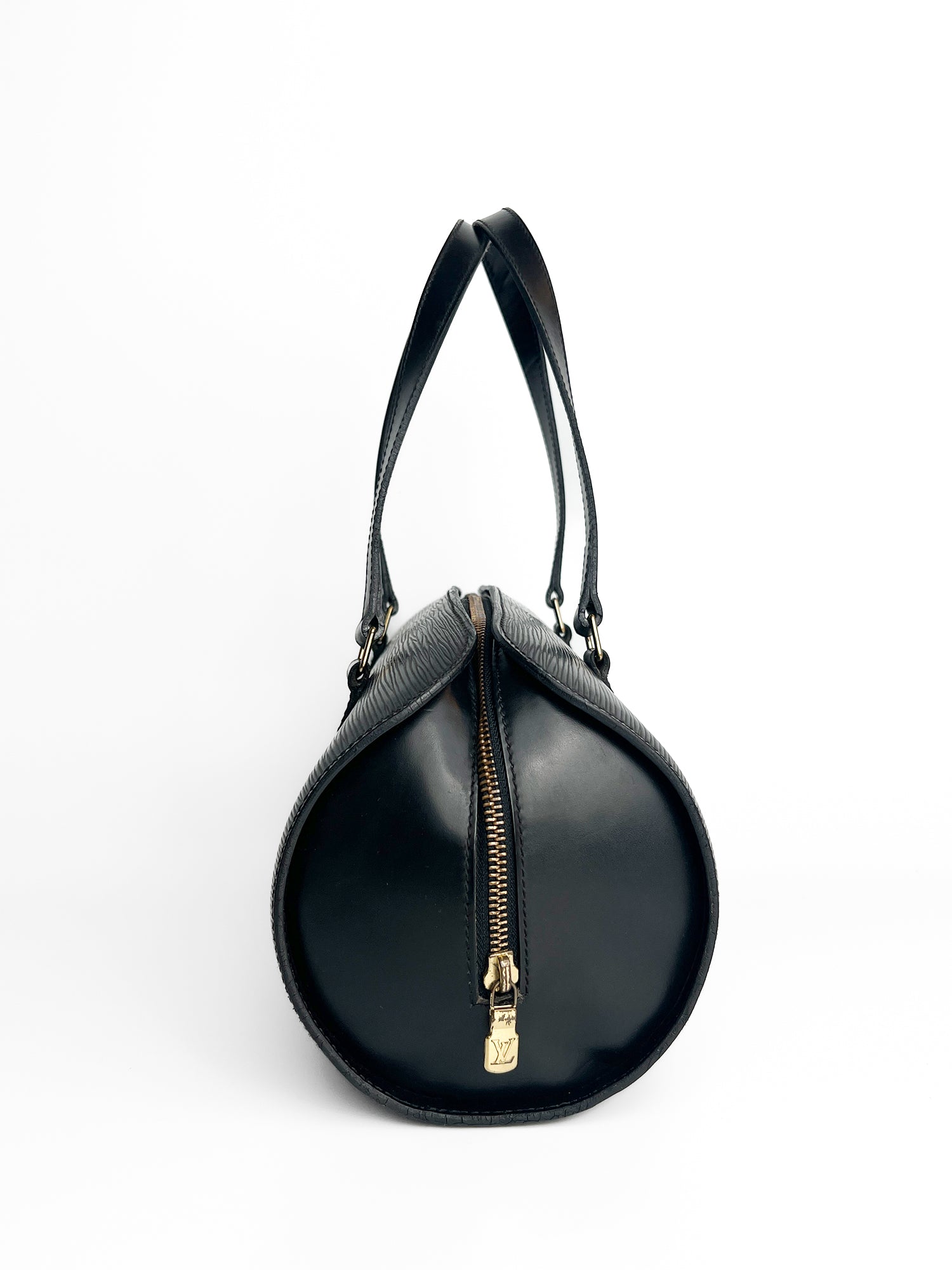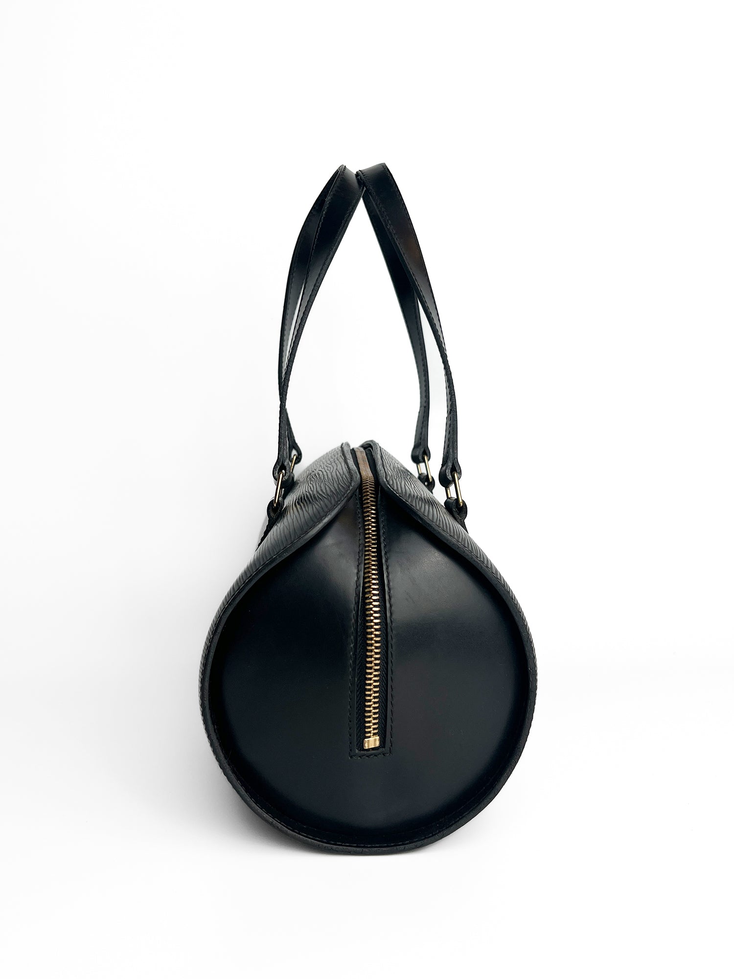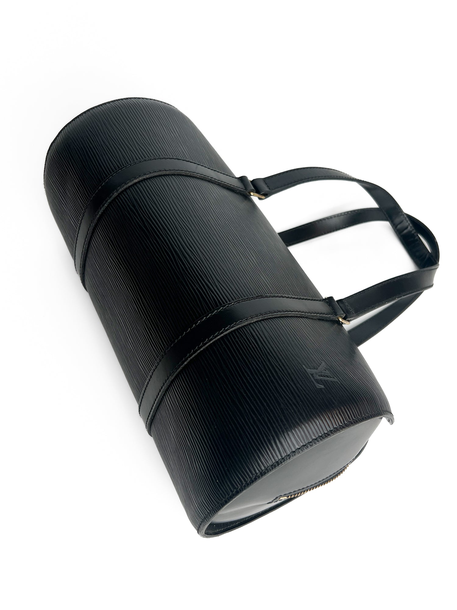 Klasyczna torebka Louis Vuitton Papillon z eleganckiej, czarnej skóry Epi o charakterystycznym, cylindrycznym kształcie.