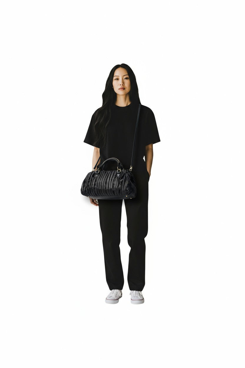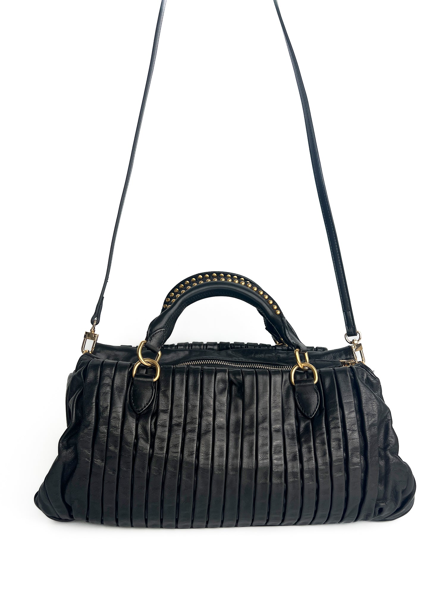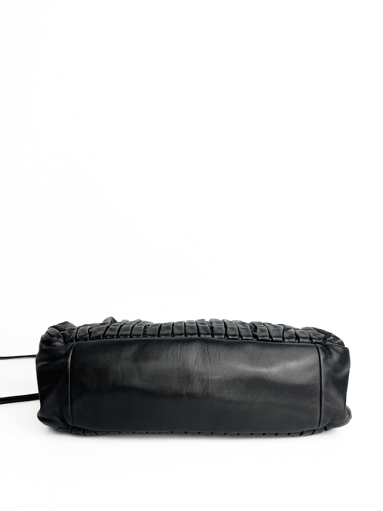 Elegancka torebka hobo Miu Miu Plisse z charakterystycznym plisowanym wzorem wykonana z miękkiej skóry jagnięcej w głębokiej czarnej kolorystyce.