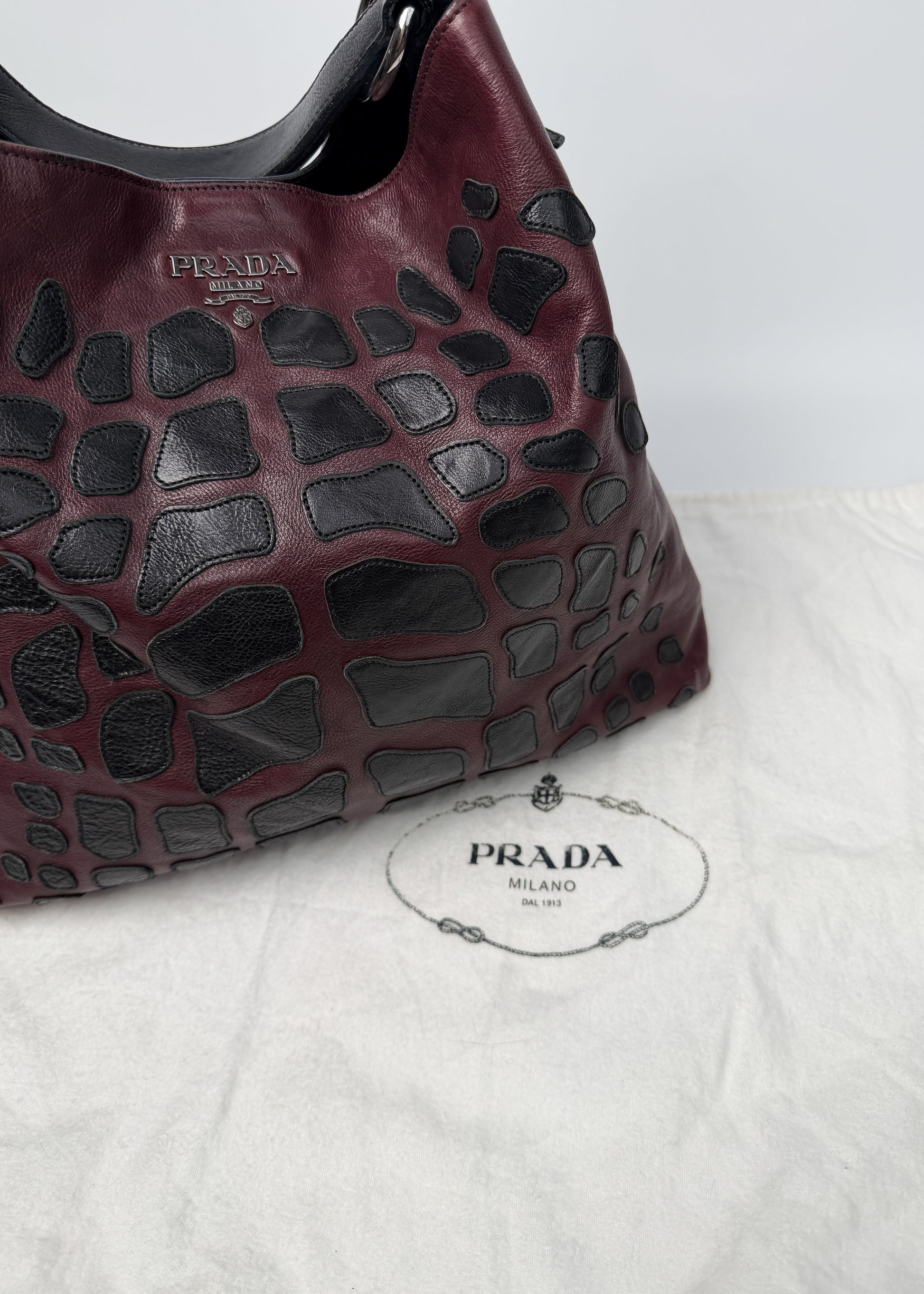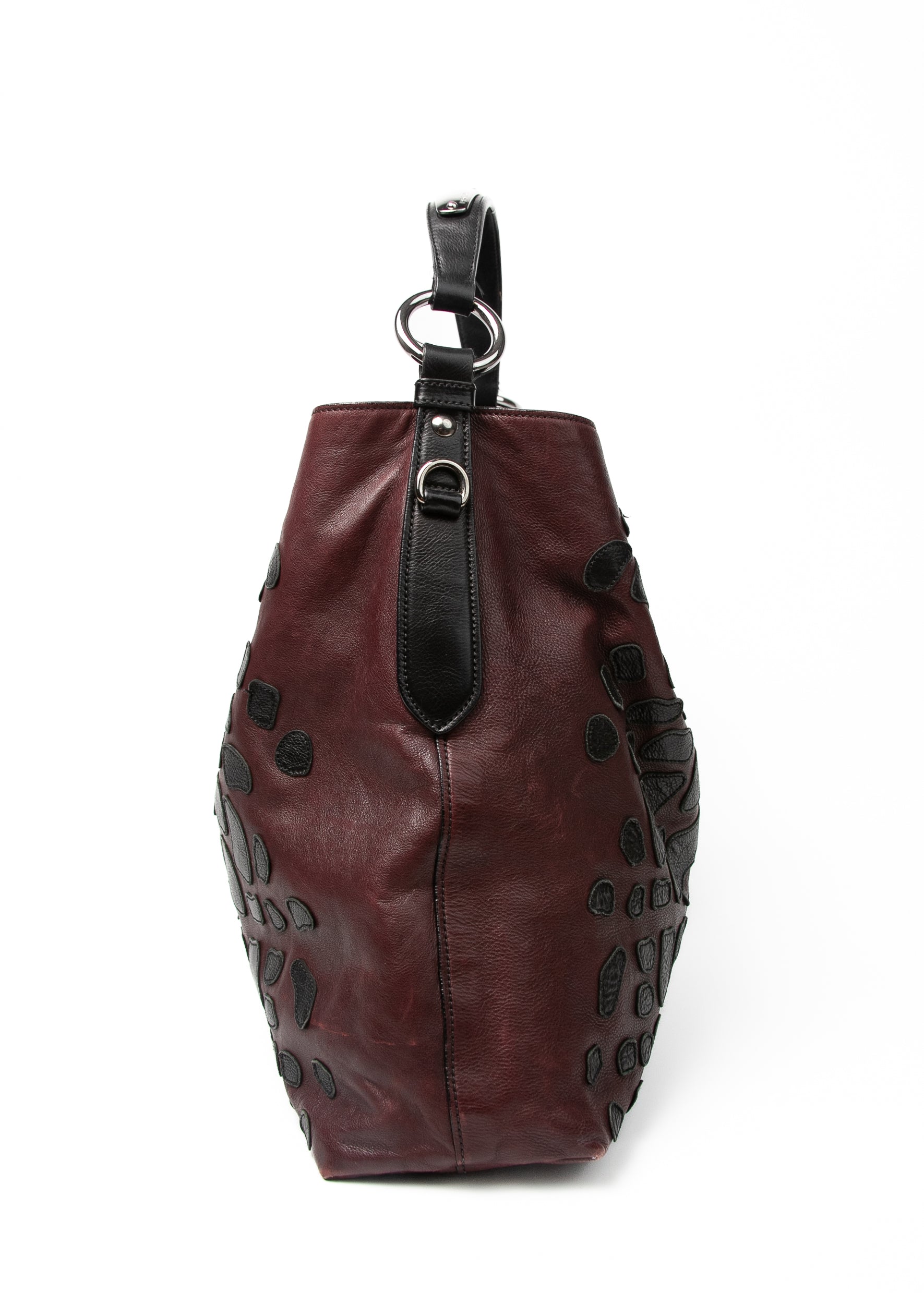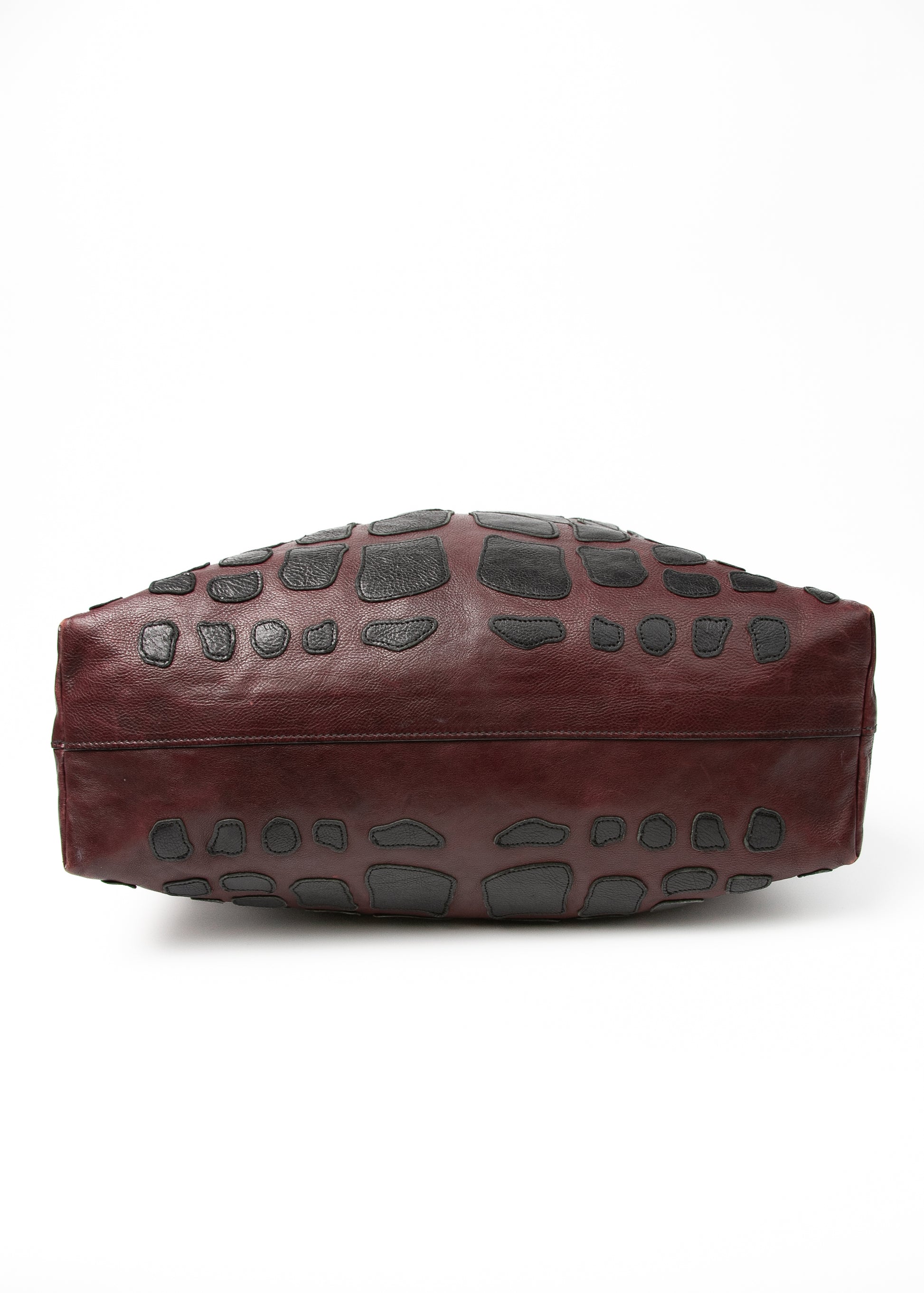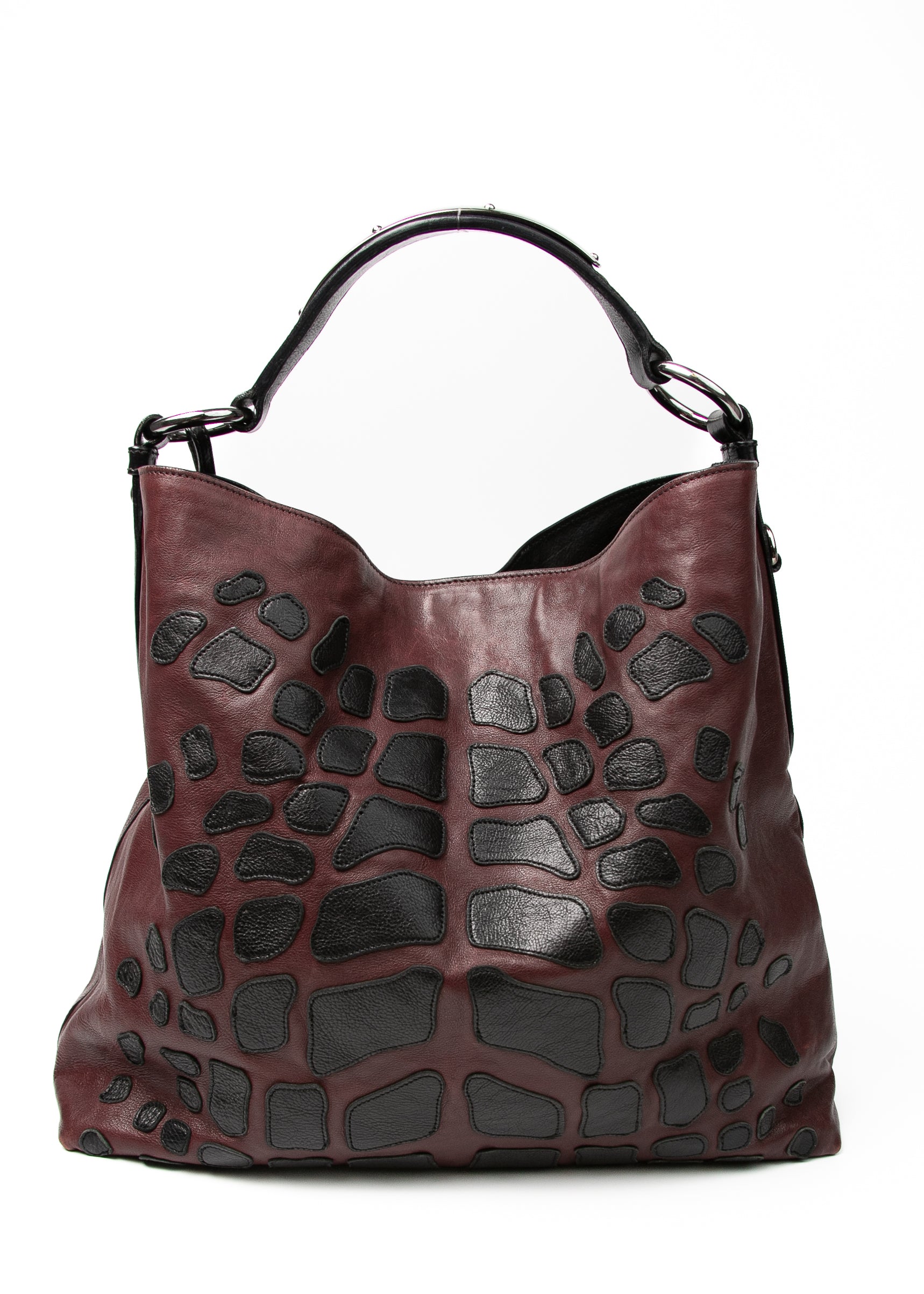 Miękka, burgundowa skóra z czarnymi, nieregularnymi aplikacjami tworzy efekt prawie rzeźbiarski — wygląda jak połączenie patchworku i struktury skóry egzotycznej. Model jest duży, miękko się układa, a przy tym nosi się go wygodnie dzięki szerokiemu paskowi na ramię.