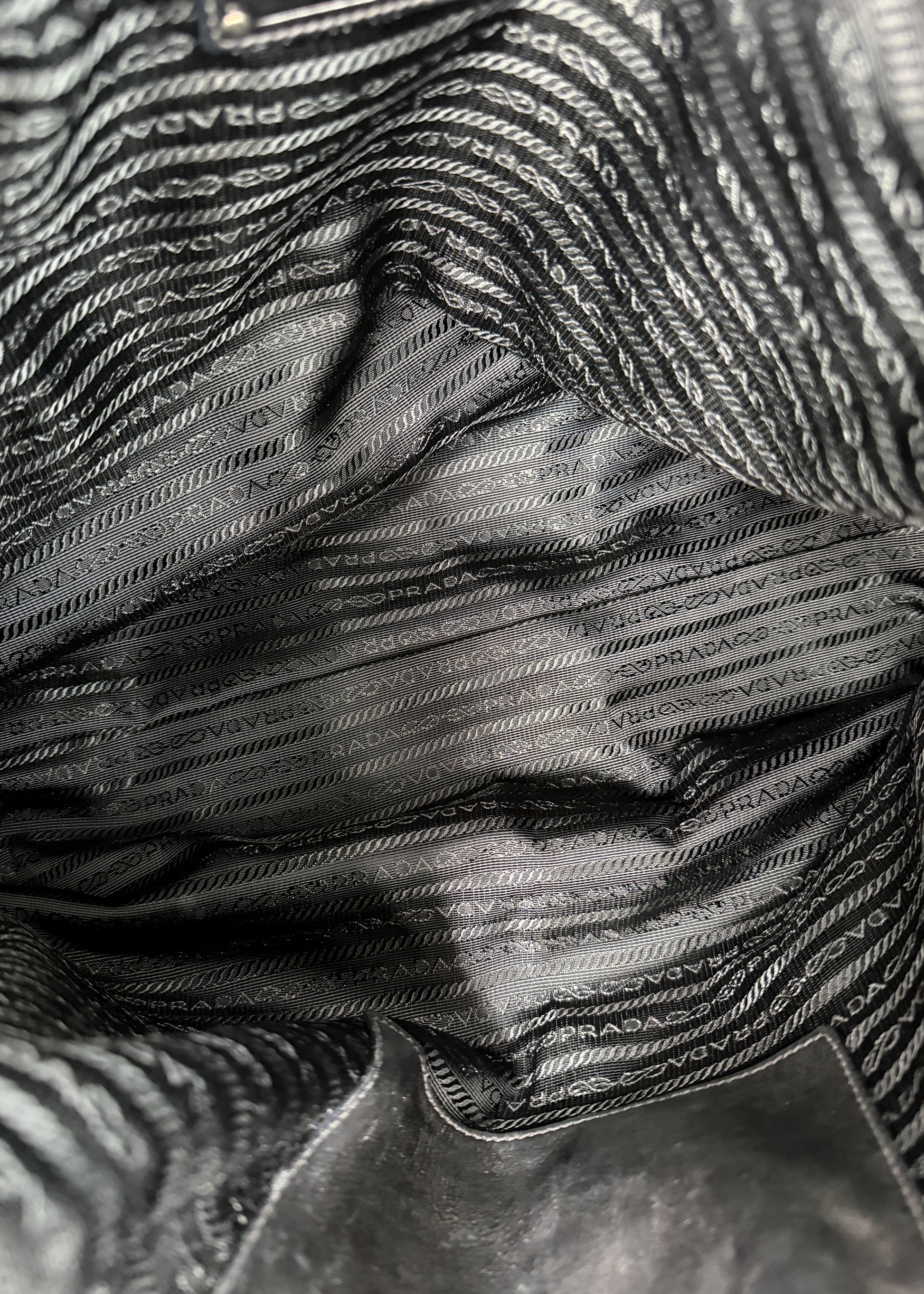 • Wnętrze: czarna podszewka z logotypem (klasyczny żakard Prada)